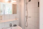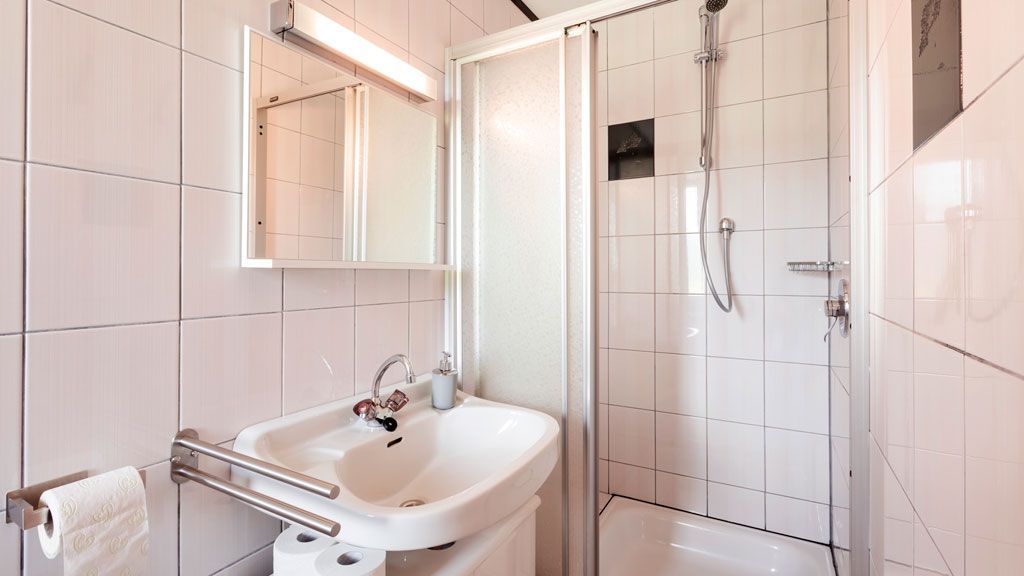 Kleines Badezimmer mit Milchglas-Schiebetür vom Raum getrennt