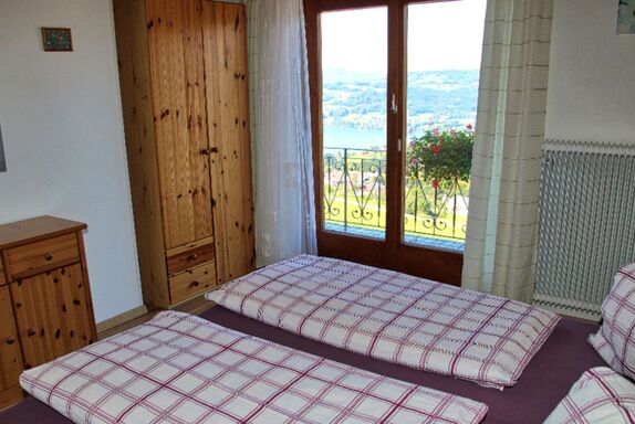 Ferienwohnung für 2 Erwachsene und ein Kind mit Schlafzimmer, Ausziehcouch, Bad und Wohnküche. Vom Balkon traumhafter Blick über Berge und Attersee.