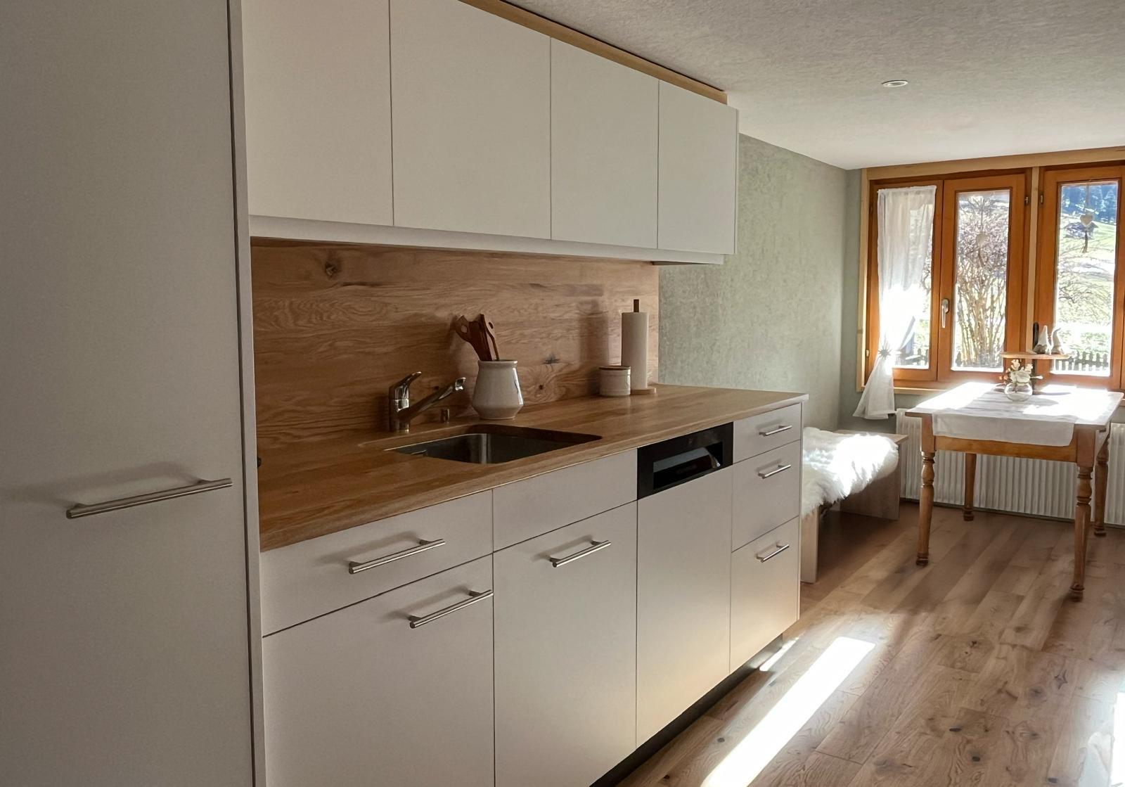 Von der überdachten Terrasse geniessen Sie die Bergsicht. Die Küche ist mit Backofen, Geschirrspüler und Nespresso-Maschine ausgestattet. Im Wohnzimmer finden Sie eine Sitzecke, Sitzofen, TV, Radio. WLAN vorhanden. Das Schlafzimmer verfügt über ein Doppelbett und das Badezimmer bietet Badewanne, Dusche und WC.