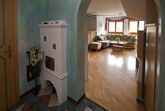mit Dusche, Whirlpool-Badewanne, extra WC, Kachelofen sowie Balkon,