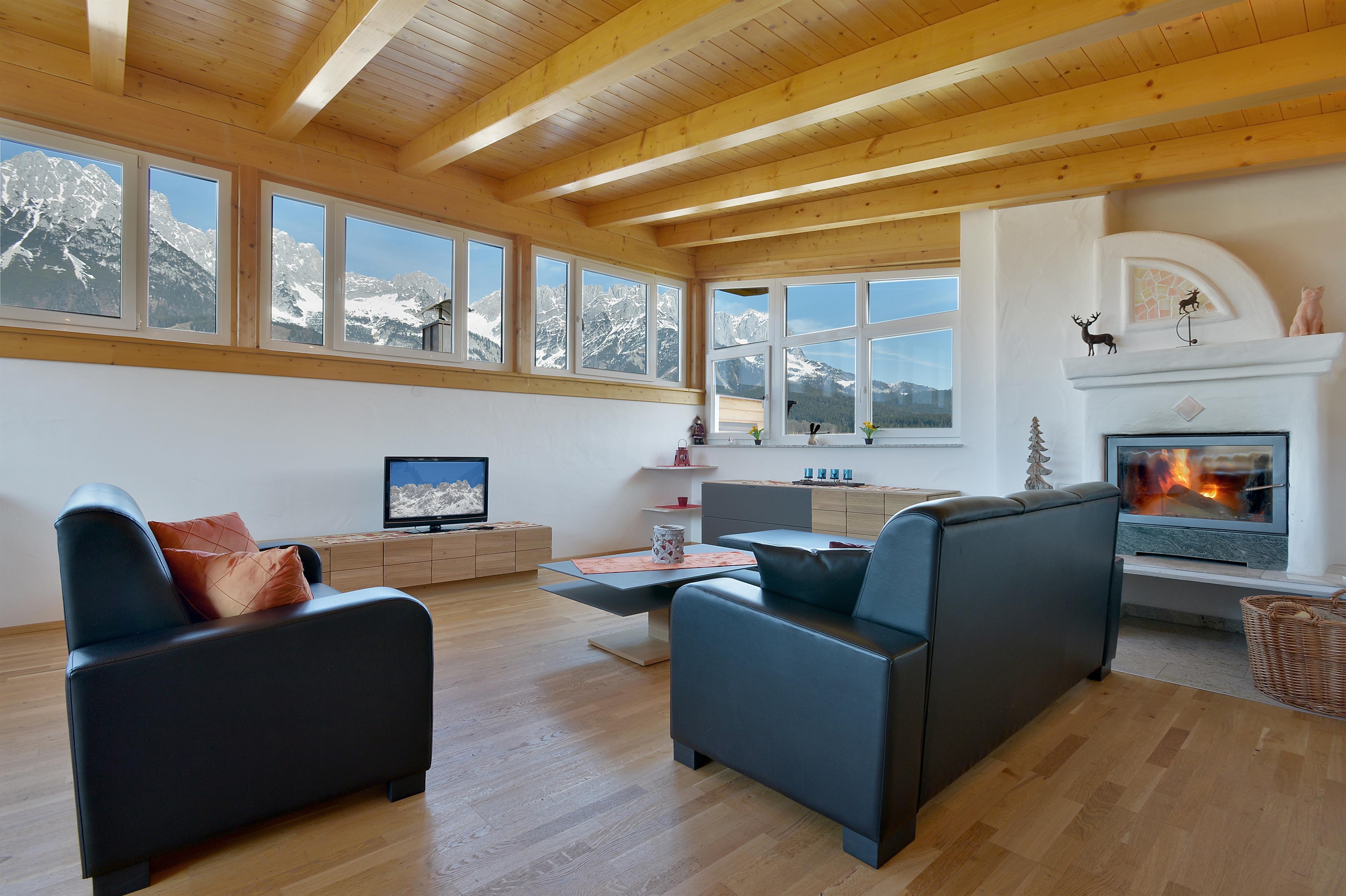 Jedes unserer beiden Häuser ist hochexklusiv ausgestattet und ganz neu erbaut. Im Erdgeschoss befindet sich ein Schlafzimmer mit eigenem Bad mit Badewanne und WC und Bidet, ein separates WC, eine Küche mit Mikrowellenherd, Ceranfeld, Backofen, Geschirrspüler, Kaffeemaschine und Wasserkocher. Im Souterrain ist das 2. Schlafzimmer auch mit eigenem Badezimmer mit Dusche und WC. Und auf der offenen Galerie befindet sich noch ein Doppelbett und gegenüber ein Wohnraum mit offenen Kamin und Flat TV. W-Lan ist vorhanden. Gerne stellen wir Ihnen natürlich auch einen Hochstuhl und Kinderbetten zur Verfügung. Genießen Sie Ihren Urlaub mit dem herrlichen Blick durch unsere Panoramafenster auf den Wilden Kaiser.