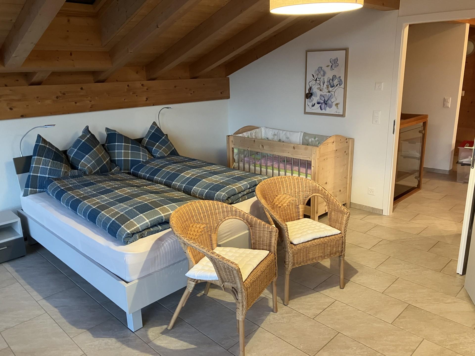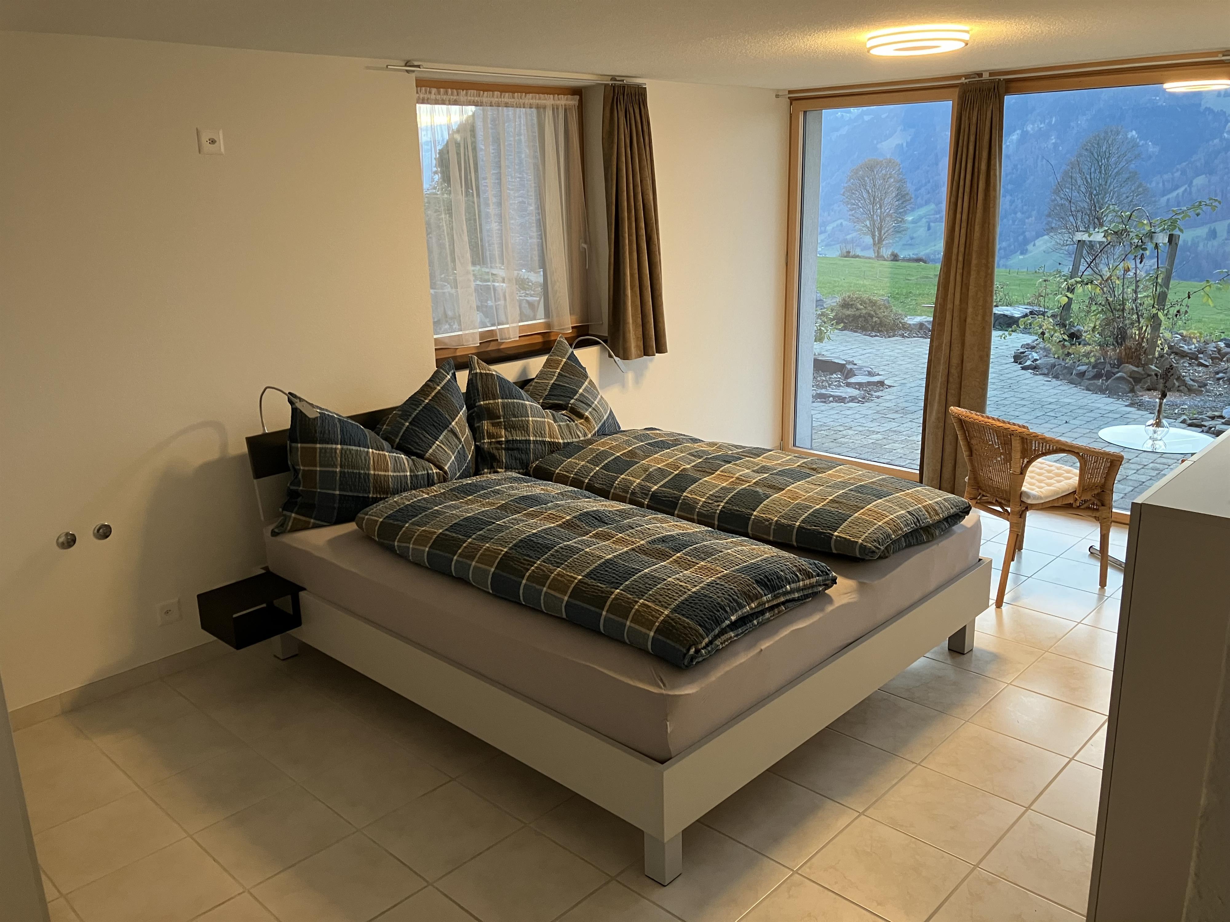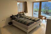 Parterre: Grosses Schlafzimmer mit Doppelbett, geräumige Schränke, Badezimmer mit Einzellavabo, Dusche, WC. Schlafzimmer mit Terrassentüre mit direktem Zugang zum Garten. Kinderzimmer mit 3 Betten, zusätzlich offenes Zimmer mit Lesebereich und Spielecke für Kinder, diverse Spiele vorhanden. Alle Zimmer im Parterre mit eigenem, direktem Gartenzugang.