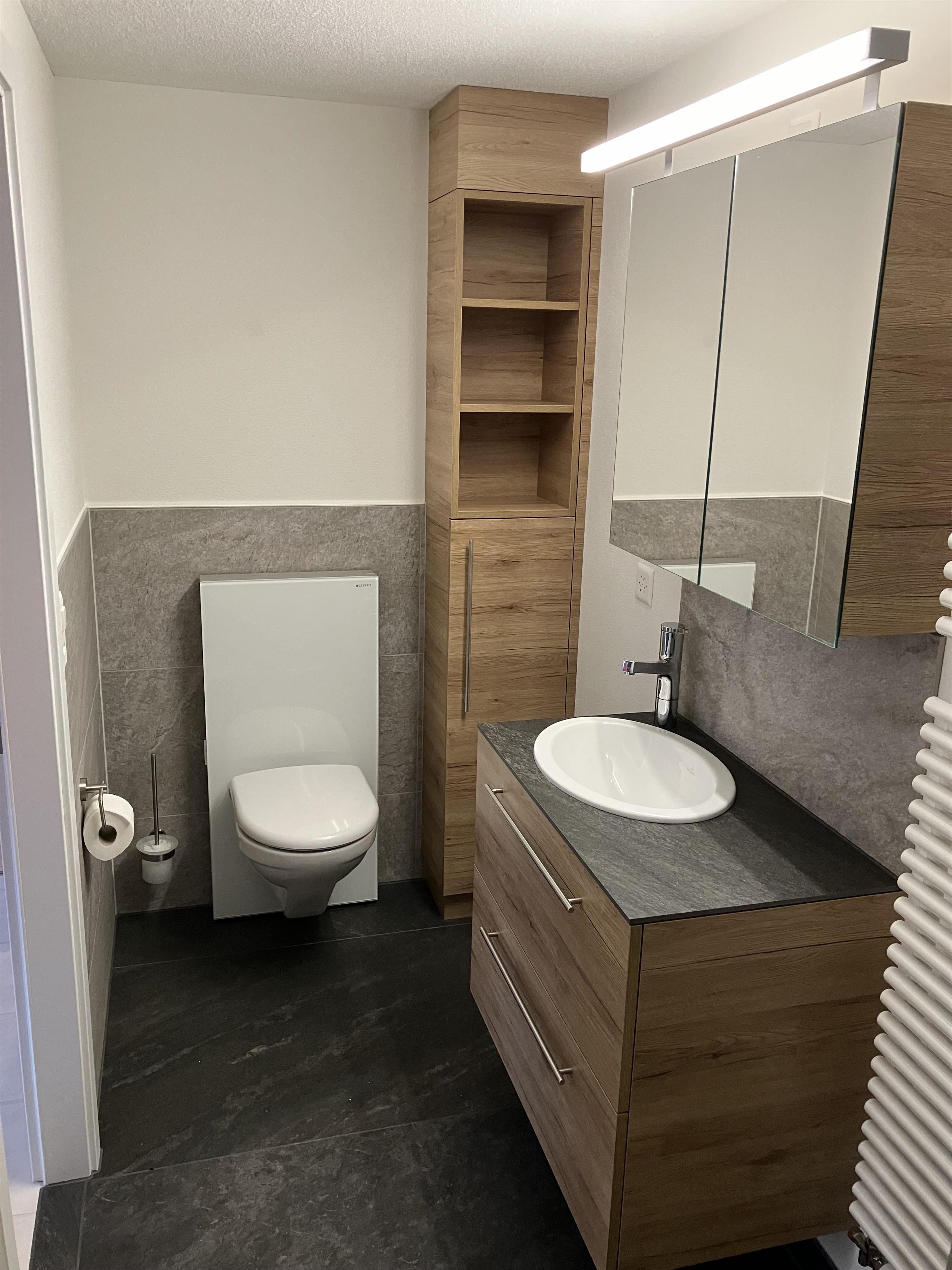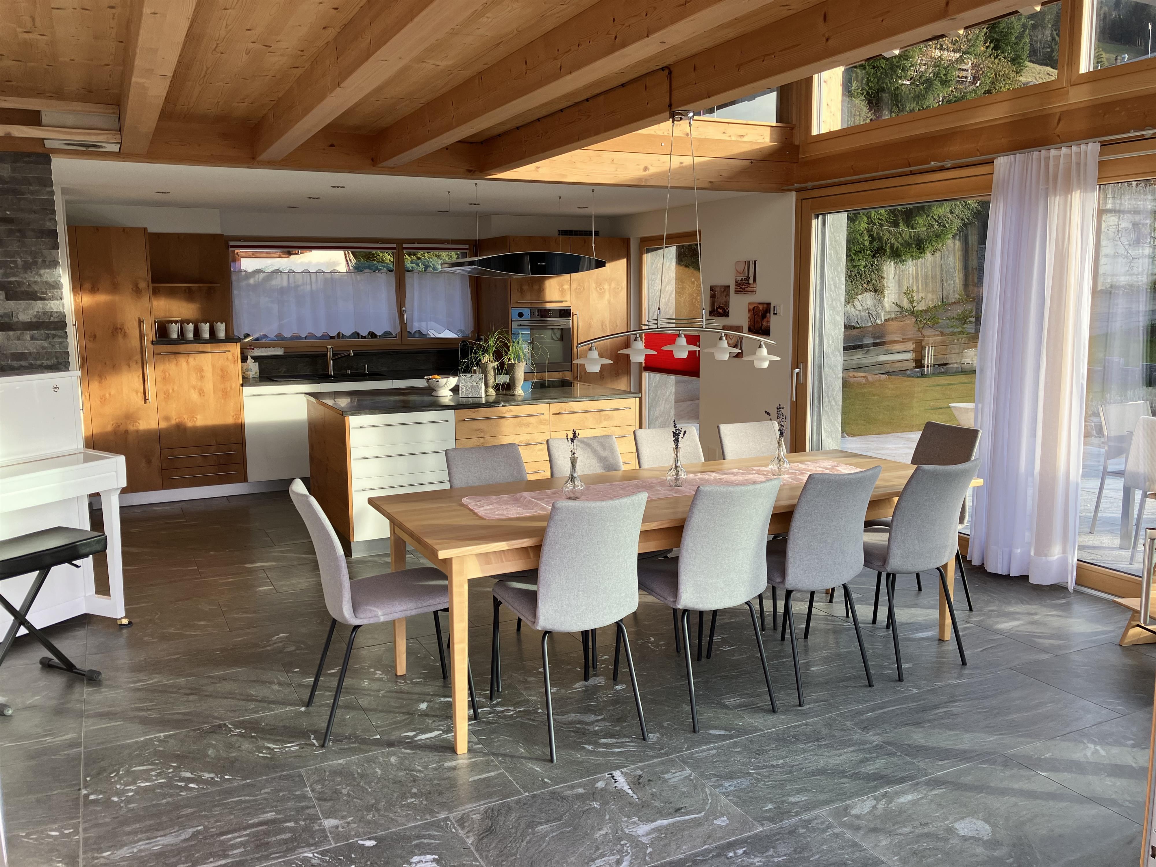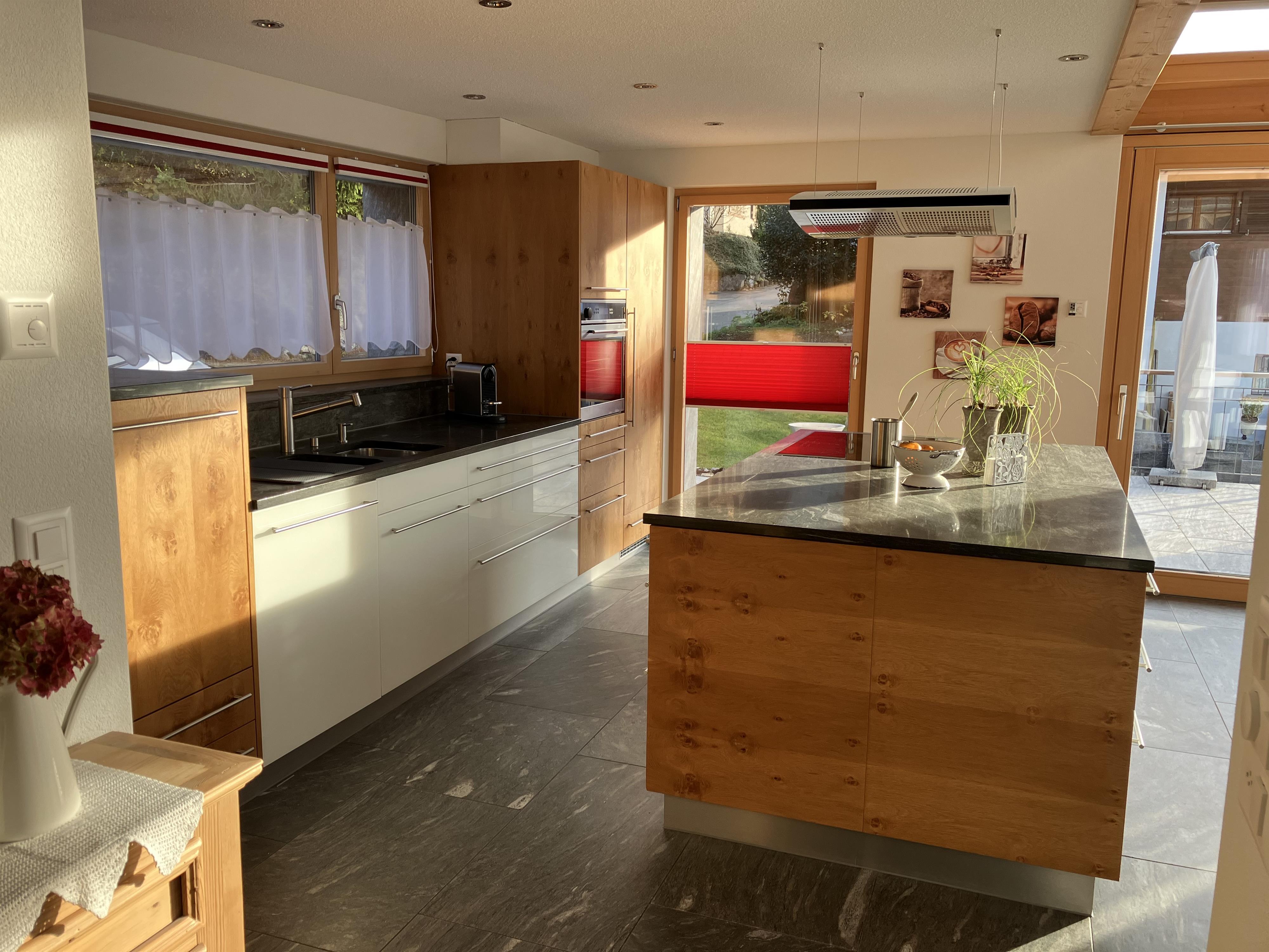 Erdgeschoss: Grosses Wohn-/Esszimmer mit Zugang zu Terrasse, Balkon und Garten. Grosse, moderne, helle Küche mit modernen Geräten, Induktions-Kochfeld, Backofen mit Steamfunktion, Geschirrspüler, grosser, geräumiger Kühlschrank, usw. Separates Tages-WC im Erdgeschoss.