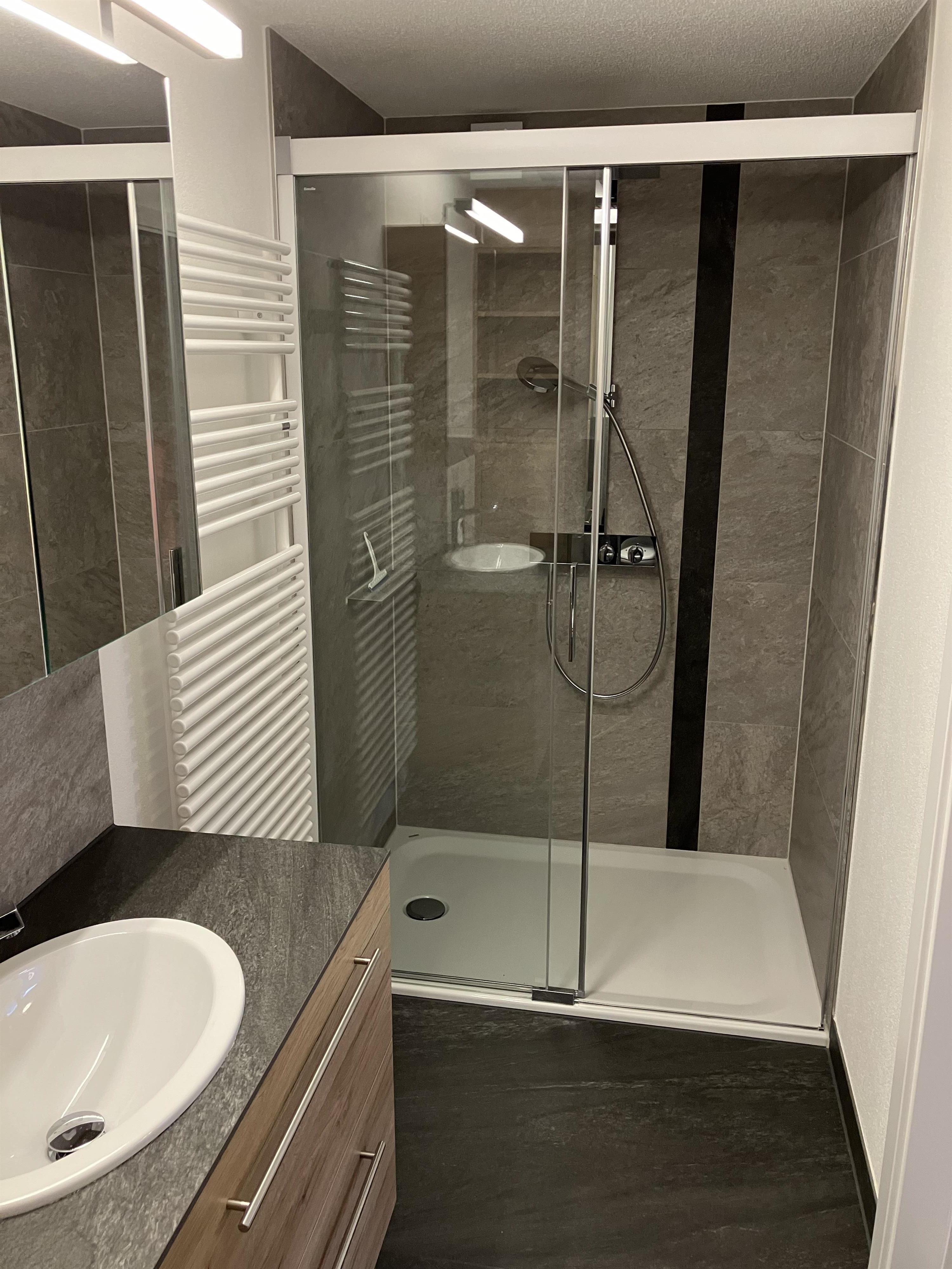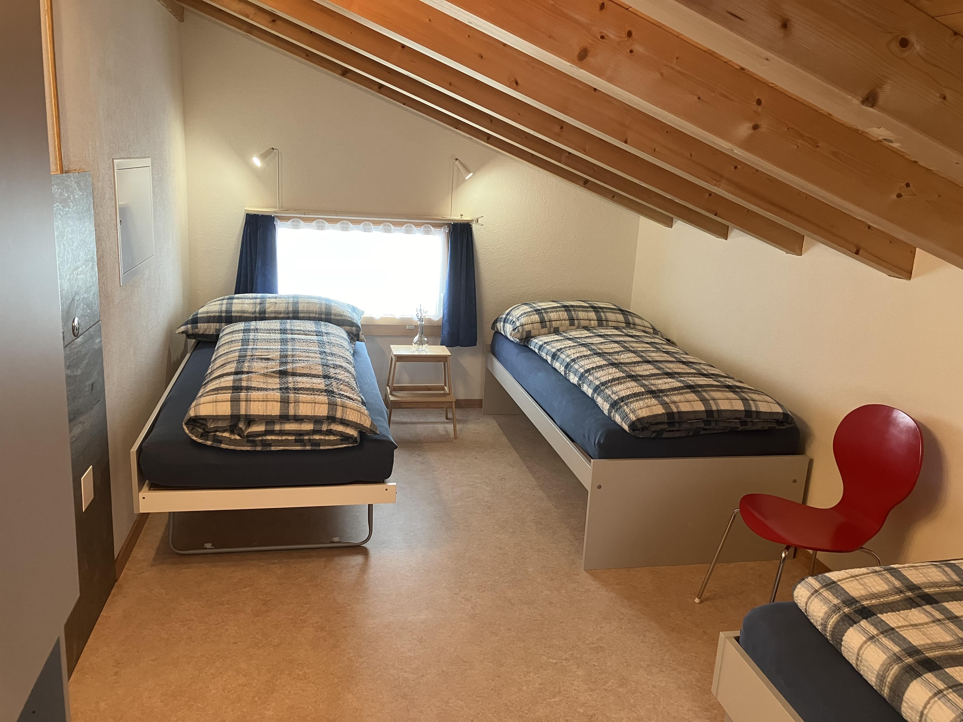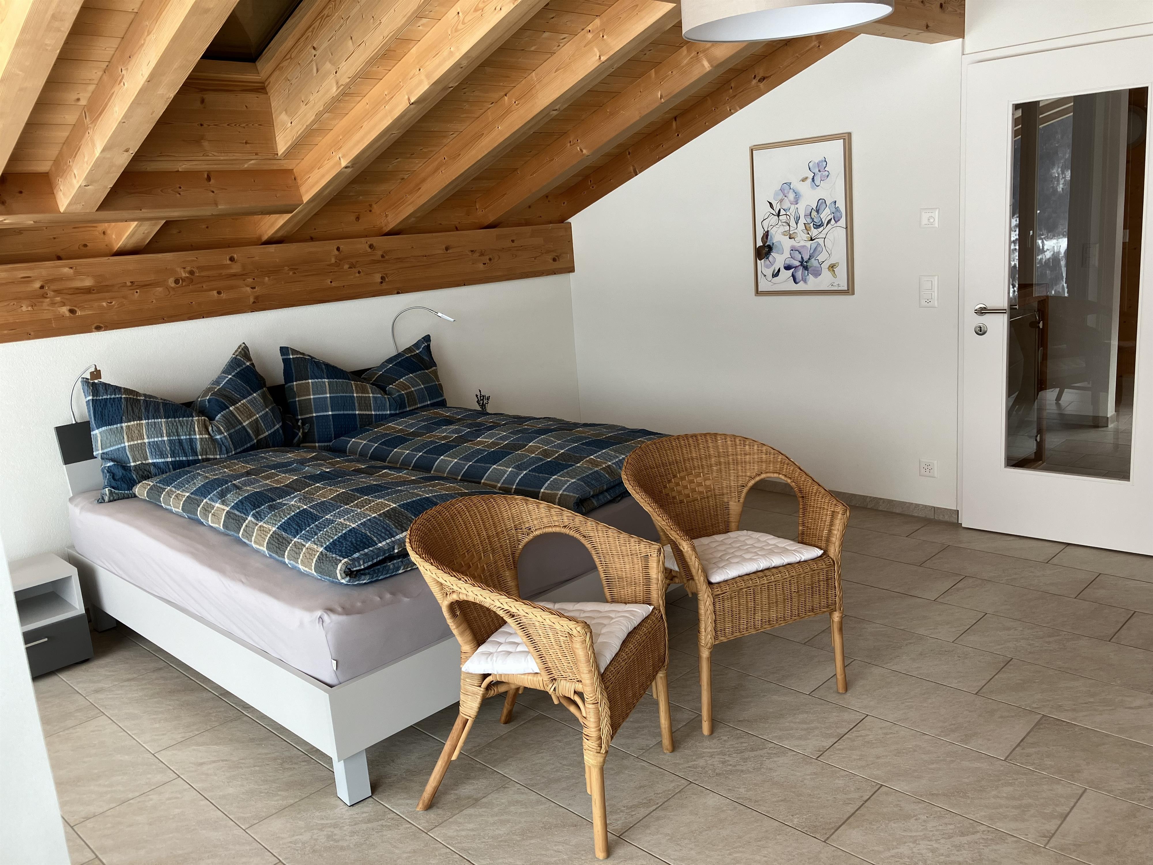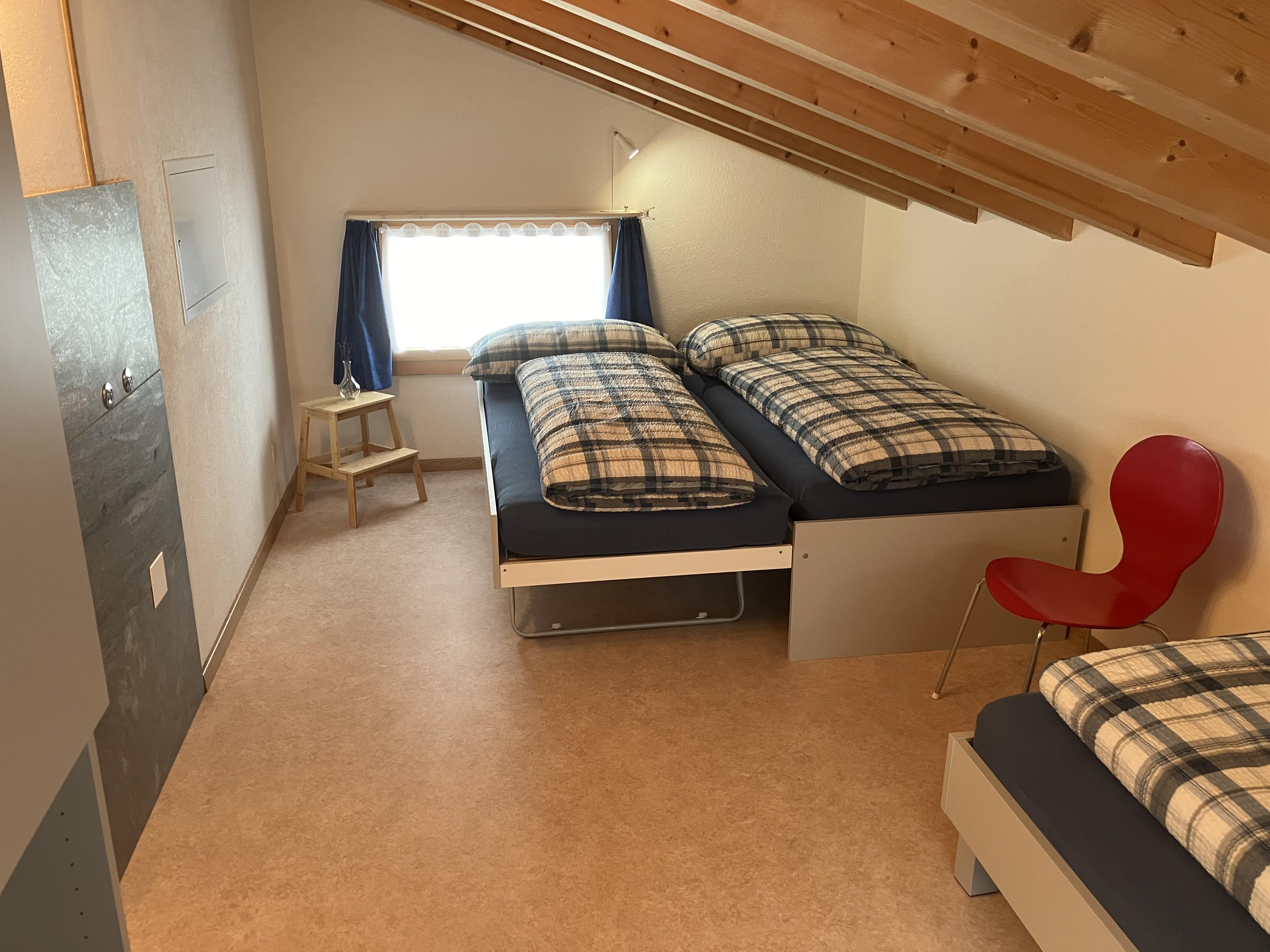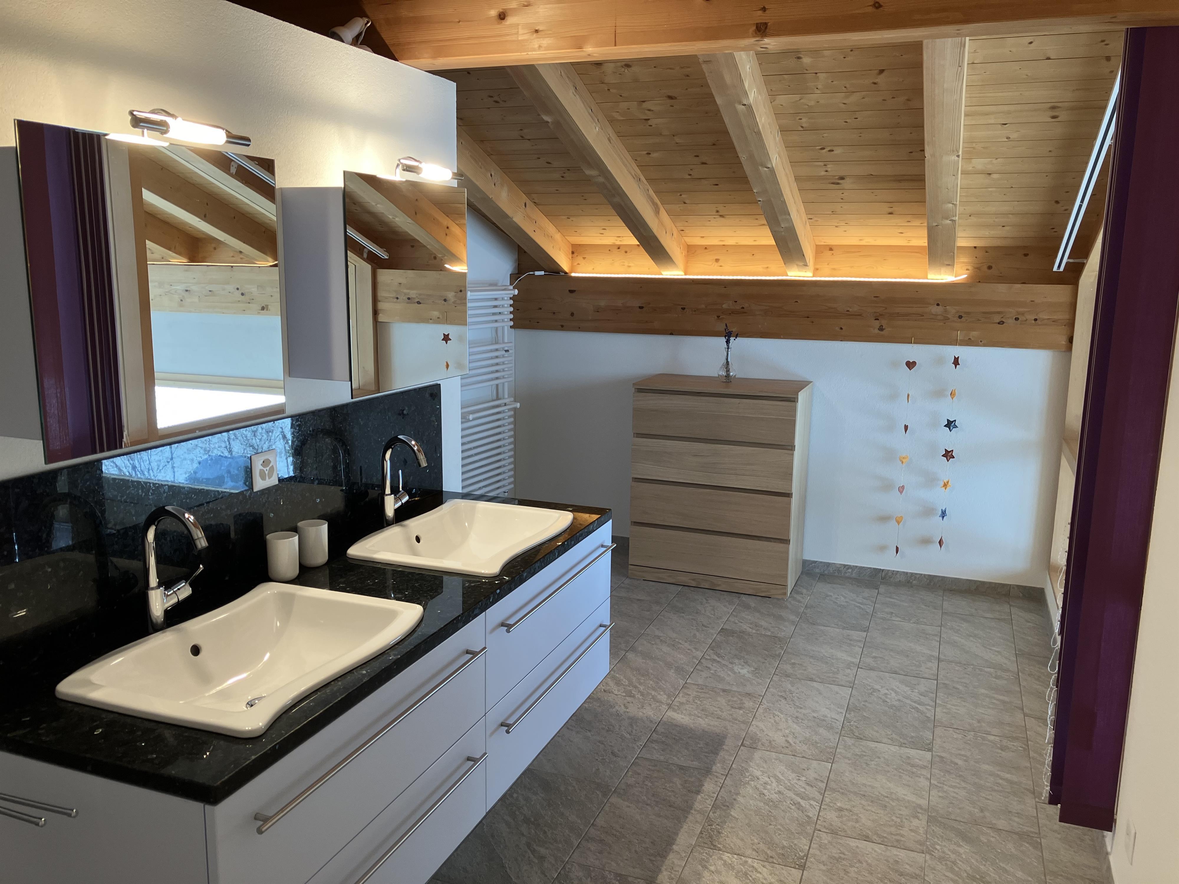 Obergeschoss: Grosses Schlafzimmer mit Doppelbett, geräumige Schränke. Badezimmer mit Doppellavabo, Dusche, WC. Schlafzimmer auf Zwischenetage mit Dachneige mit 3 Betten, idealerweise für Kinder und Jugendliche.