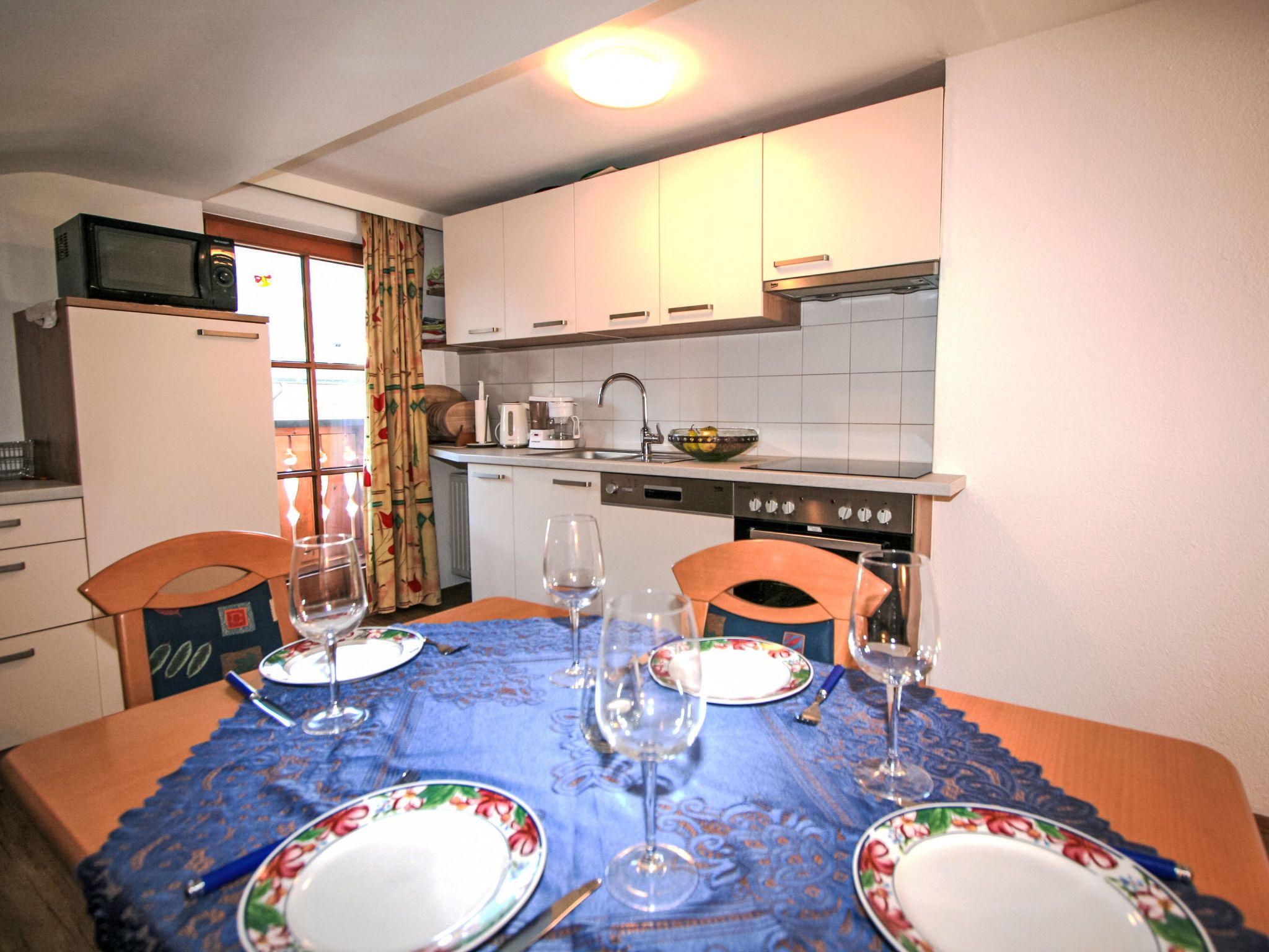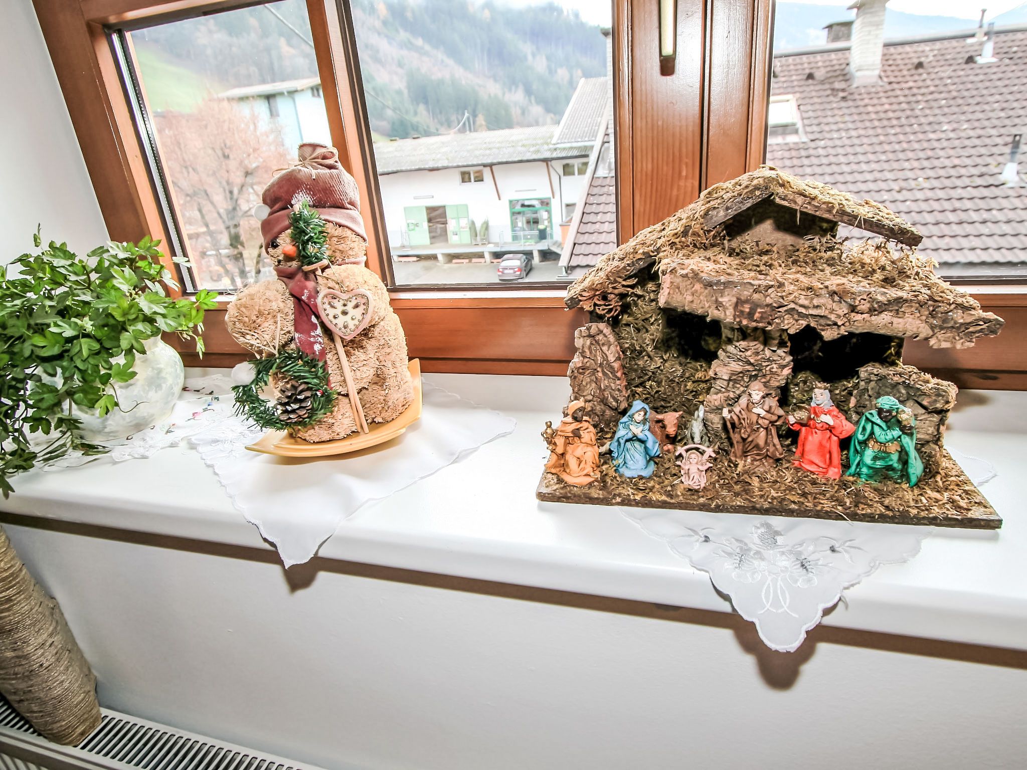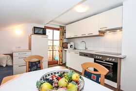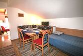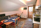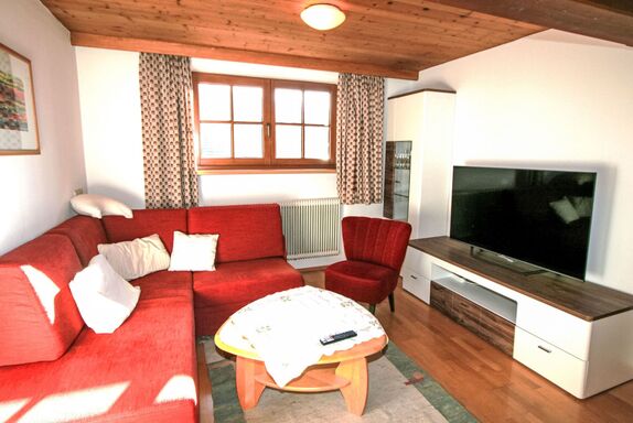 3-Zimmer-Wohnung 60 m2 im 2. Stock. Teilweise abgeschrägt, rustikal und gemütlich eingerichtet: Eingang. 1 Doppelzimmer mit Waschbecken. Ausgang zum Balkon. Wohn-/Schlafzimmer mit 1 Doppeldiwanbett und Sat-TV (Flachbildschirm), Kachelofen. Wohnküche (Backofen, Geschirrspüler, 4 Glaskeramikplatten, Mikrowelle) mit 1 Diwanbett, Essecke und Radio. Ausgang zum Balkon. Dusche/WC. Balkon. Schöne Sicht auf die Berge. Zur Verfügung: Internet (Wireless LAN). 1 Schrankzimmer. Vom Wohn-/Schlafzimmer aus gelangen Sie in die Küche (Durchgangszimmer). Parkettböden.