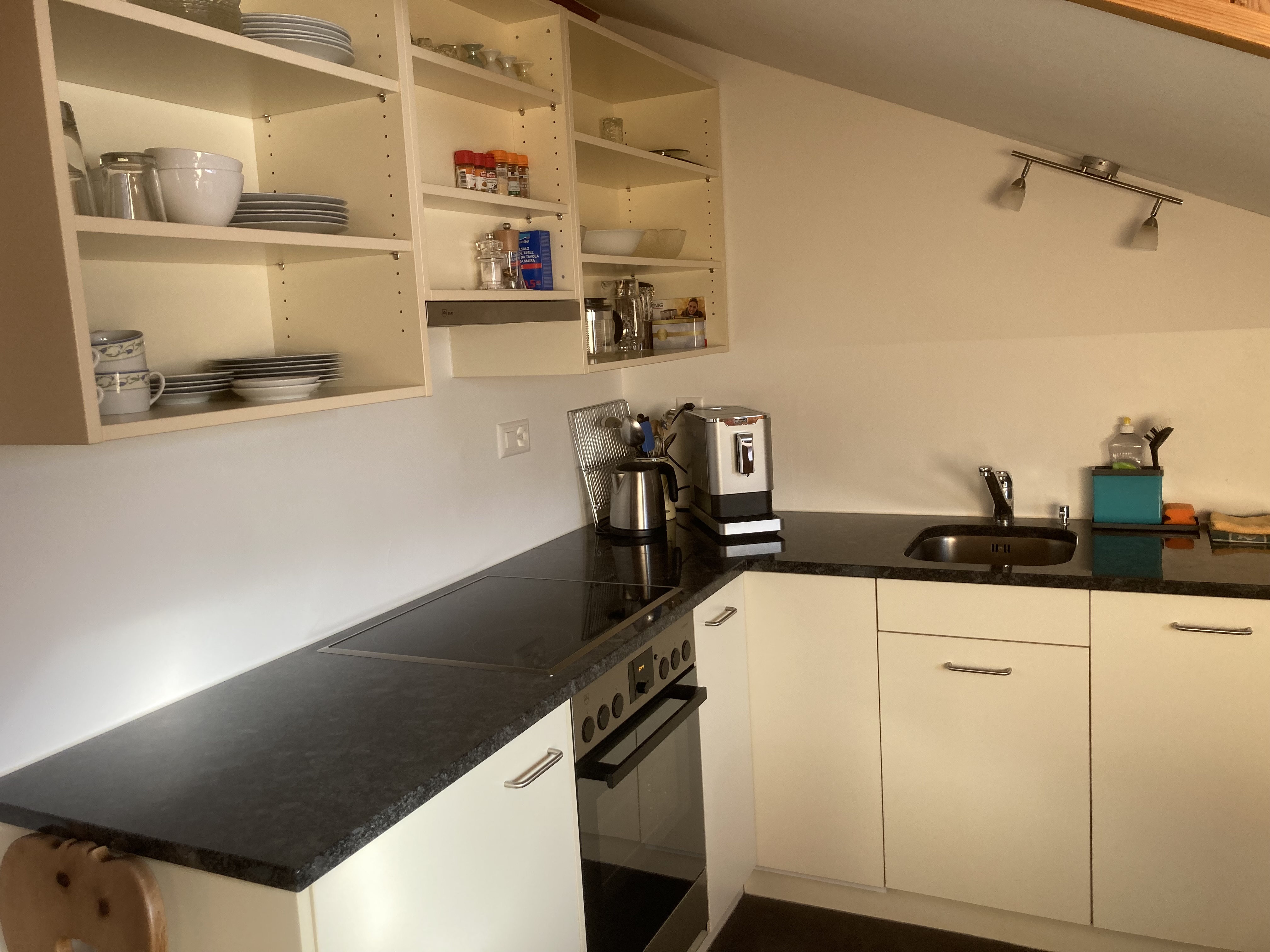 Vacation apartment under the roof with view of the Engadin mountains. 1 bedroom with 2 beds, 1 room with kitchen, table and 2 beds. Shower/toilet, radio, television and Wlan. Bed and kitchen linen included. New kitchen since november 2014. Parking and garden. No smoking apartment. No pets.