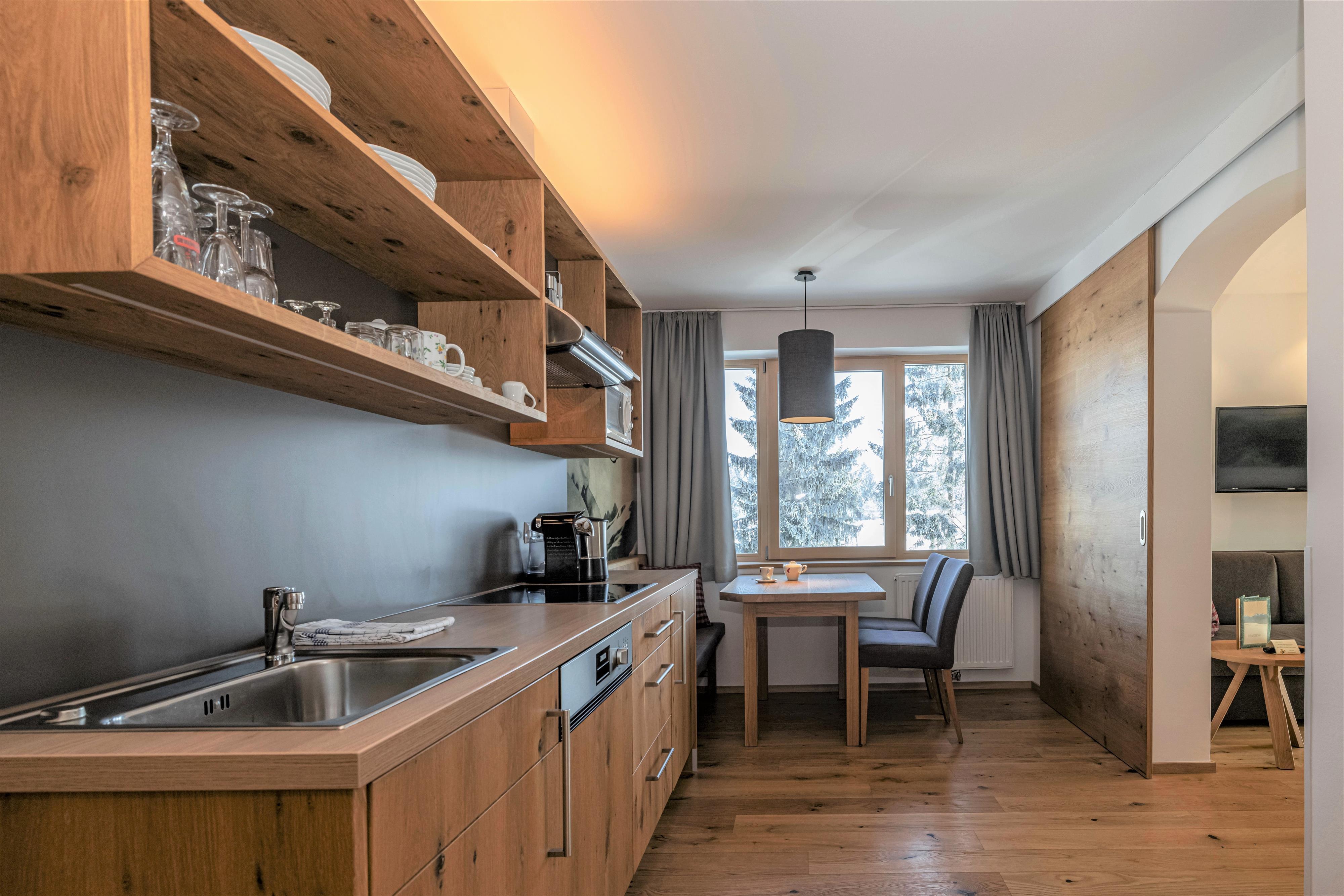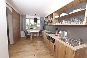 Küche mit gemütlicher Sitzgelegenheit, Mikrowelle, Inductionsherdplatte, Geschirrspüler, automatische Kaffeemaschine mit 6 Stk. Kapseln (weitere Kapseln sind gegen Aufpreis bei uns an der Rezeption erhältlich), Wasserkocher, genügend Geschirr, Besteck, Geschirrtücher, Salz/Pfeffer, Zucker.
