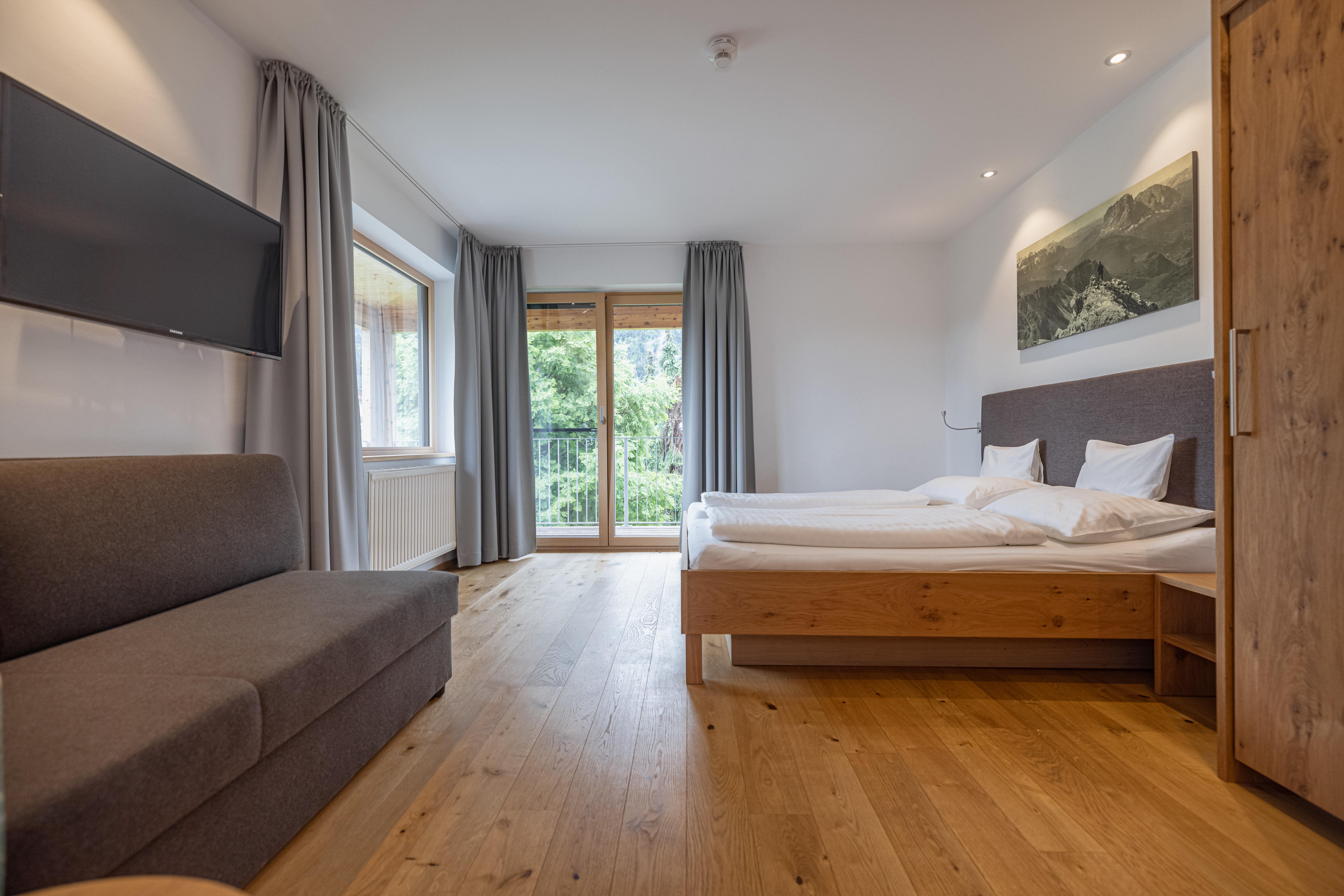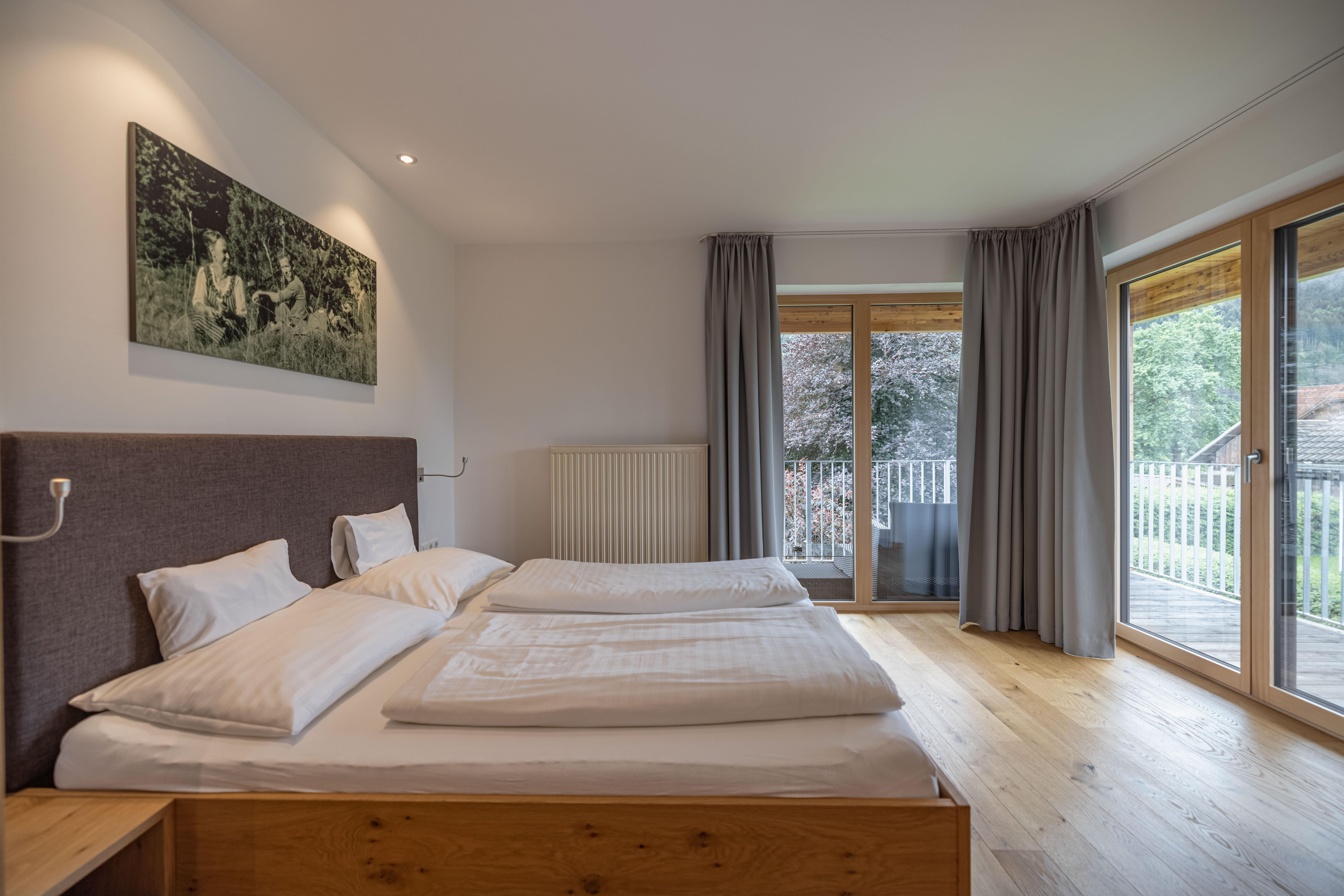 Zimmer mit Holzboden und Allergikerbettwäsche, Insektenschutzgitter, Balkon mit moderner Sitzlounge.