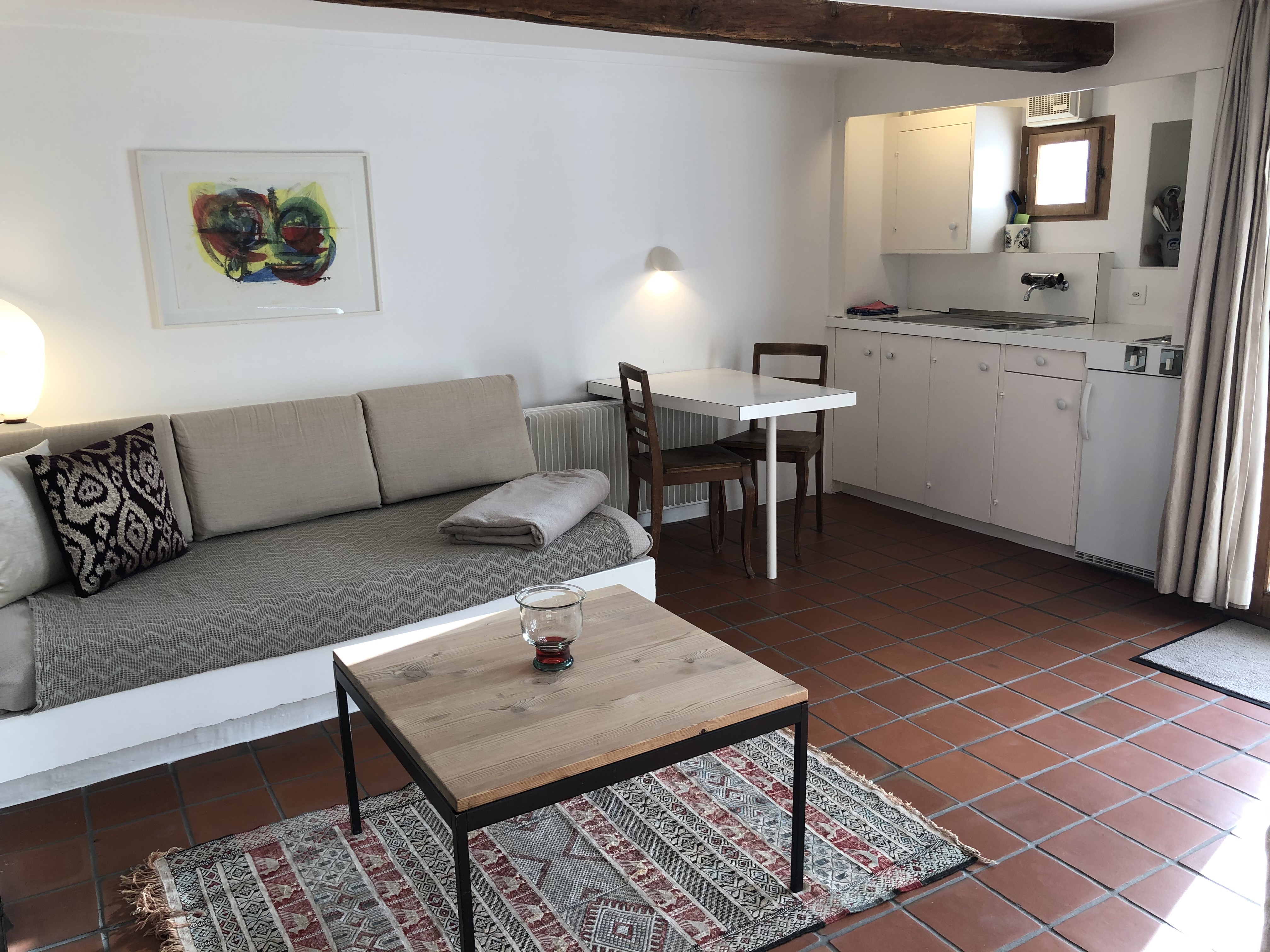 Die gemütliche Einzimmerwohnung wurde 1972 vom preisgekrönten Flimser Architekten Rudolf Olgiati, geplant und eingebaut. Schöner Blick nach Süden auf den Garten und die dahinter liegenden Berge. Es gibt ein Badezimmer mit Badewanne/Dusche und ein separates WC. Zur Wohnung gehört zudem ein Aussenparkplatz, direkt vor dem Haus.Haustiere sind in dieser Wohnung leider nicht erlaubt. Das Rauchen ist in der Wohnung verboten, jedoch darf auf der Terasse geraucht werden.
