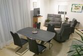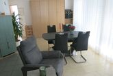 Schlafzimmer mit Doppelbett. Wohnzimmer mit zwei Schrankbetten, Esstisch und Polstergruppe, TV, Radio, Telefon. Offene, gut ausgerüstete Küche.