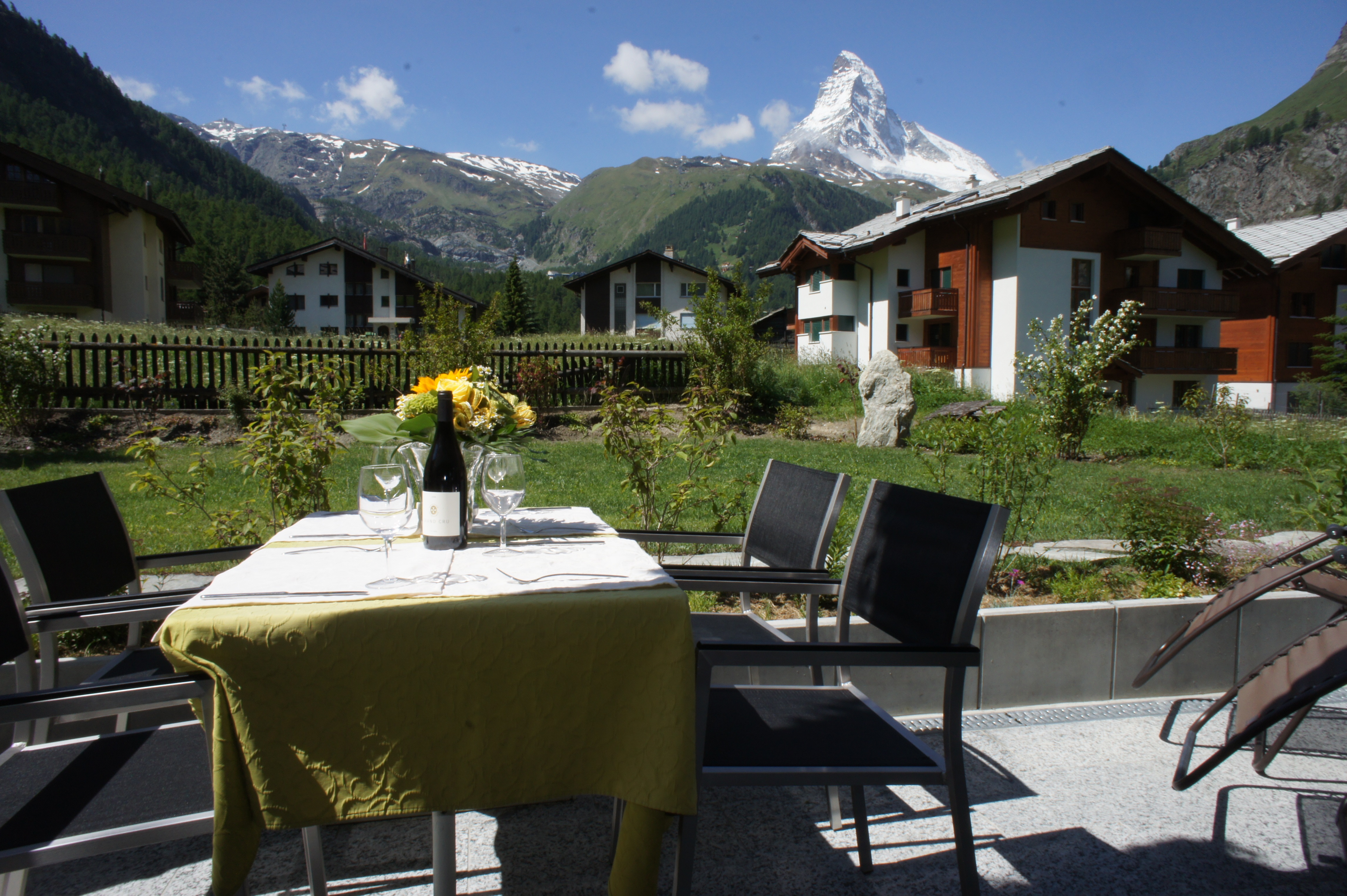 Moderne 3.5-Zimmerwohnung im oberen Erdgeschoss, 86 m², komplett ausgestattete Küche mit Geschirrspüler, Combi Steamer, etc., Wohnzimmer mit Kabel-TV/DVD, Radio/CD/iPod Docking Station, 2 Schlafzimmer mit Doppelbett und TV, 2 Bäder mit Dusche/WC, sonnige Terrasse mit wunderschönem Matterhornblick.