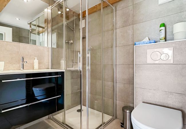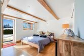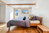 Ein Schlafzimmer mit Doppelbett, ein Badezimmer mit Dusche und WC. Ein Sofa im Wohnzimmer bietet möglicherweise Platz für 1 Kind.