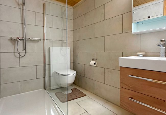 Auf der unteren Etage ein Schlafzimmer mit Doppelbett, ein zweites geräumiges Schlafzimmer mit zwei Etagenbetten für 4 Betten, ein Duschbad mit WC.