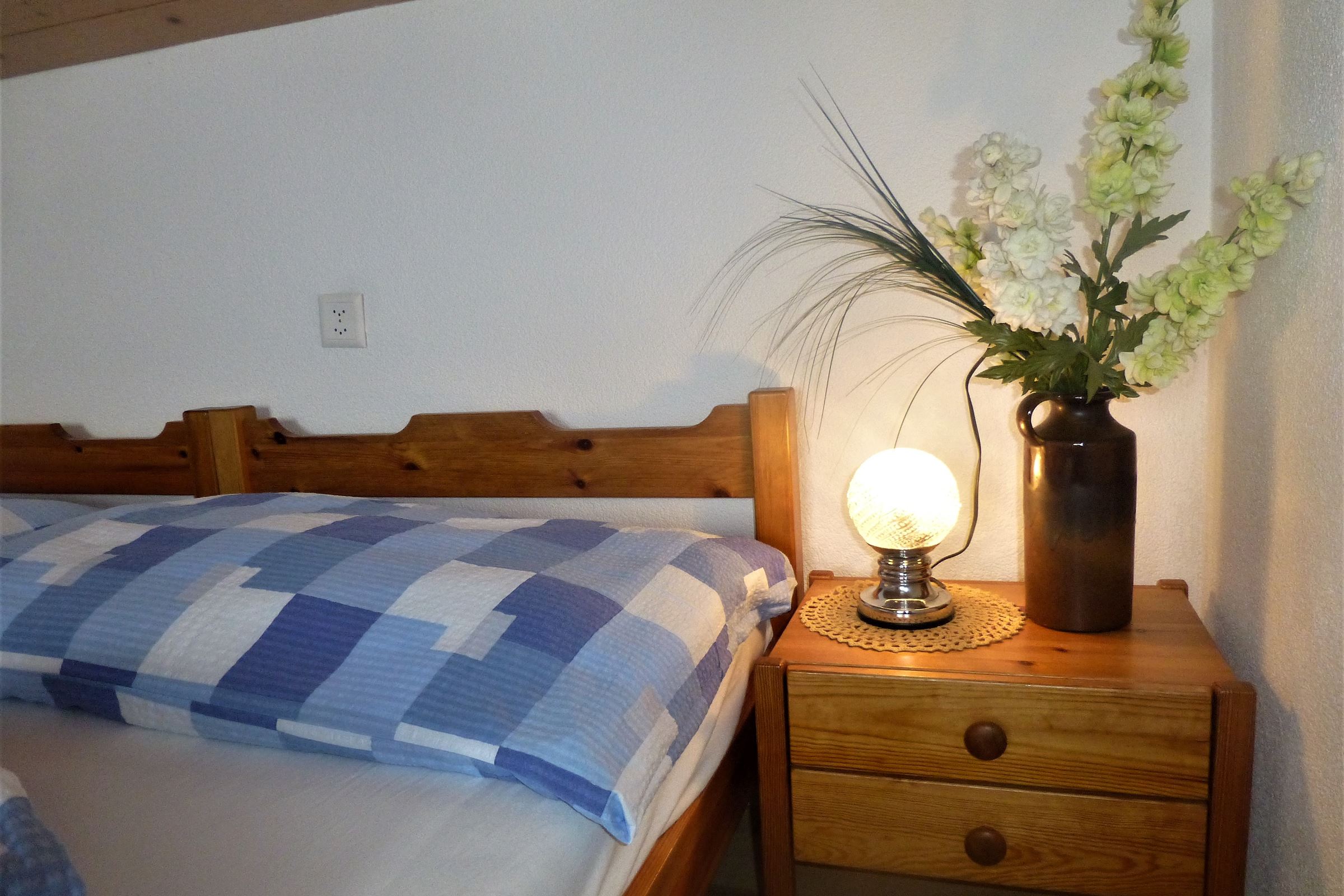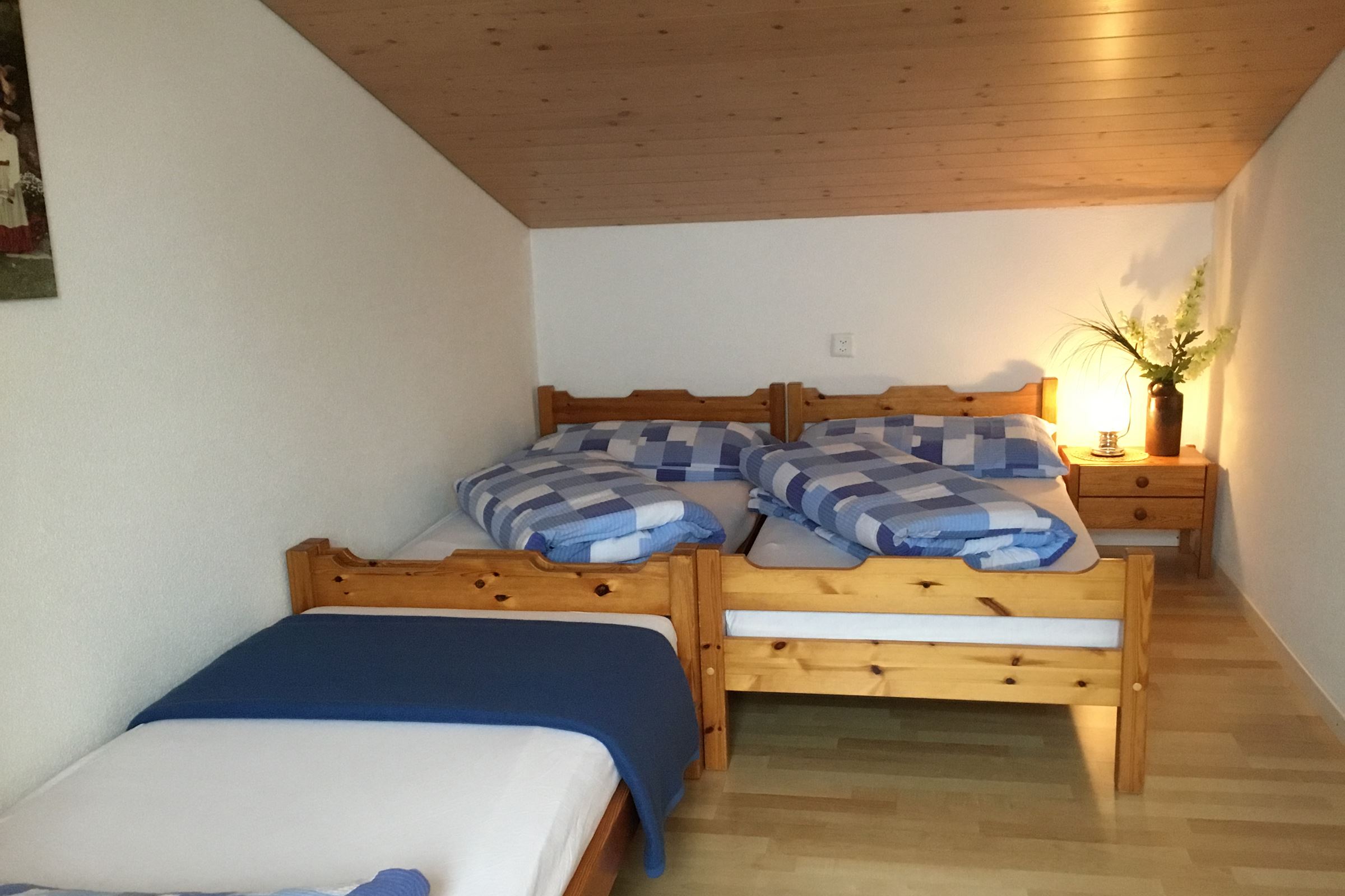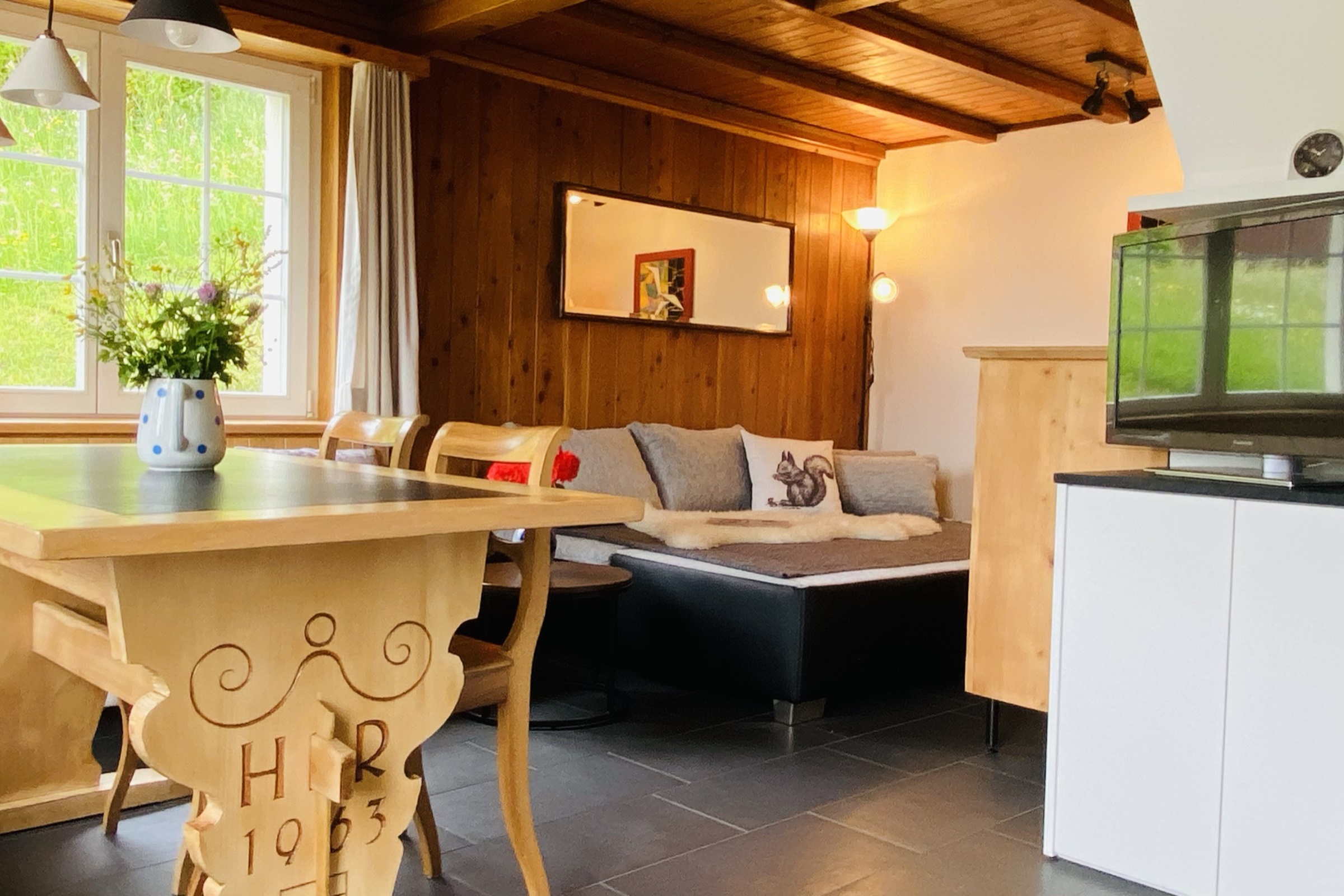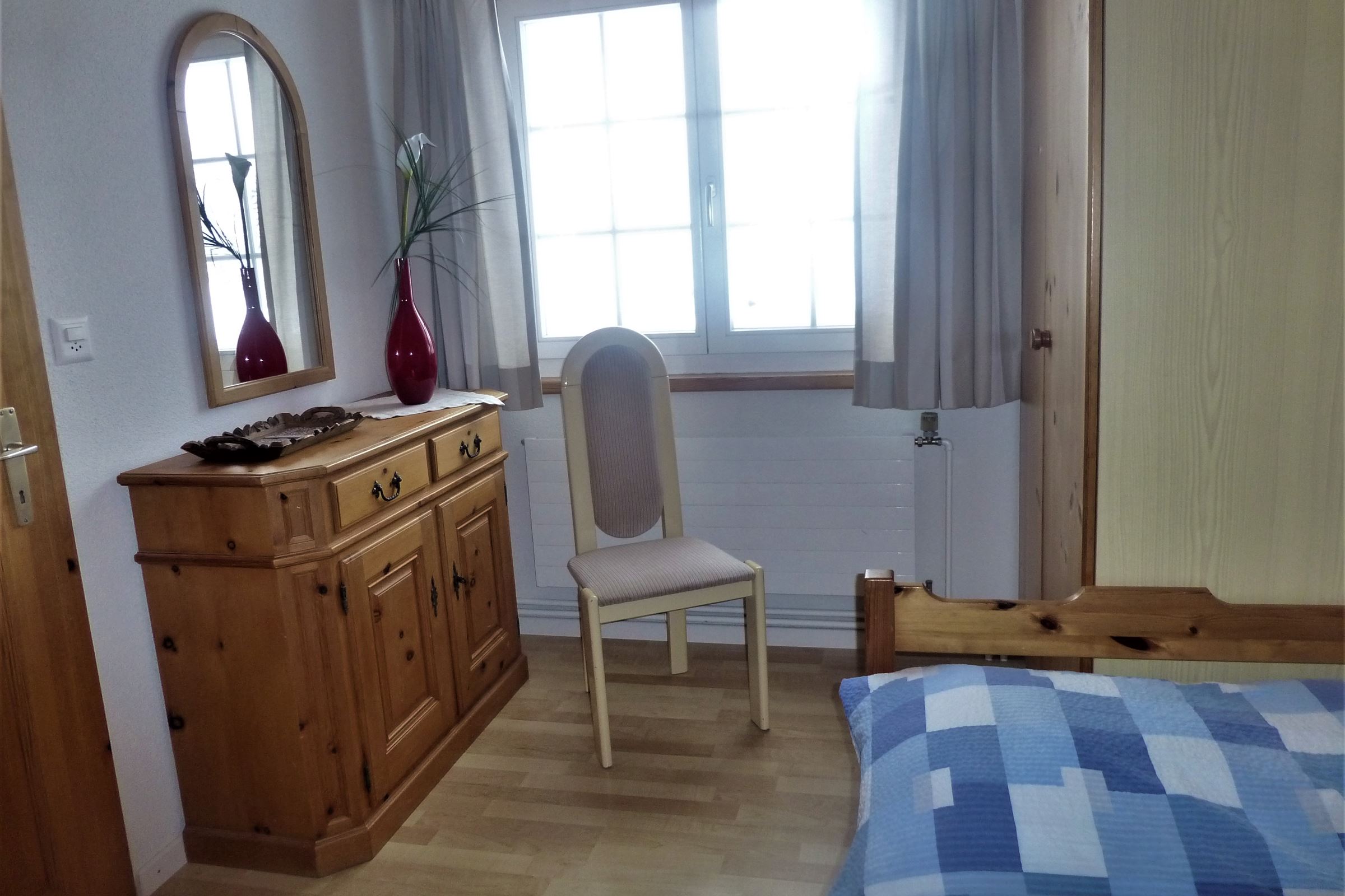 Die im Frühling 2021 neurenovierte, komfortable und liebevoll mit viel Holz eingerichtete Wohnung ist für 2-5 Personen geeignet. Das Wohnzimmer verfügt über eine grosszügige Eckbank mit Tisch und Stühlen, gemütlichem Sofa, Sessel, TV und gratis WLAN. Die erstklassige Küche ist aus hochwertigem Material und mit Geschirrspüler, grossem Kühlschrank, Backofen und alles was man braucht ausgerüstet. Die Dusche/WC ist praktisch, hell, mit Spiegelkasten, Föhn und Handtuchwärmer versehen. In der ersten Etage befindet sich das Zwei- und Dreibett-Schlafzimmer mit Kasten und Kommode. Der Sitzplatz, mit herrlicher Aussicht ist ebenerdig vom Wohnzimmer. Es stehen ein Gartentisch mit Stühlen, Grill, eine Lounge, Liegestühle und Sonnenschirme zur Verfügung. Auf der grossen Spielwiese gibt es ein Trampolin und eine Schaukel für Freude der Kinder. Gratiseintritte ins Hallenbad. Gratisparkplatz und Einstellraum für Bikes, Ski, Kinderwagen, etc. ist vorhanden. Im Winter ist die Sportbushaltestelle nur 100m entfernt, der Bus ist kostenlos. Zu den Bergbahnen sind es ca. 300m. Schlafzimmer