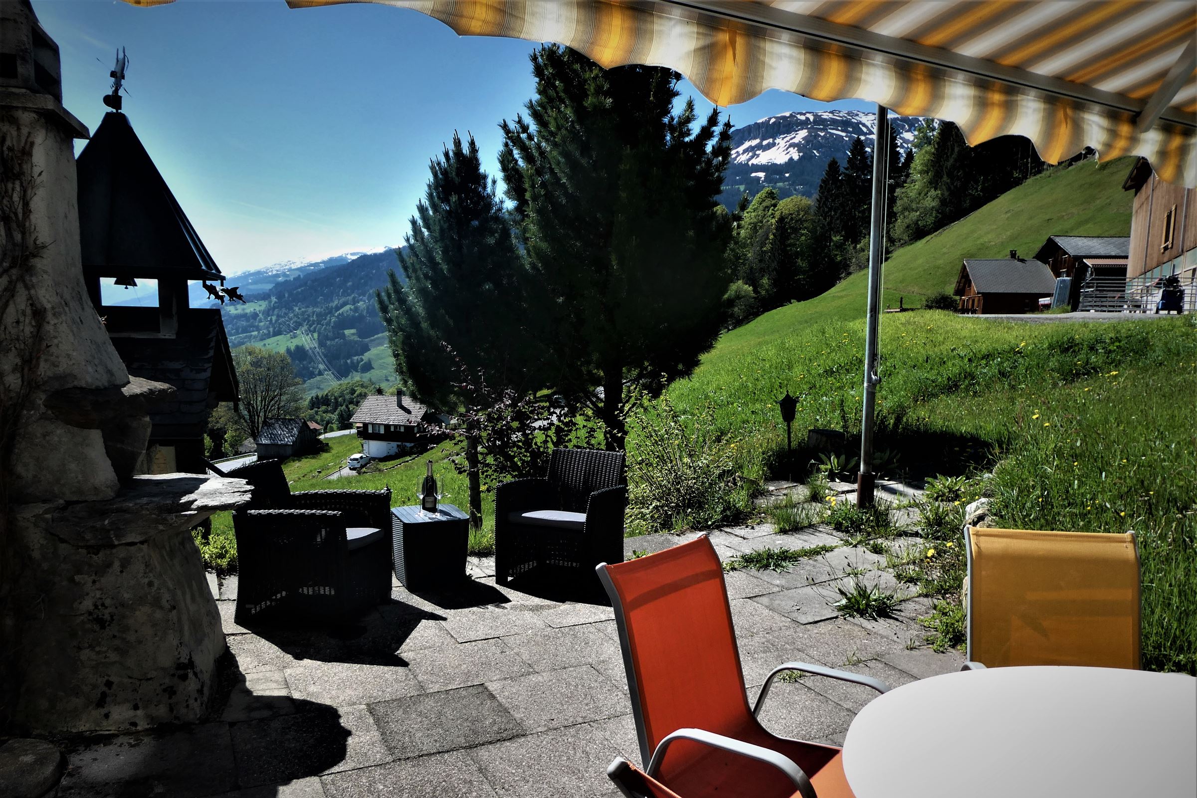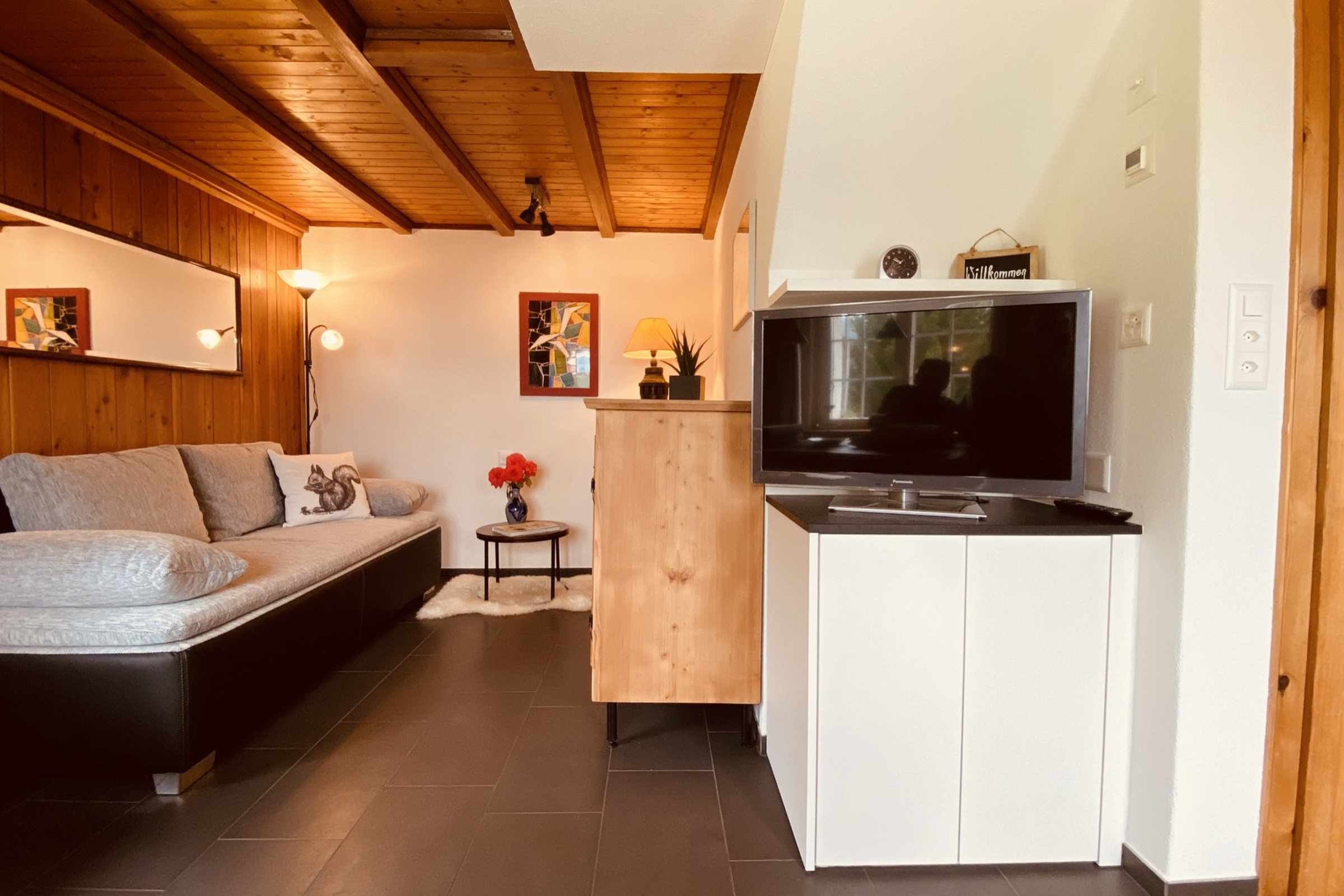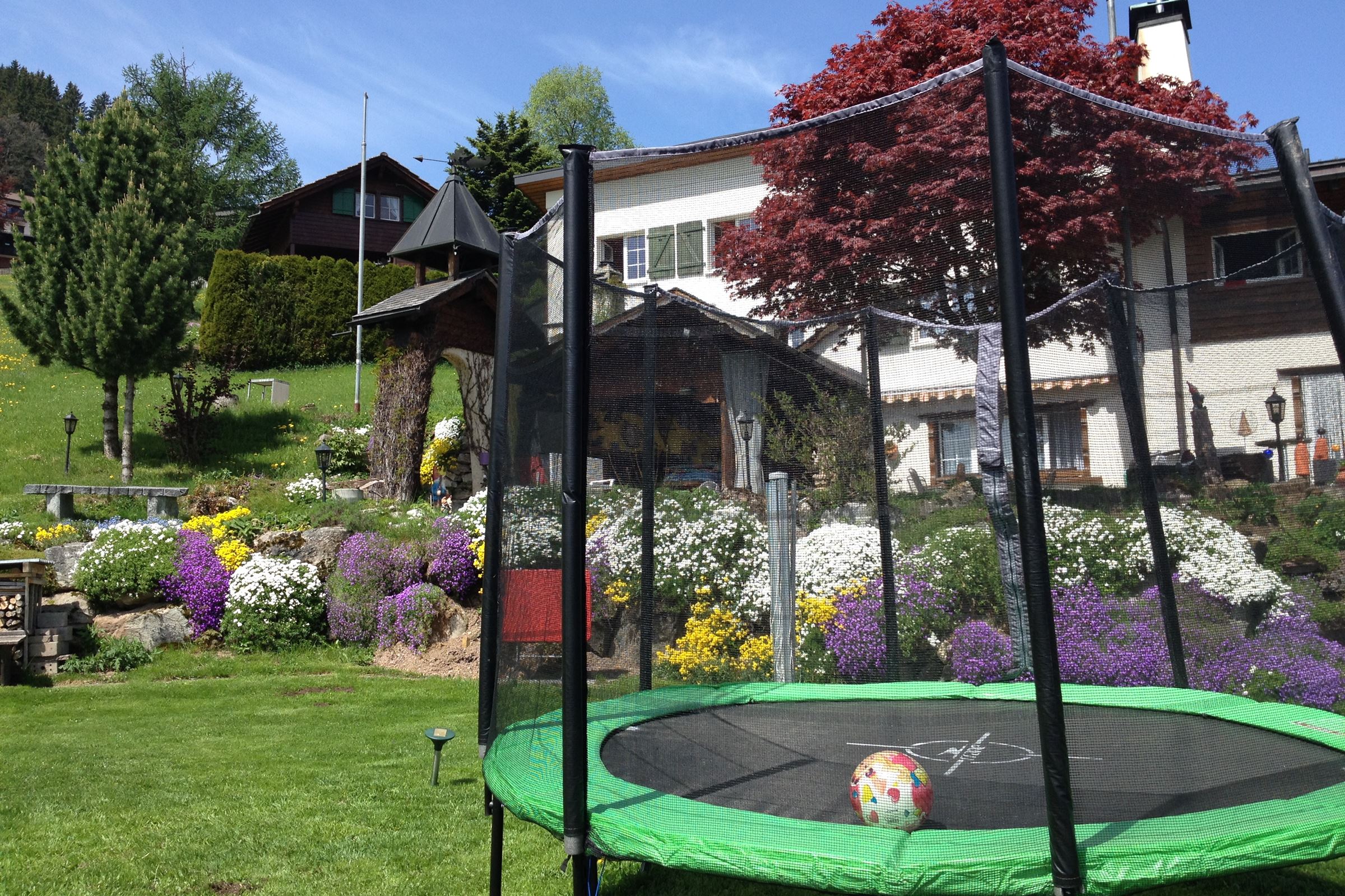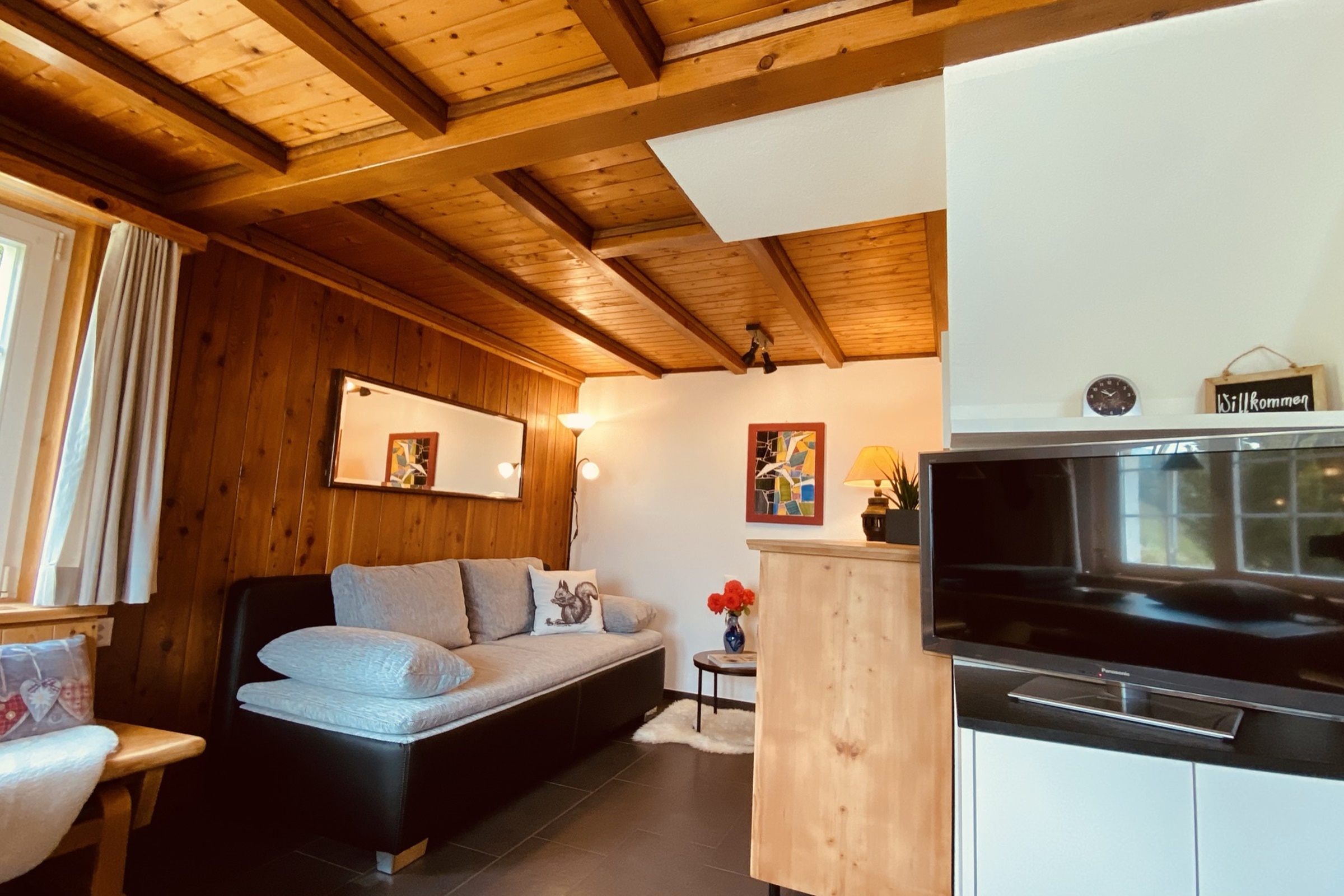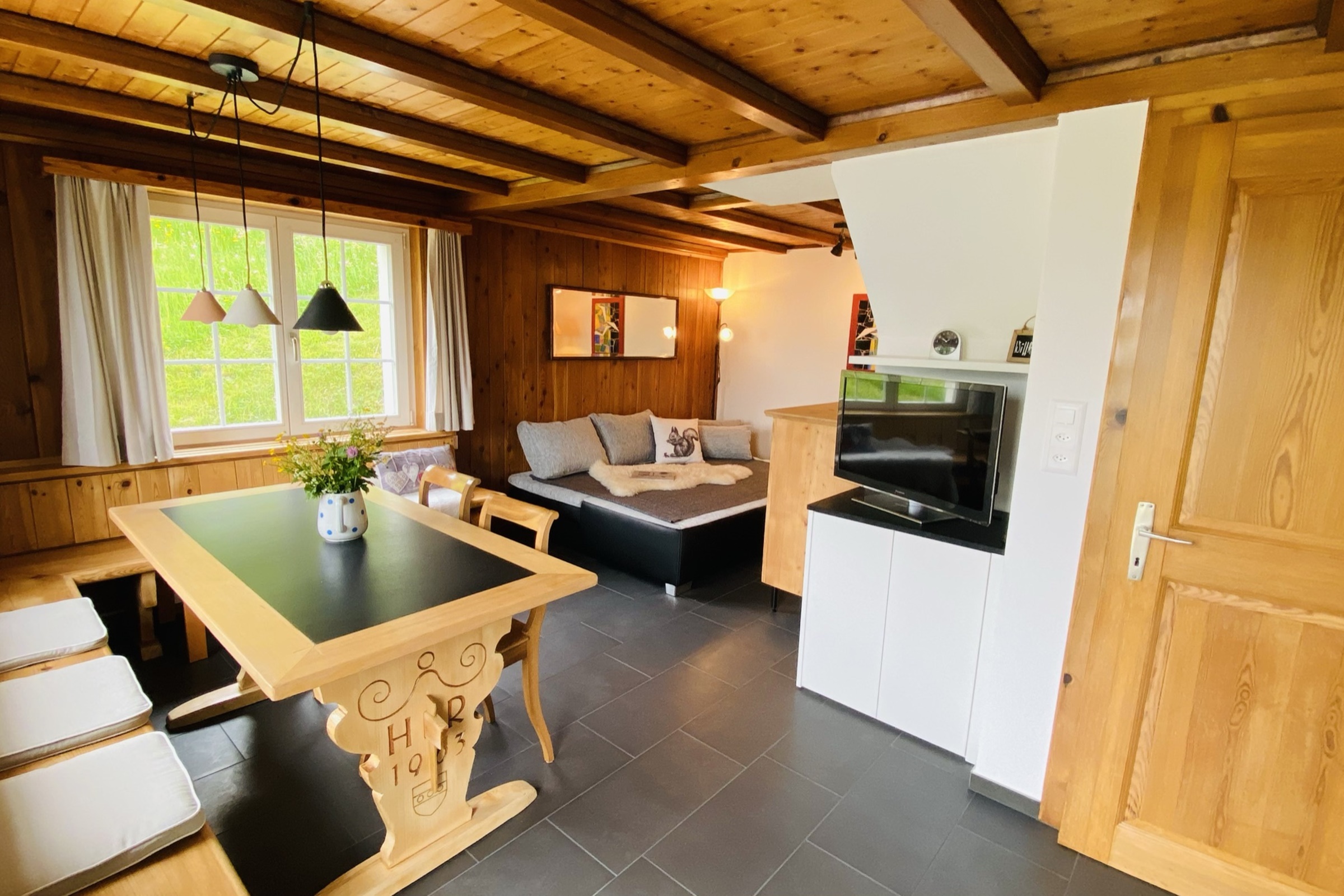 Die im Frühling 2021 neurenovierte, komfortable und liebevoll mit viel Holz eingerichtete Wohnung ist für 2-5 Personen geeignet. Das Wohnzimmer verfügt über eine grosszügige Eckbank mit Tisch und Stühlen, gemütlichem Sofa, Sessel, TV und gratis WLAN. Die erstklassige Küche ist aus hochwertigem Material und mit Geschirrspüler, grossem Kühlschrank, Backofen und alles was man braucht ausgerüstet. Die Dusche/WC ist praktisch, hell, mit Spiegelkasten, Föhn und Handtuchwärmer versehen. In der ersten Etage befindet sich das Zwei- und Dreibett-Schlafzimmer mit Kasten und Kommode. Der Sitzplatz, mit herrlicher Aussicht ist ebenerdig vom Wohnzimmer. Es stehen ein Gartentisch mit Stühlen, Grill, eine Lounge, Liegestühle und Sonnenschirme zur Verfügung. Auf der grossen Spielwiese gibt es ein Trampolin und eine Schaukel für Freude der Kinder. Gratiseintritte ins Hallenbad. Gratisparkplatz und Einstellraum für Bikes, Ski, Kinderwagen, etc. ist vorhanden. Im Winter ist die Sportbushaltestelle nur 100m entfernt, der Bus ist kostenlos. Zu den Bergbahnen sind es ca. 300m. Schlafzimmer