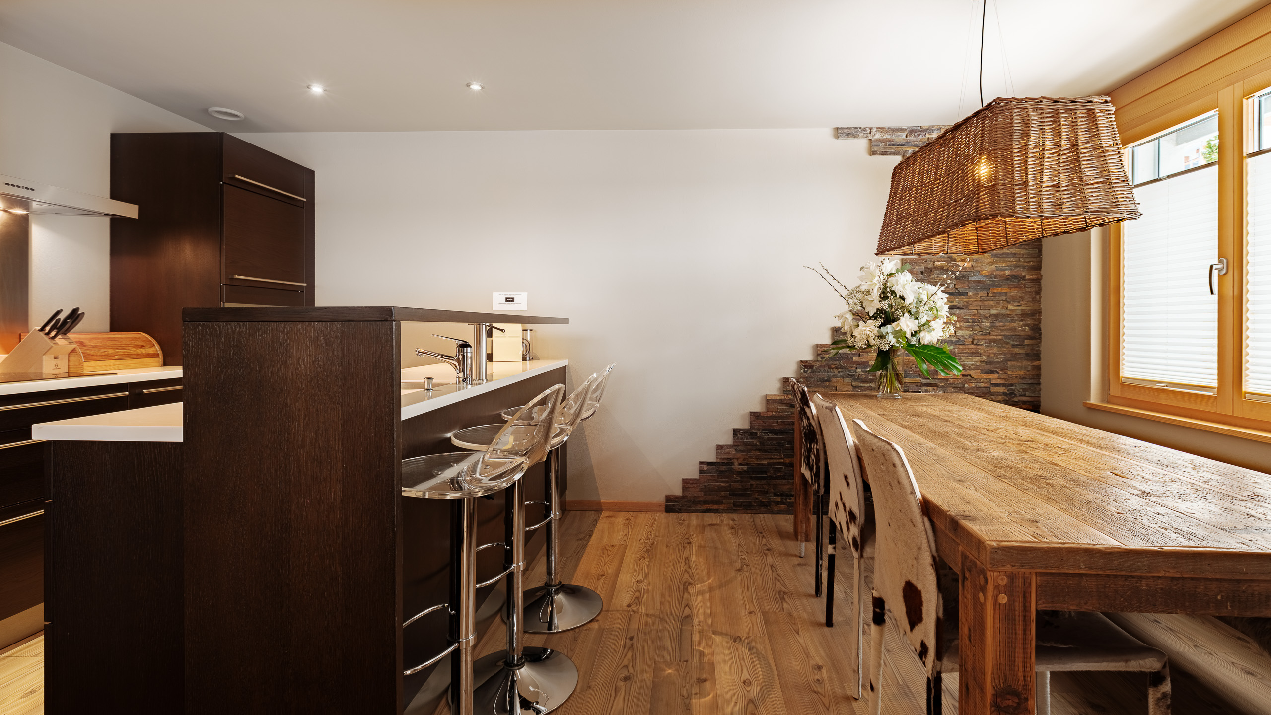 Die schöne Terrasse (mit Teil-Matterhornblick) ist mit Gartenmöbeln ausgestattete und lädt im Sommer zum Frühstücken ein. Die moderne Küche ist mit allem Komfort wie Glaskeramikkochfeld, Backofen, Mikrowelle, Geschirrspüler, Kühl- u. Gefrierschrank, Kapsel Kaffeemaschine, Toaster, Fonduegeschirr, etc. ausgestattet.
