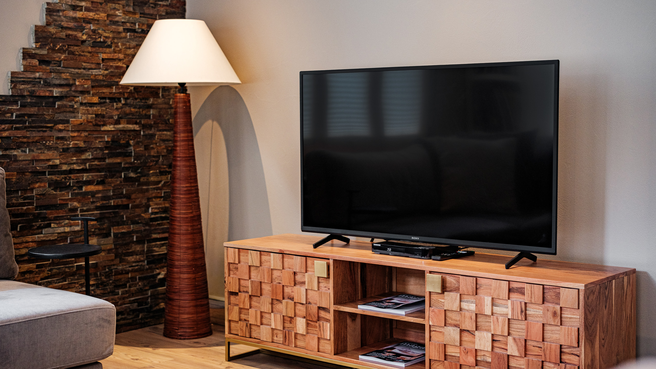 Der Wohnraum hat einen modernen LCD-Fernseher mit Home-Cinema- Anlage, Kabelfernseher, DVD Player, Musikanlage und kostenlosem W-LAN.