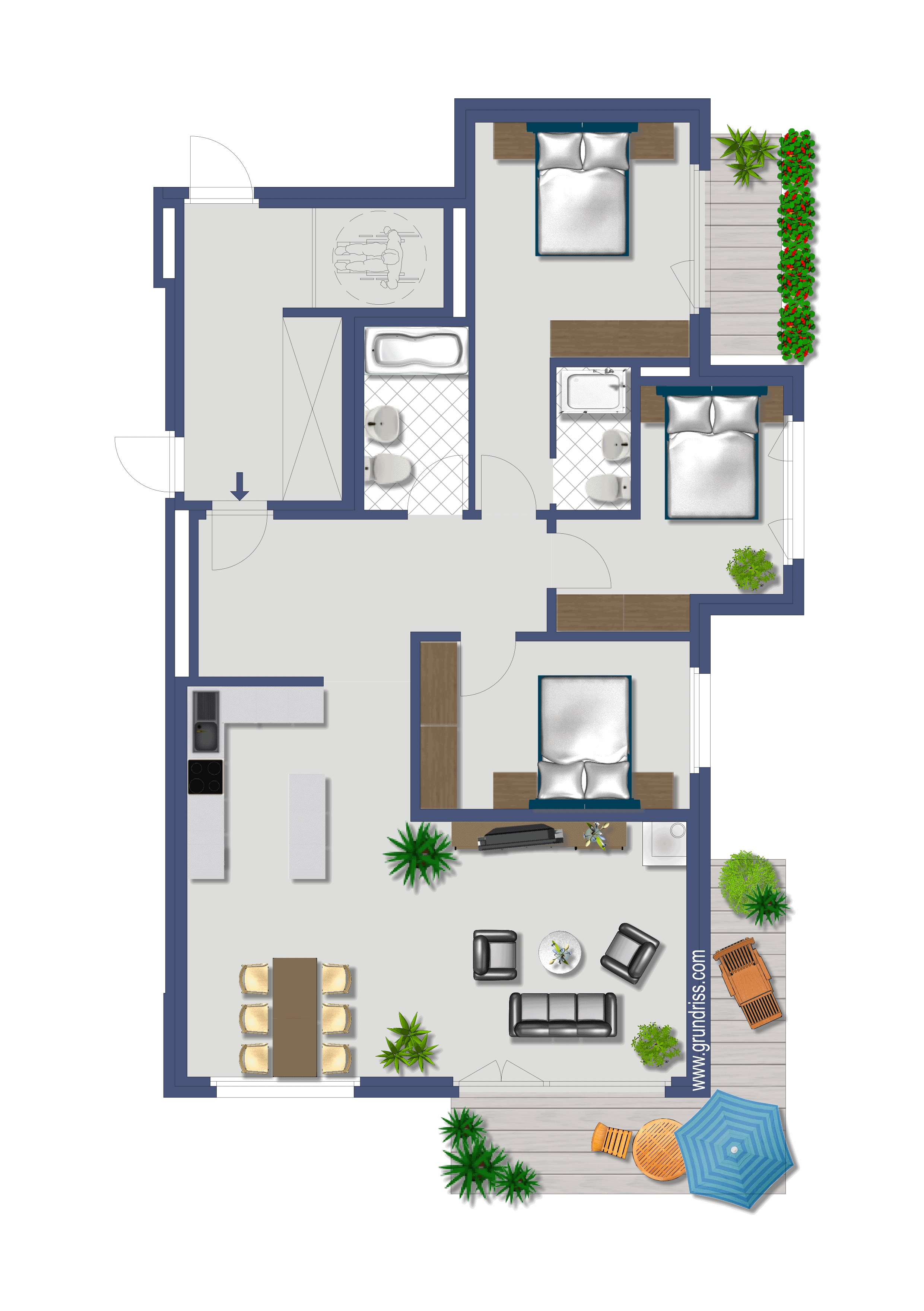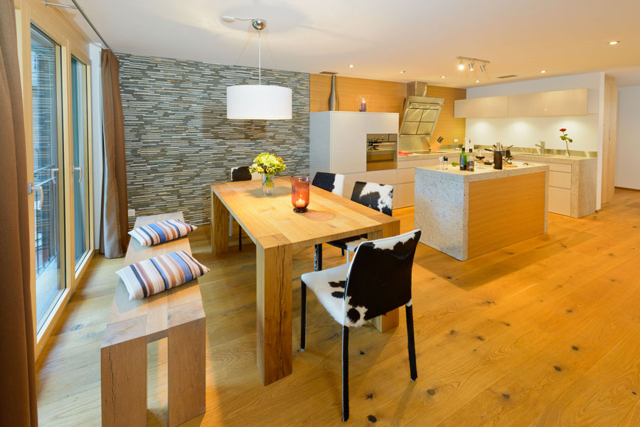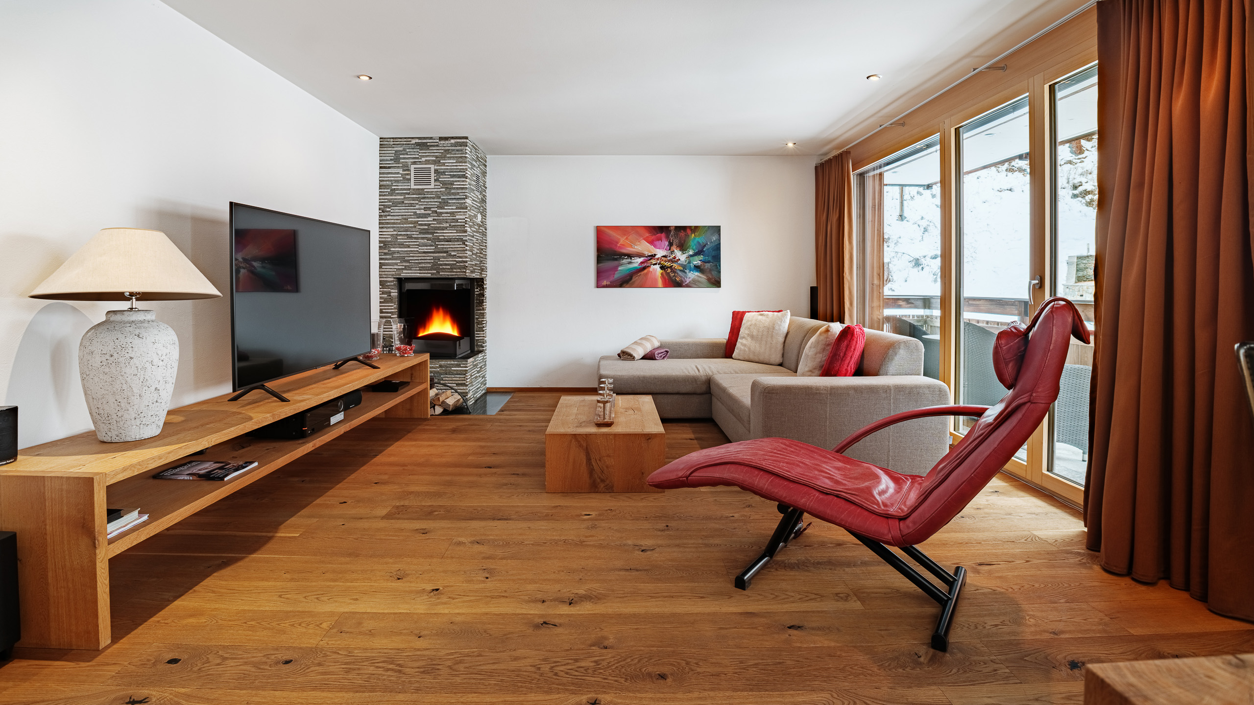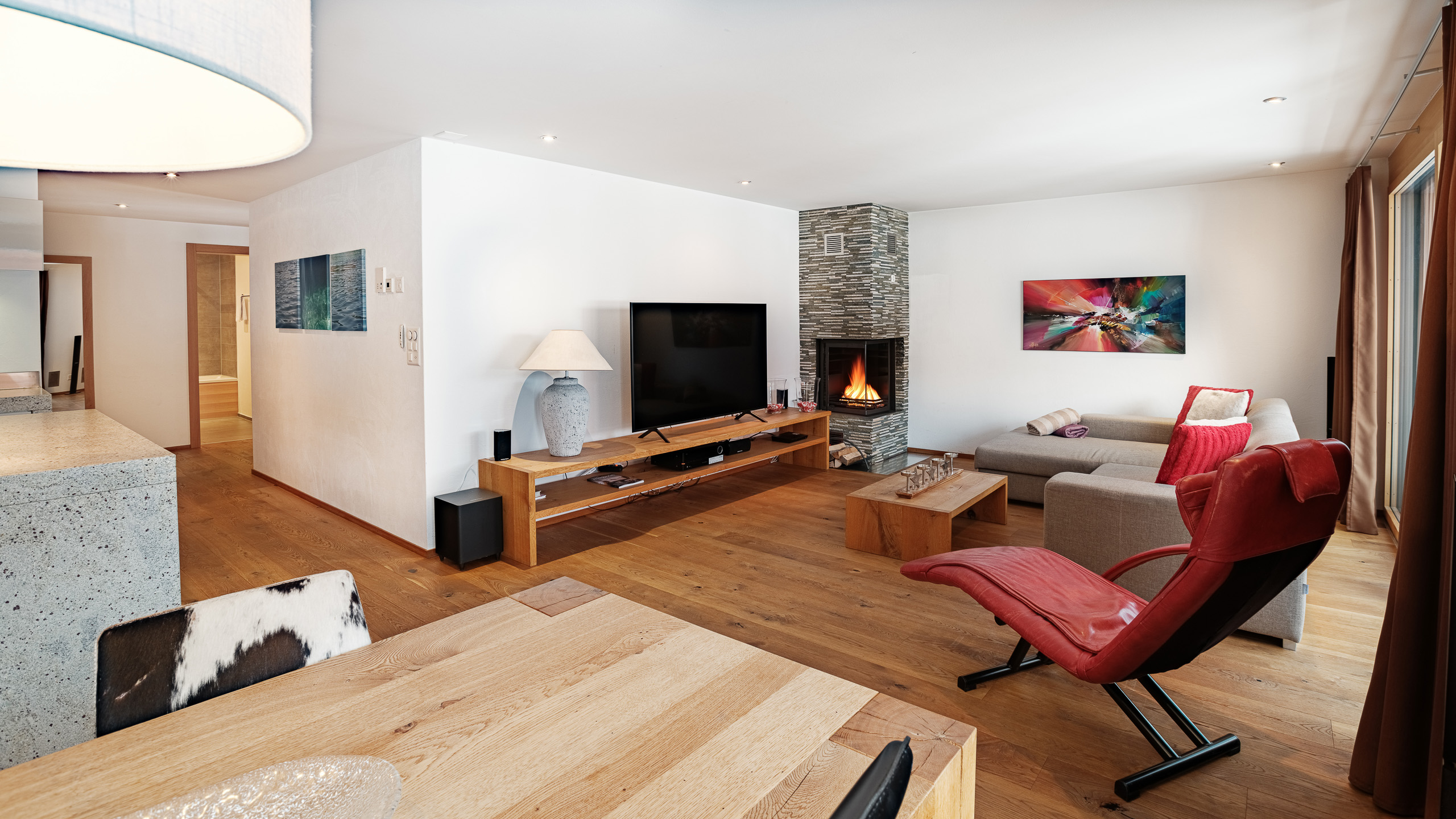 Großzügige 4½ Zimmerwohnung mit 120 m2 Bruttogeschossfläche und drei Doppelschlafzimmer für 6 Personen. Die Wohnung bietet eine wunderbare Aussicht und einen umlaufenden Balkon.