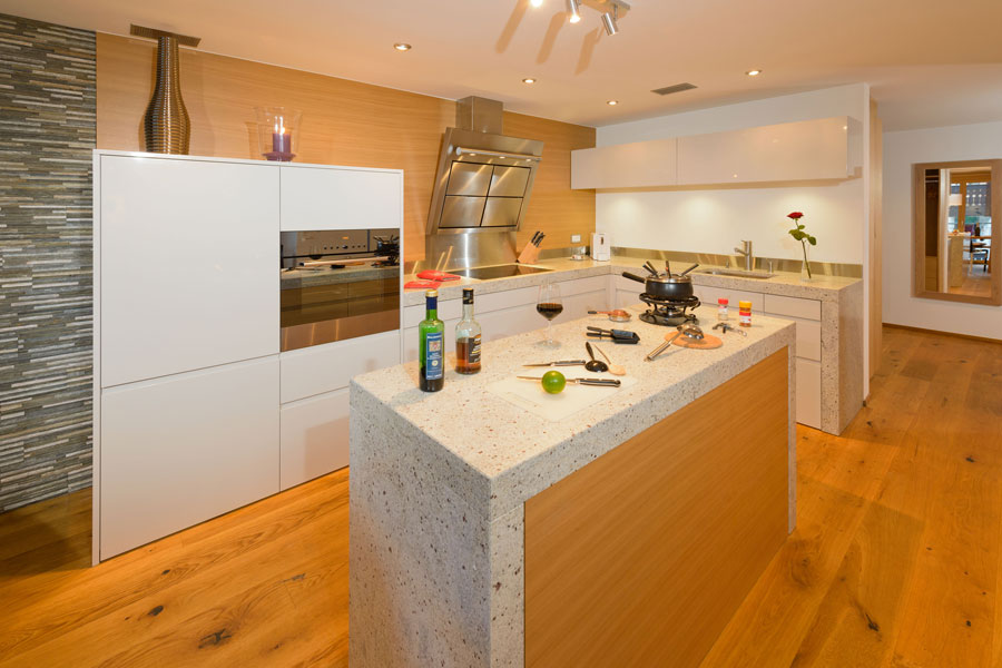 Sie ist modern ausgestattet und verfügt über zwei Badezimmer (DU/WC und Bad/WC), eine vollausgestattete Küche mit allem Komfort wie Glaskeramikkochfeld, Backofen, Geschirrspüler, Kühl- und Gefrierschrank, Delizio Kapsel Kaffeemaschine, Toaster und Fonduegeschirr.