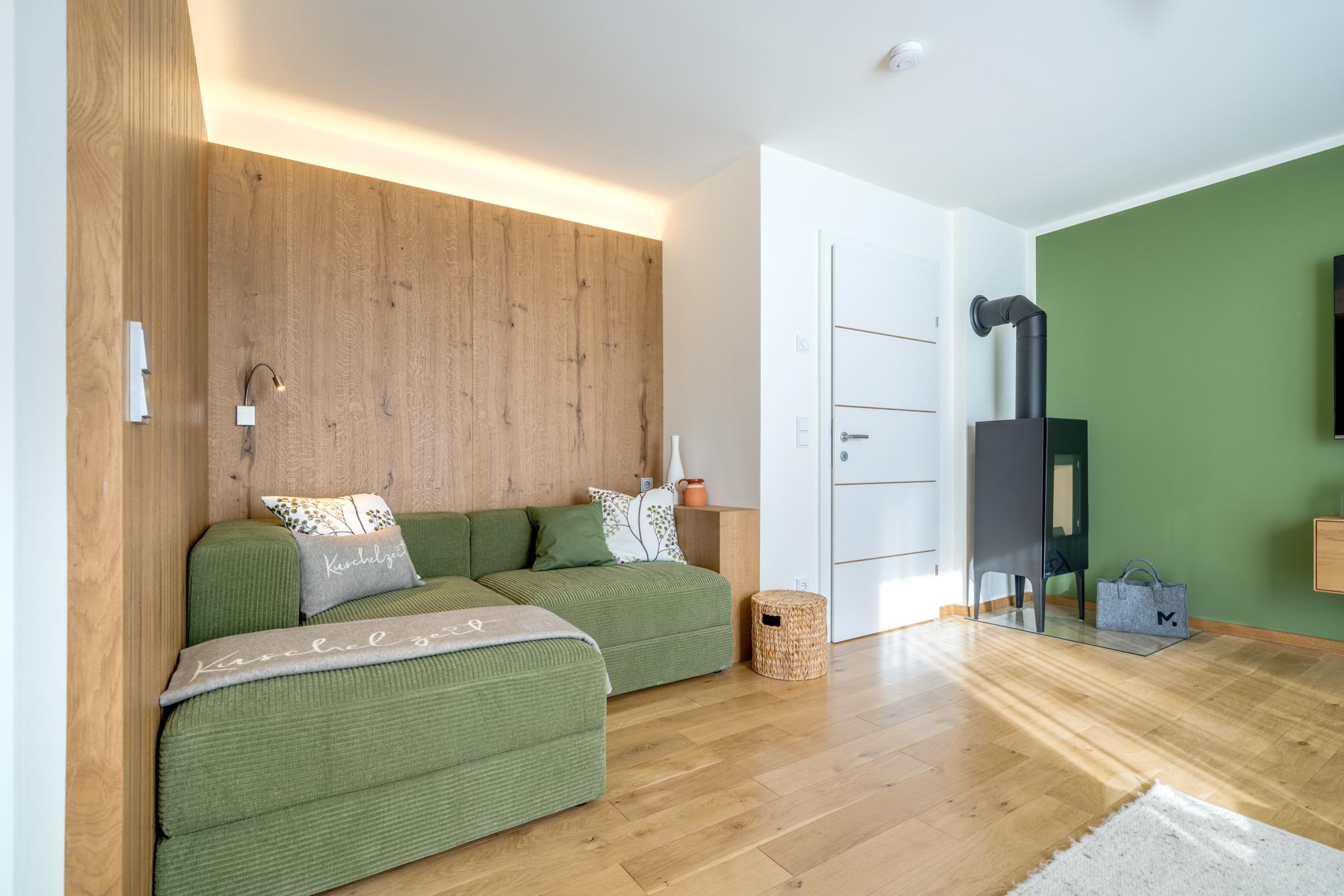 • Wohnbereich mit Kamin: Für gemütliche Abende mit einer wohligen Atmosphäre.