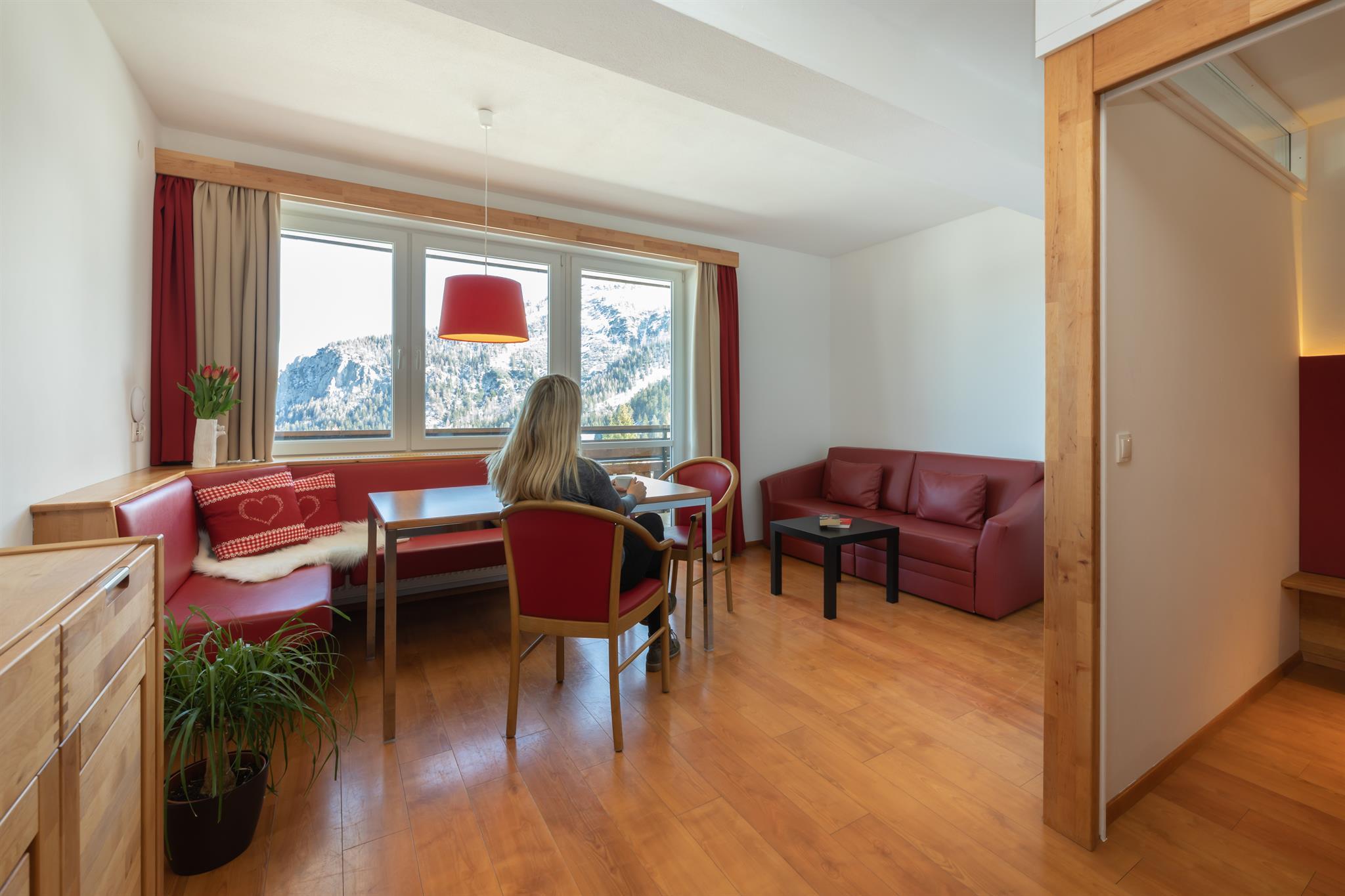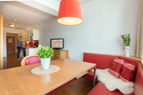 Unser komfortables Apartment für 6 Personen mit großen Balkon verspricht nicht nur eine atemberaubende Aussicht, sondern auch wunderbare Tage in Nassfeld. Auf einer Fläche von 45 m² finden Sie ein Doppelbett, ein Etagenbett, eine Schlafcouch für Zwei, eine Wohnküche, ein Badezimmer und ein WC. Tischwäsche wird von uns zur Verfügung gestellt, sowie Bettwäsche, Handtücher und optional ein Kinderbett.