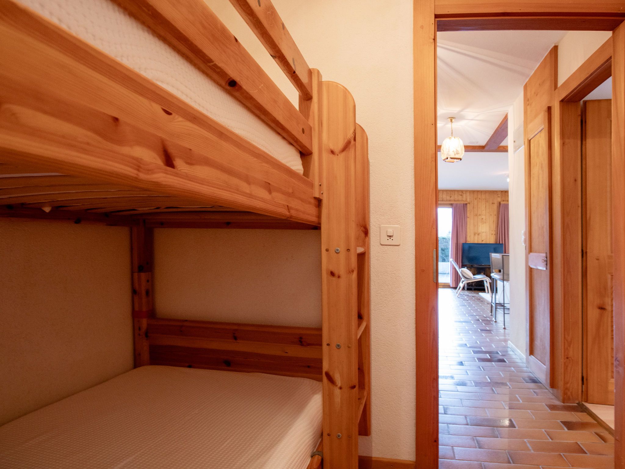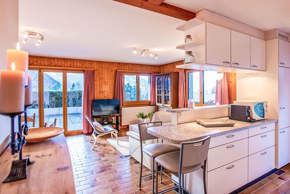 Le Schuss 1, 3-Zimmer-Wohnung 52 m2, im Erdgeschoss, Südostlage. Objekt geeignet für 2 Erwachsene + 2 Kinder. Komfortabel und schön eingerichtet: Wohn-/Esszimmer mit offenem Kamin, Esstisch und TV (Flachbildschirm). Ausgang zur Terrasse, Richtung Südosten. 1 Zimmer mit 1 Doppelbett (1 x 160 cm, Länge 200 cm). 1 Zimmer, ohne Schrank mit 1 x 2 Etagenbetten (90 cm, Länge 200 cm). Offene Küche (Geschirrspüler, 4 Glaskeramikplatten, Toaster, Wasserkocher, Tiefkühler, elektrische Kaffeemaschine, Kapseln für die Kaffeemaschine (Delizio) extra, Dampfgarer, Racletteofen, Fondue Set (Käse)). Ausgang zur Terrasse, Richtung Südwesten. Dusche/WC. Grosse Terrasse 25 m2, Südostlage und Südwestlage. Terrassenmöbel. Schöne Sicht auf die Berge. Zur Verfügung: Waschmaschine, Haartrockner. Internet (Wireless LAN, gratis). Parkplatz Nr. 1 (überdacht, 1 Auto). Bitte beachten: Nichtraucher-Unterkunft.