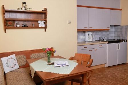 Ferienwohnung für 4-5 Personen (auf Anfrage für 6 Personen), 38-40m² Wohnraum mit Eßecke, Couch, Kochnische (Kaffeemaschine, Wasserkocher, Kühlschrank, Herd, Dunstabzug, Geschirr), Sat-TV, Internet, Haarfön. 1 Doppelzimmer, 1 Zimmer mit Stockbetten, Balkon. Dusche/WC extra