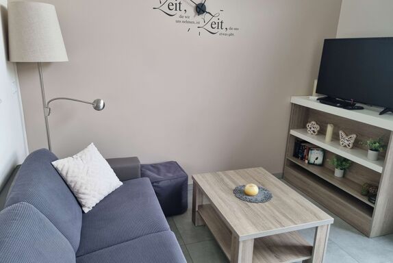 Der offene Wohnbereich kombiniert gemütliches Wohnen, Arbeiten und Essen und ist mit einem komfortablen Schlafsofa, einem Flat-TV und einem Esstisch ausgestattet. Die voll ausgestattete Küche umfasst ein Ceranfeld, eine Kaffeemaschine, einen Wasserkocher, einen Toaster und eine Geschirrspülmaschine. Das Appartement bietet ein Schlafzimmer mit Doppelbett und ein modernes Badezimmer mit Dusche und WC. Eine sonnige Terrasse lädt zum Entspannen im Freien ein.