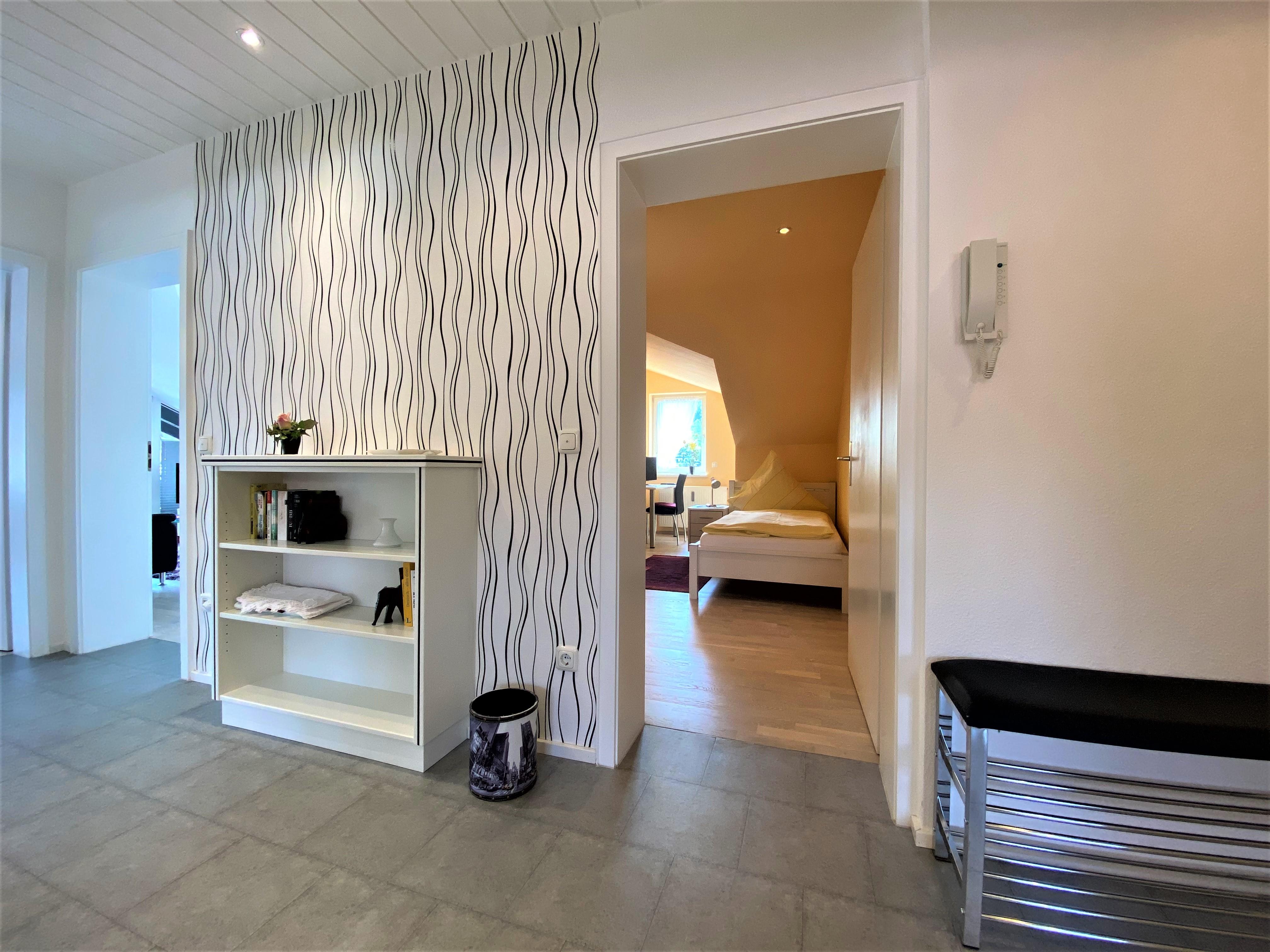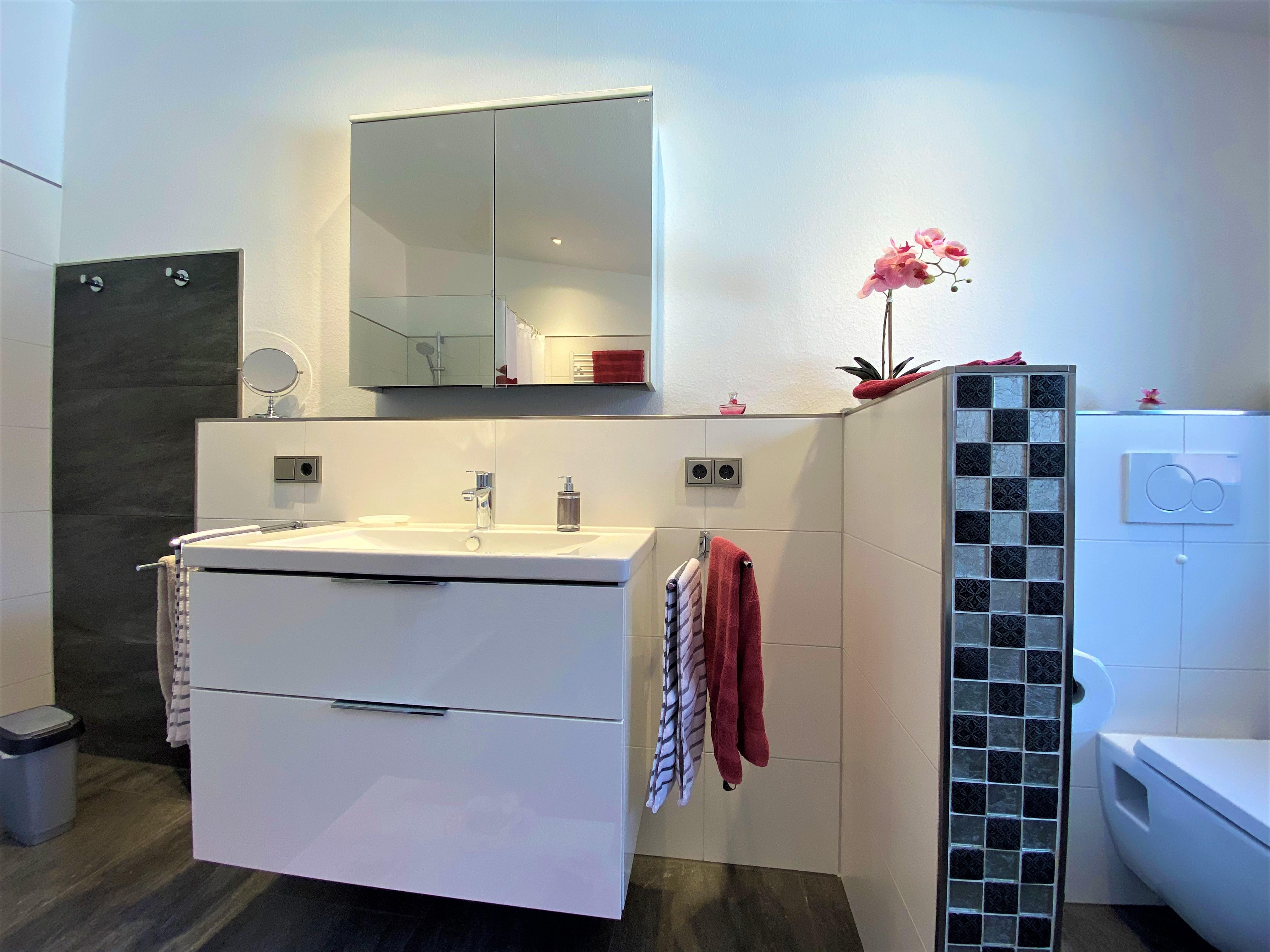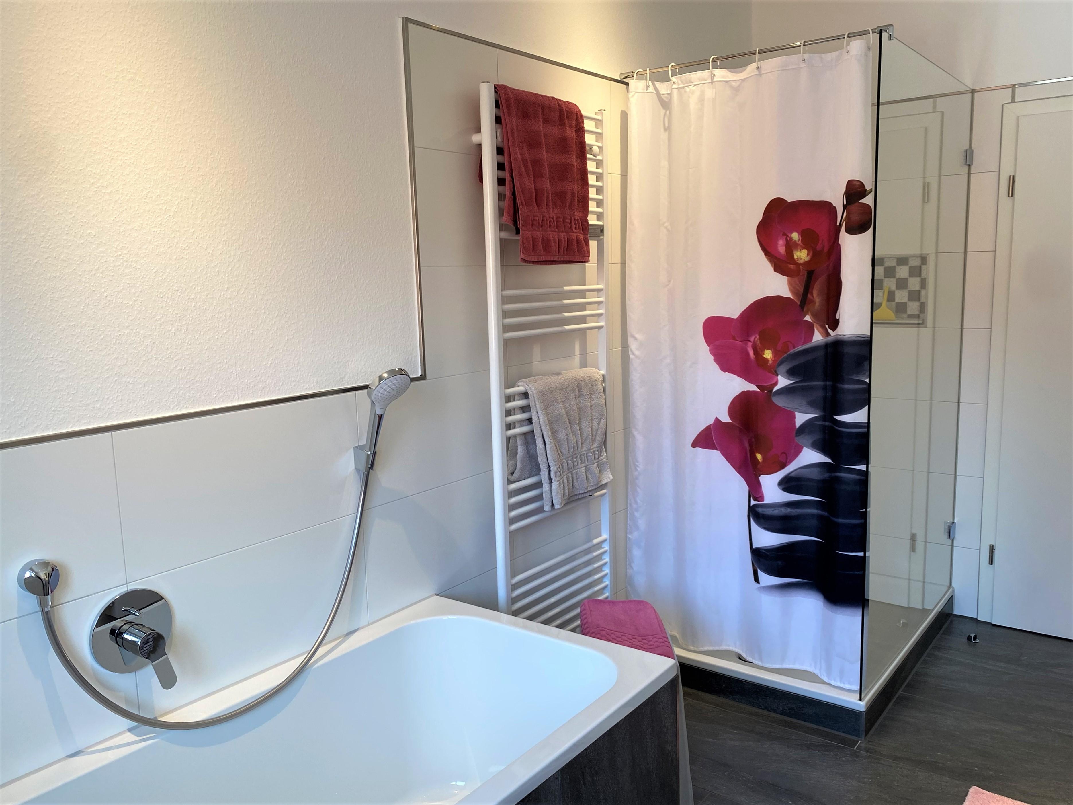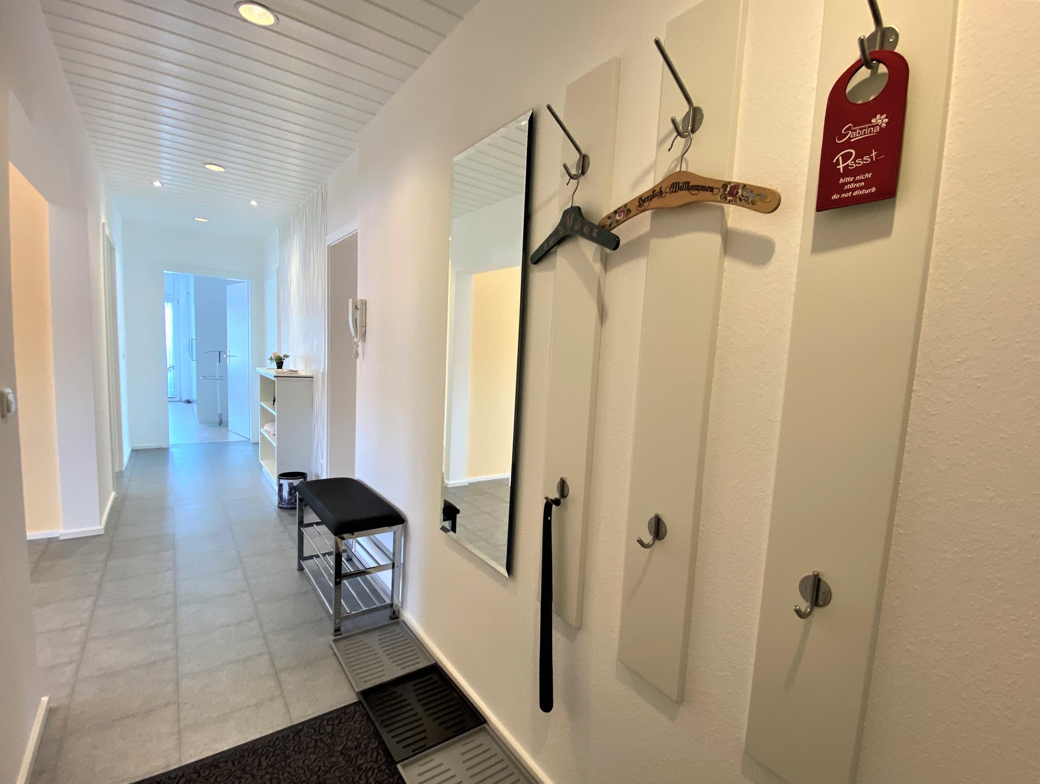 Bad mit großer flacher Duschwanne, Badewanne, Toilette, Waschtisch, Spiegelschrank, Ablage und Handtuchwärmer. Diele mit Garderobe und Schuhschrank.