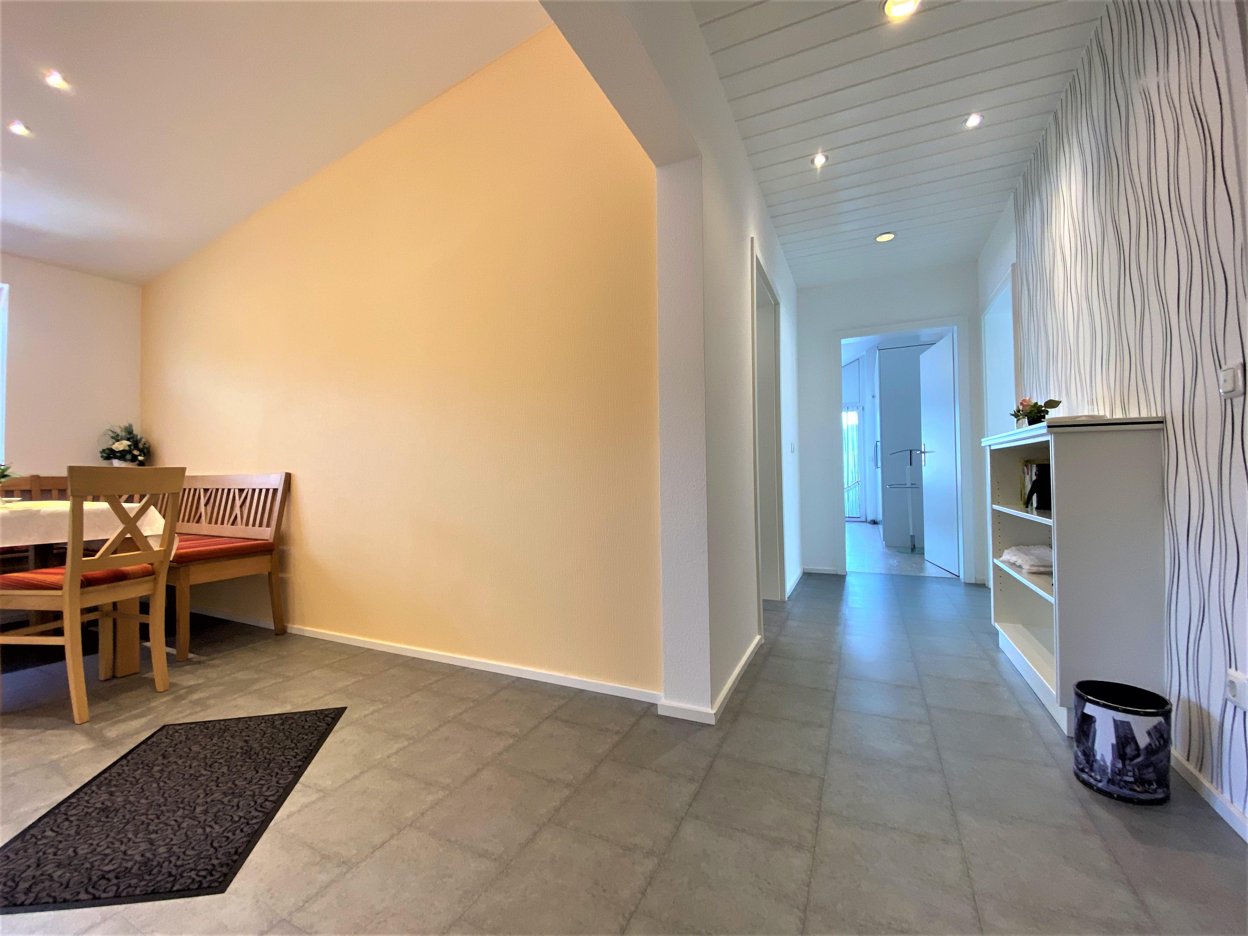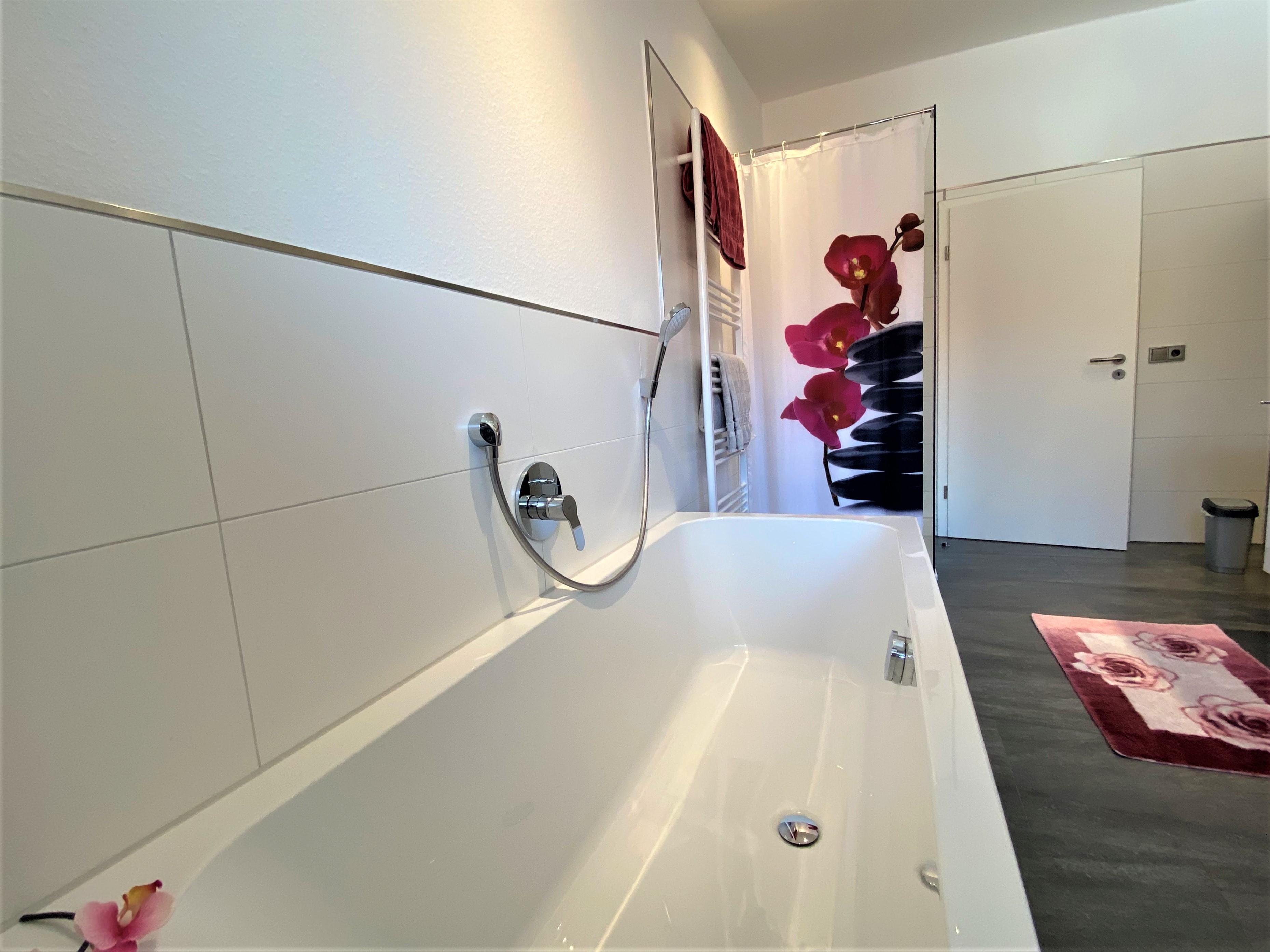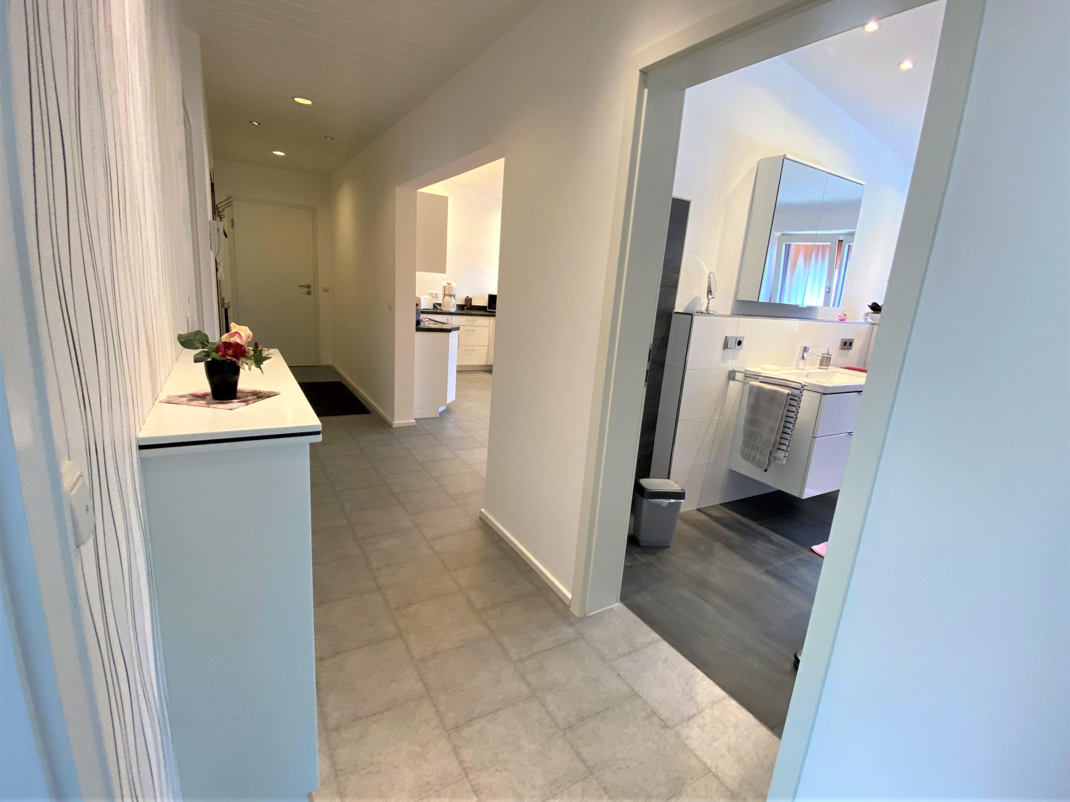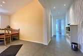 Bad mit großer flacher Duschwanne, Badewanne, Toilette, Waschtisch, Spiegelschrank, Ablage und Handtuchwärmer. Diele mit Garderobe und Schuhschrank.
