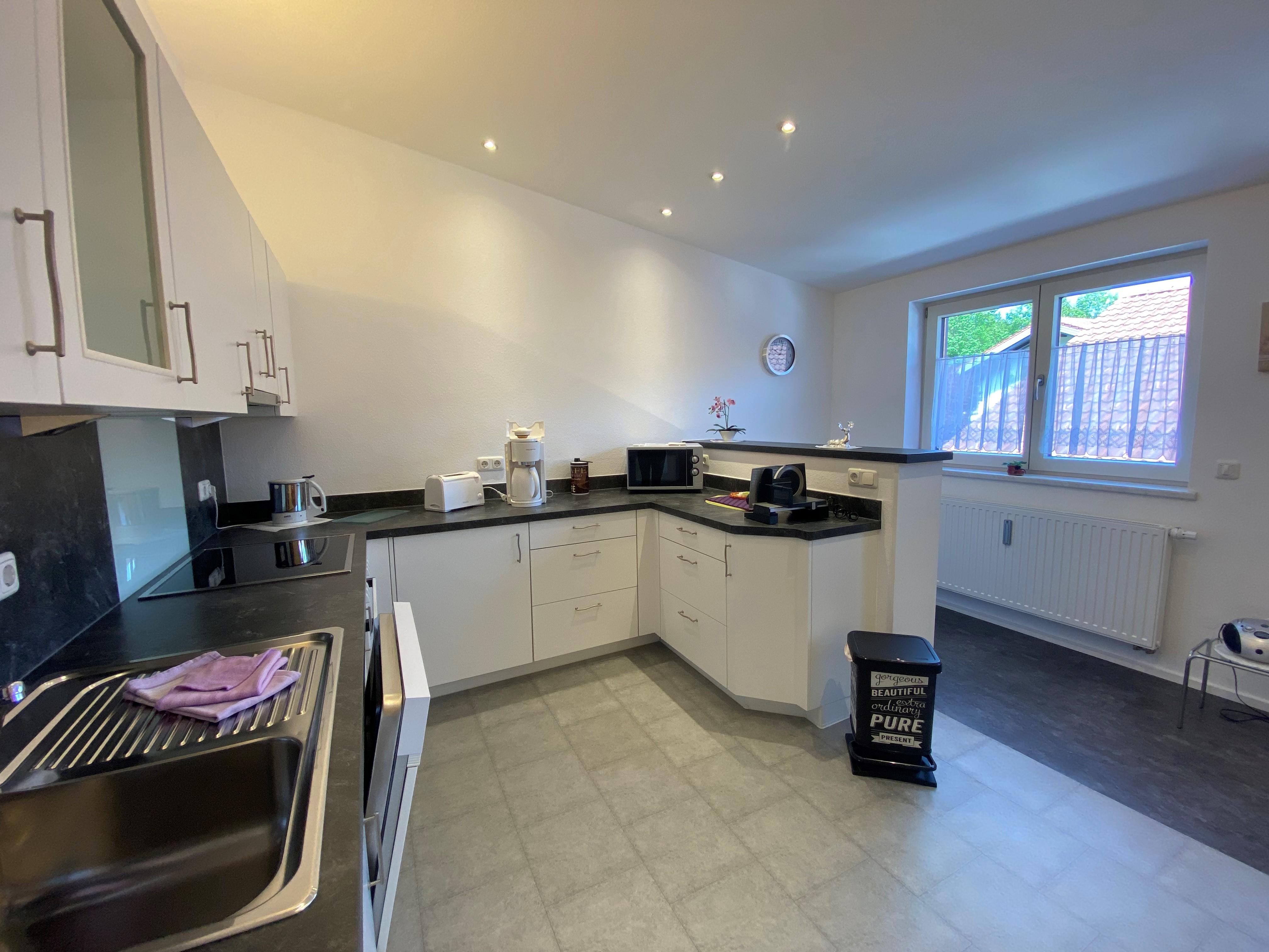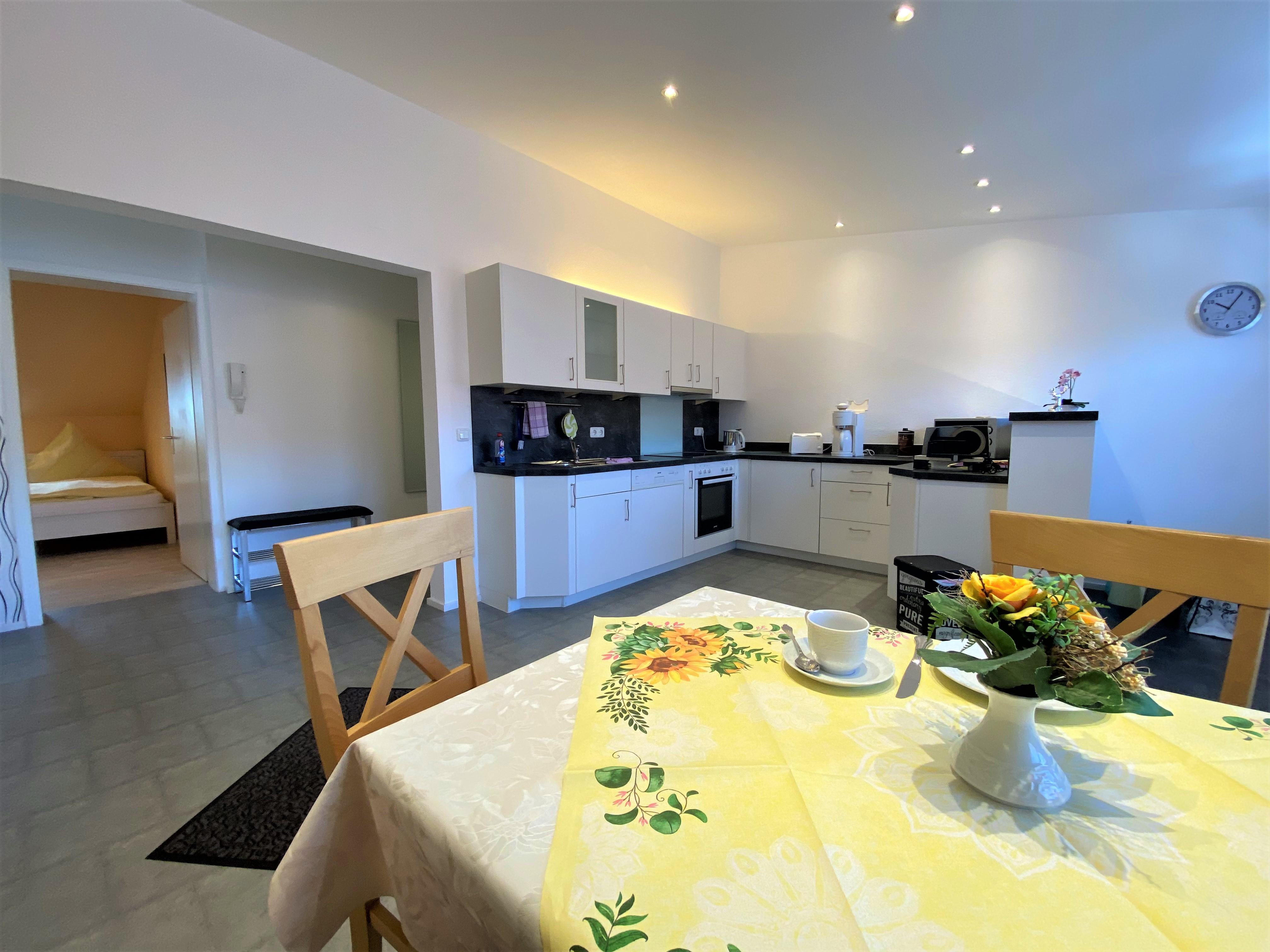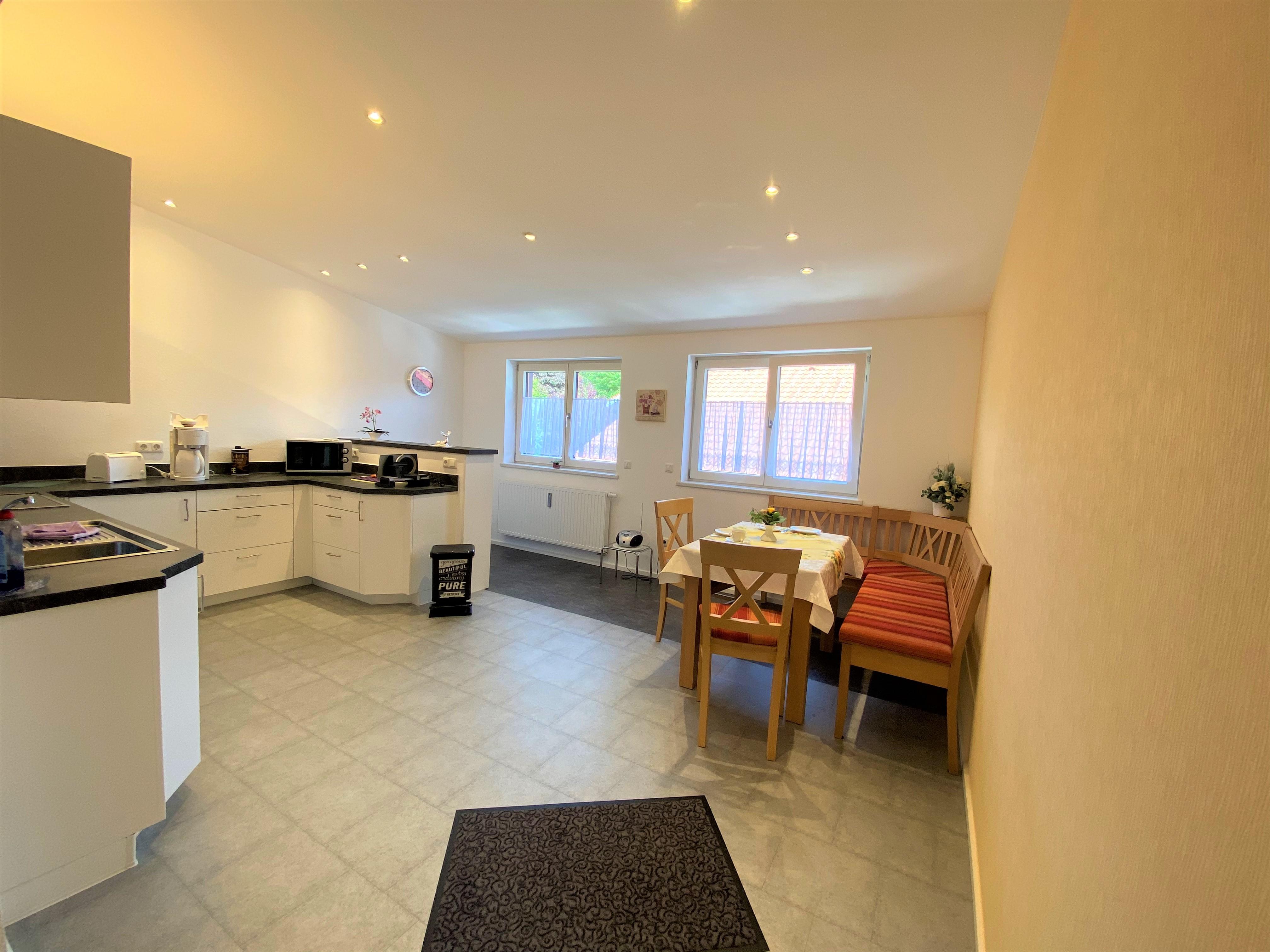 Küche komplett mit Cerankochfeld, Spülmaschine, Mikrowelle usw. ausgestattet. Gemütliche Eckbank mit Tischgarnitur.