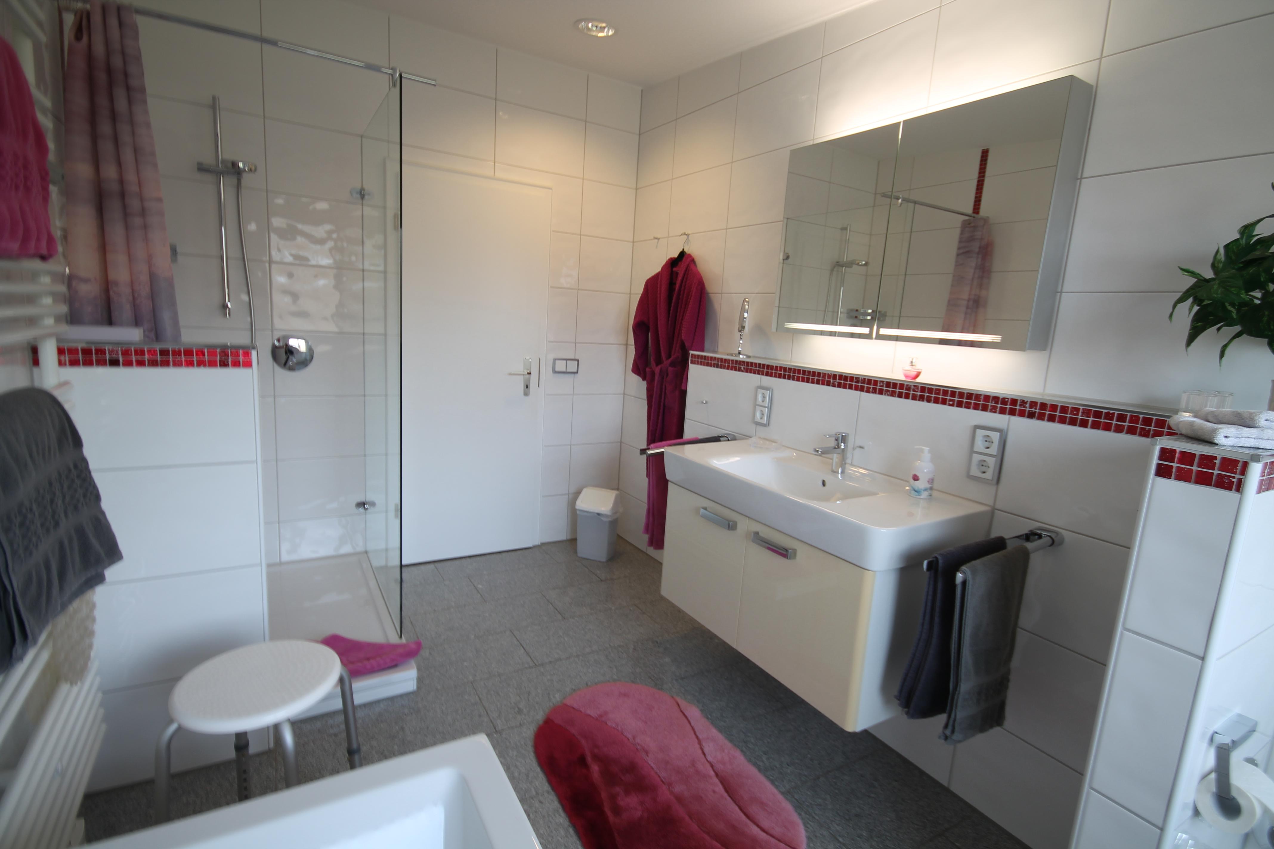 Bad mit Dusche, Badewanne, Toilette, Bidet, Doppelwaschbecken-Spiegel u. Badschrank.