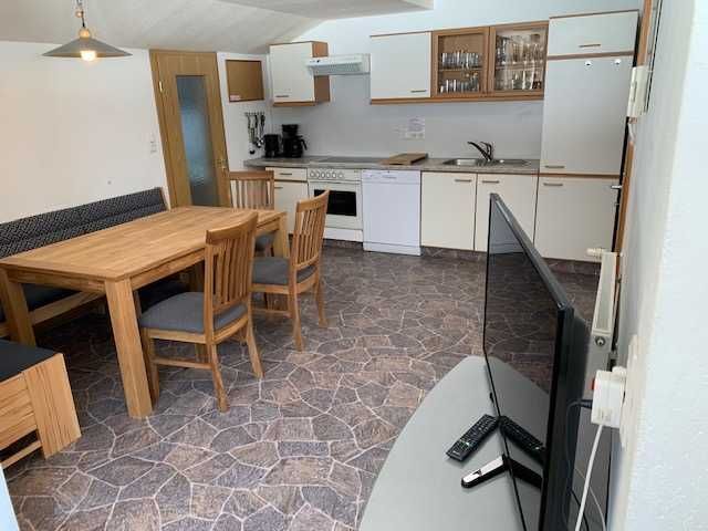 Rustikal ausgestattet mit einer Wohnküche ,gemütlicher Essecke mit Eckbank, Kabel/TV ,ein Schlafzimmer mit Doppelbett ,ein kleiner Tisch mit Stuhl  ,DU/WC, Balkon