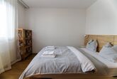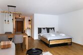 Geräumiges Wohn- und Esszimmer mit 1x Doppelbett (1.60m) und einer Schlafcouch für 2 Personen (1.4m)