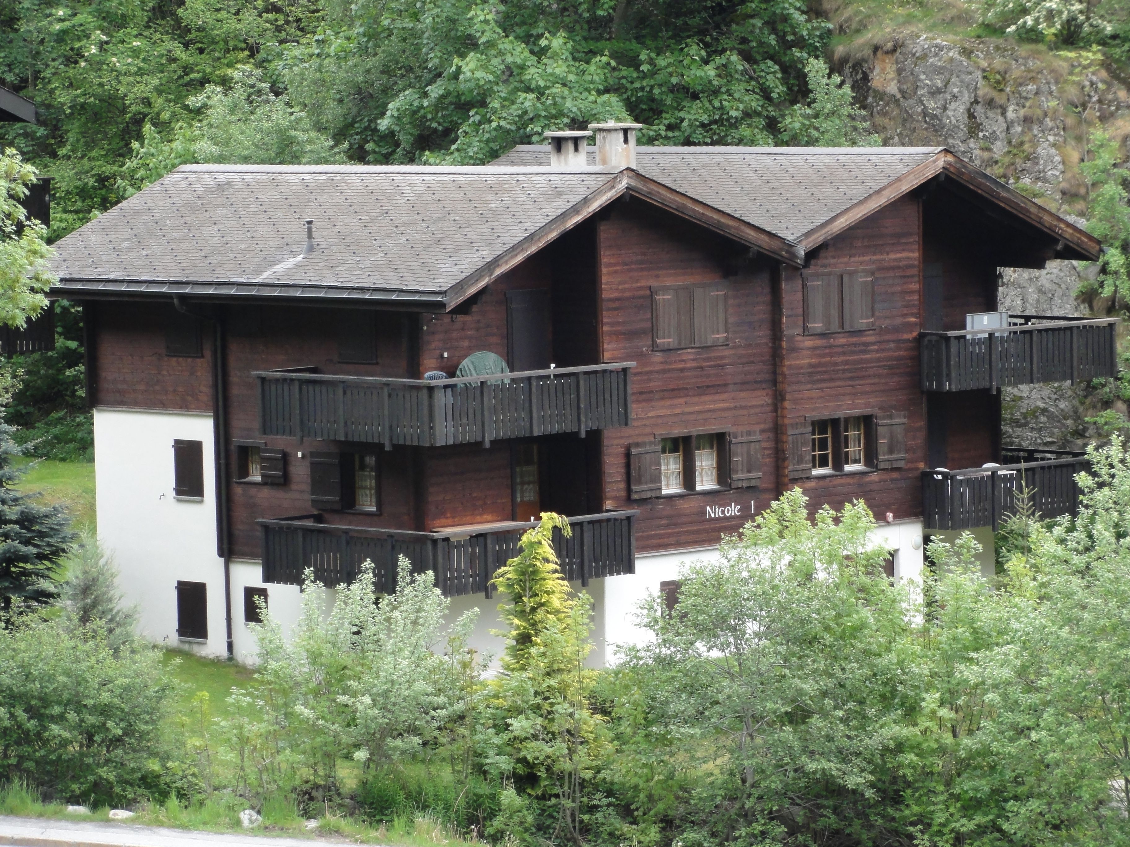 Im Außenbereich der Wohnung finden Sie einen Parkplatz direkt vor dem Haus. Die Lage am Eingang des Dorfes sorgt für eine ruhige Atmosphäre, während ein kleines Bächlein direkt zwischen Haus und Straße, die nach Blatten führt.