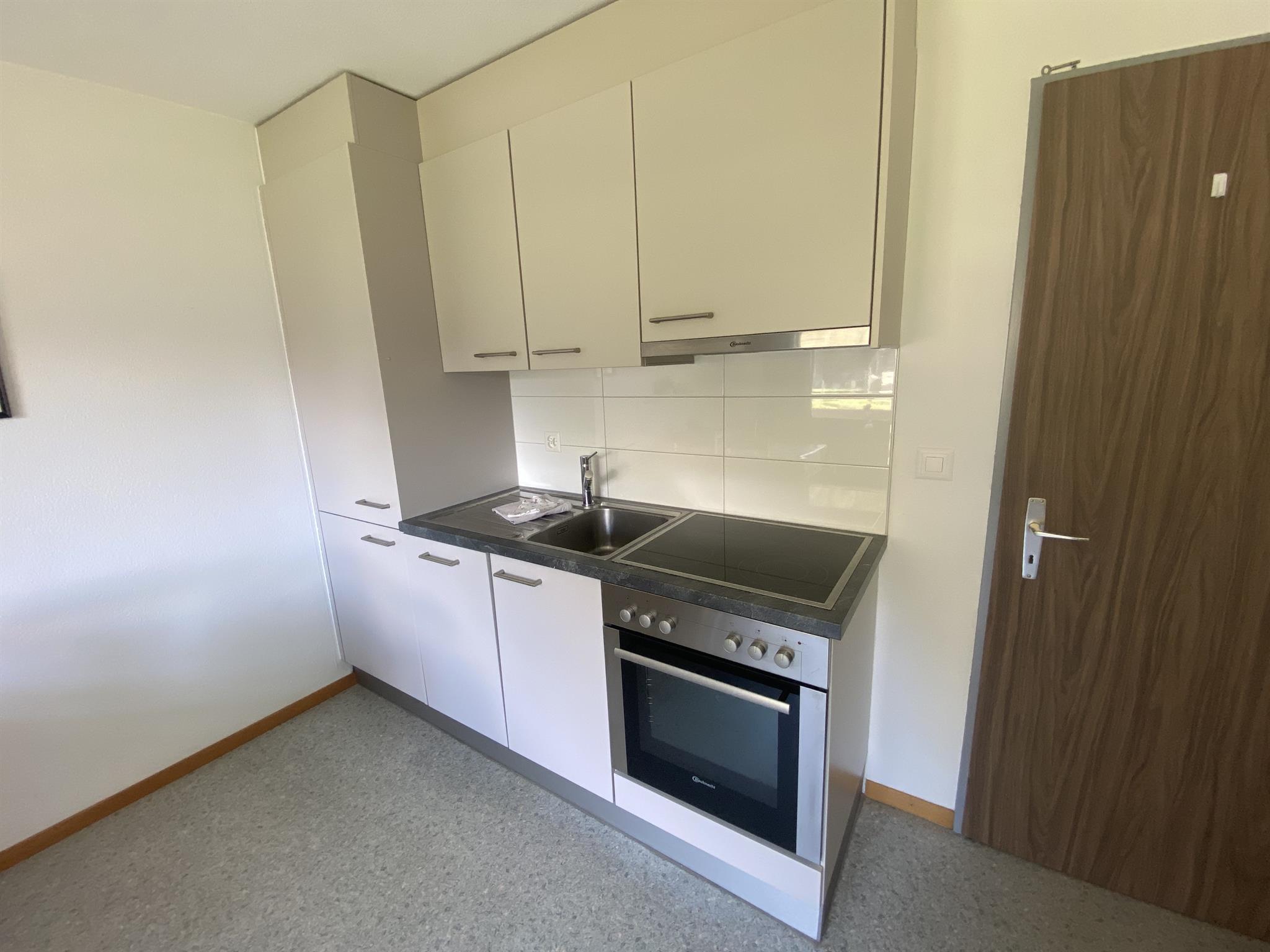 Die geschlossene, gut ausgestattete Küche verfügt über einen Esstisch und ebenfalls Zugang zum Südbalkon. Zur Ausstattung gehören eine Geschirrspülmaschine, eine Kaffeemaschine (Nescafé Dolce Gusto), Fondue-Geschirr und ein Racletteofen – ideal für gemütliche Abende.
