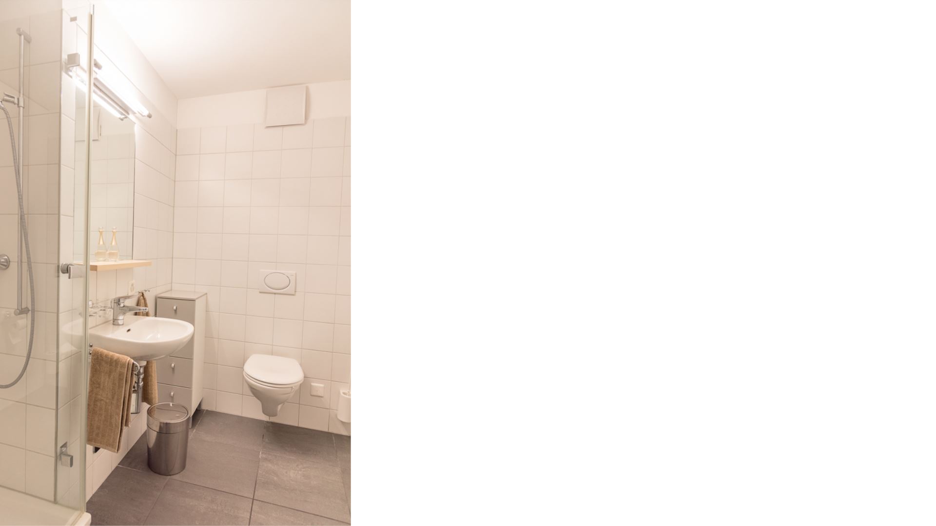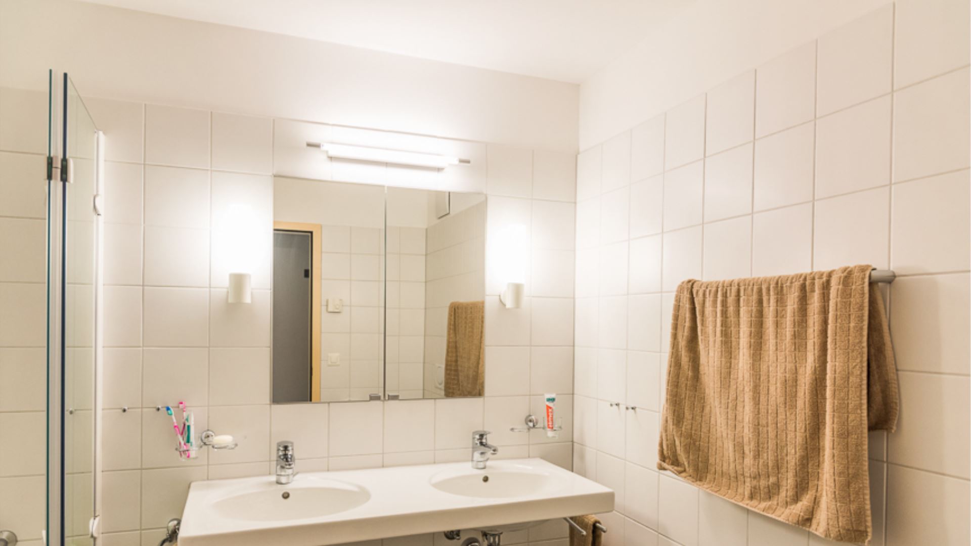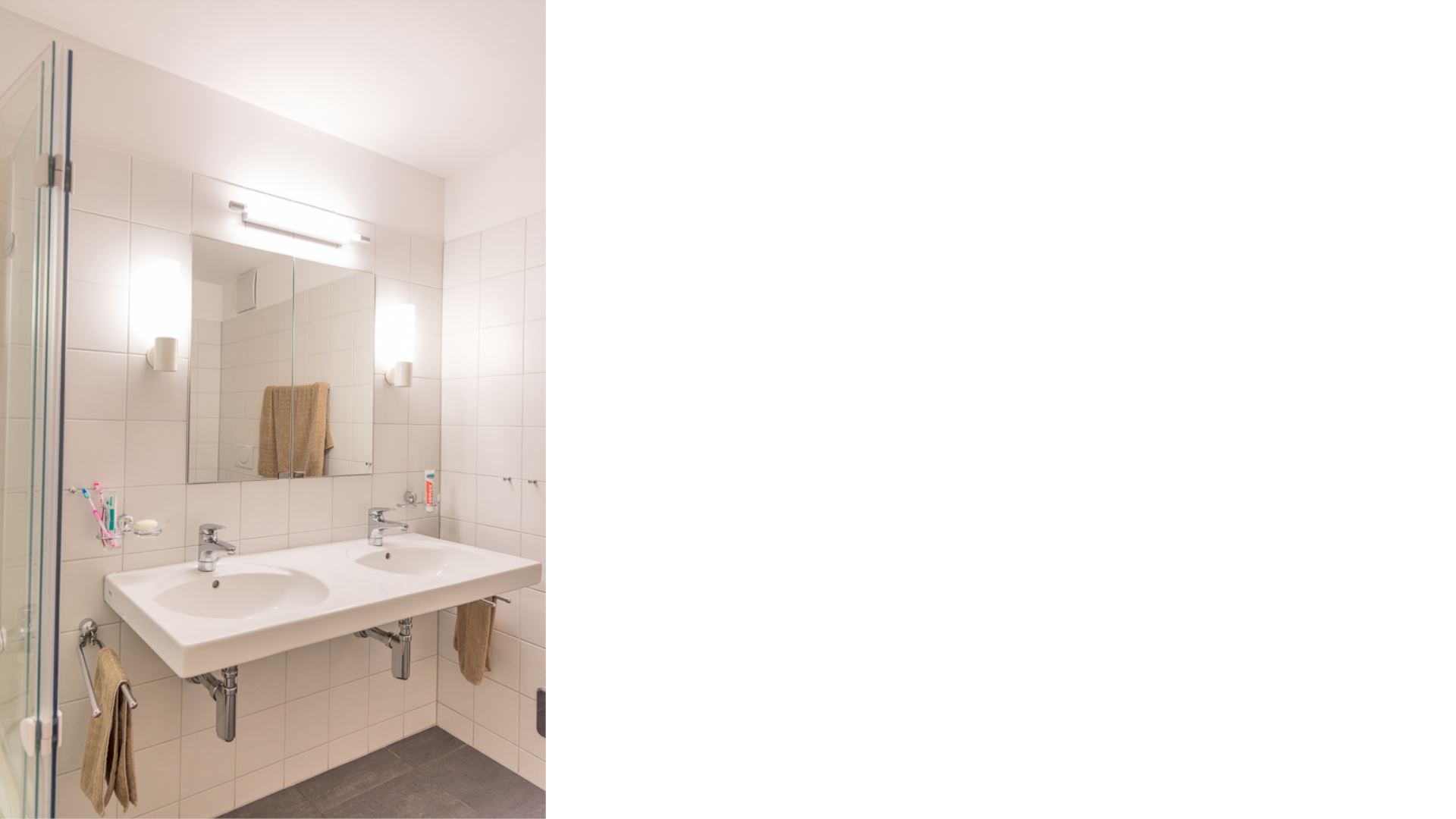 Die Wohnung verfügt über zwei Badezimmer: das erste mit Doppelwaschbecken, Toilette und Badewanne; das zweite mit Duschkabine, Einzelwaschbecken und Toilette. Es gibt auch ein Fernsehzimmer mit einem Dreisitzer-Sofa.