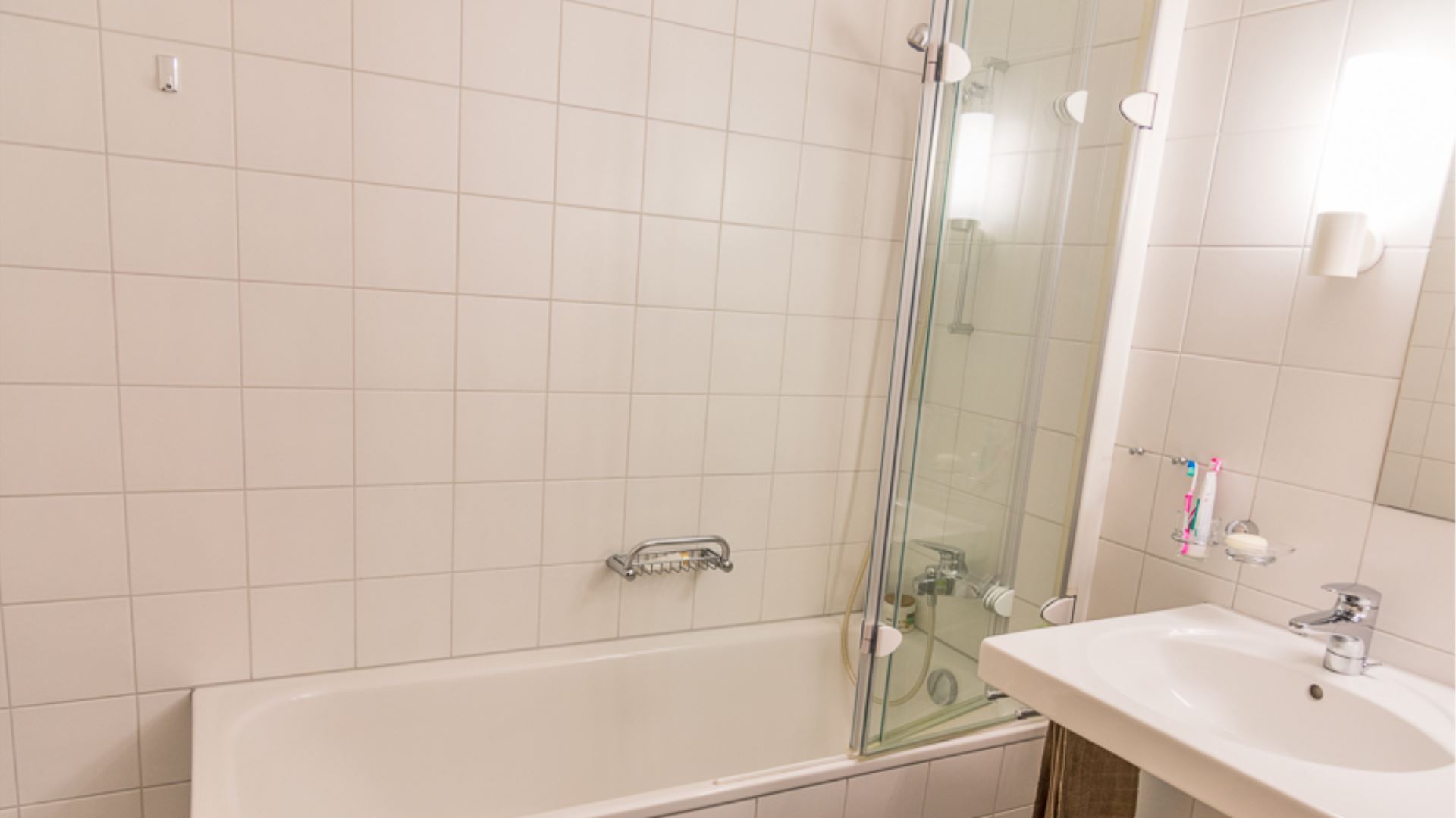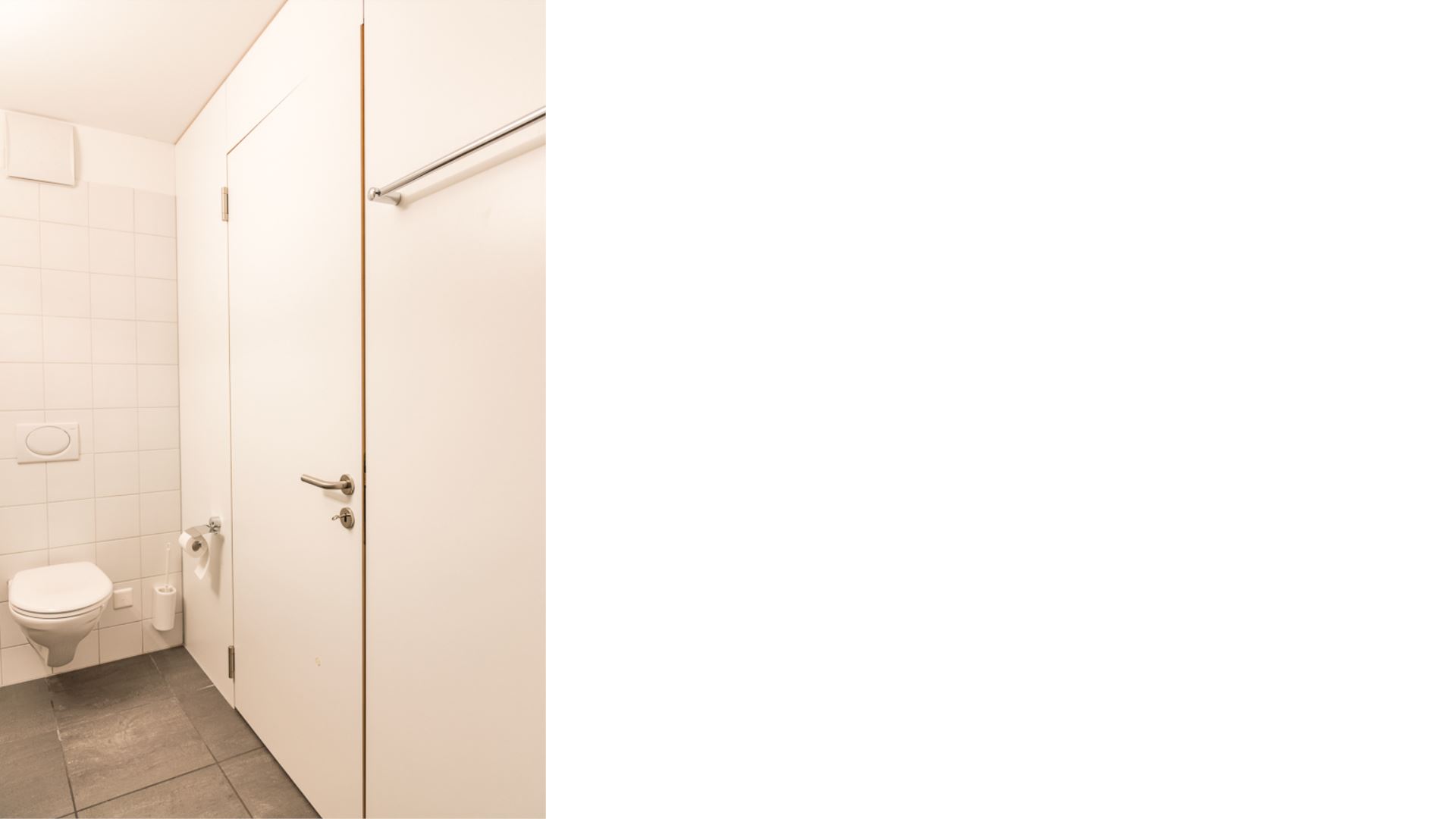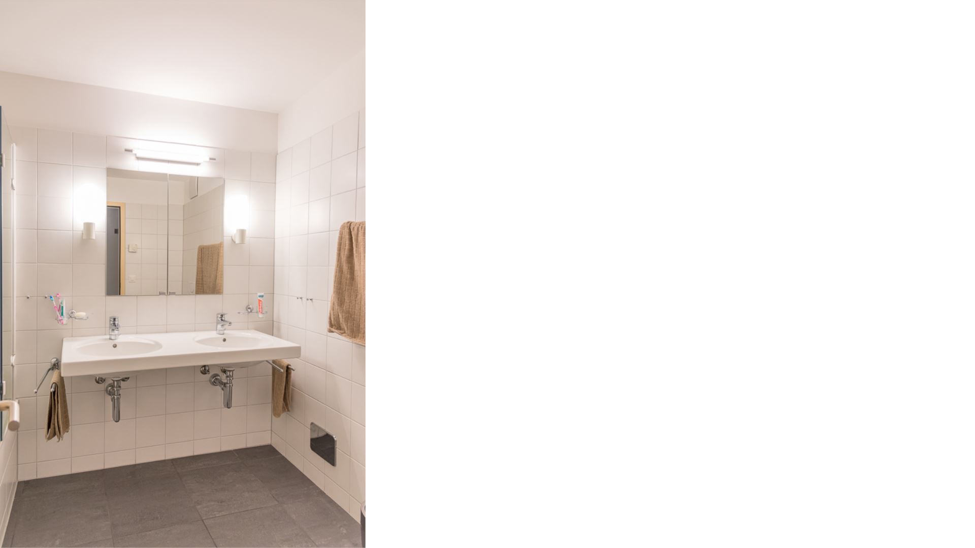 Die Wohnung verfügt über zwei Badezimmer: das erste mit Doppelwaschbecken, Toilette und Badewanne; das zweite mit Duschkabine, Einzelwaschbecken und Toilette. Es gibt auch ein Fernsehzimmer mit einem Dreisitzer-Sofa.