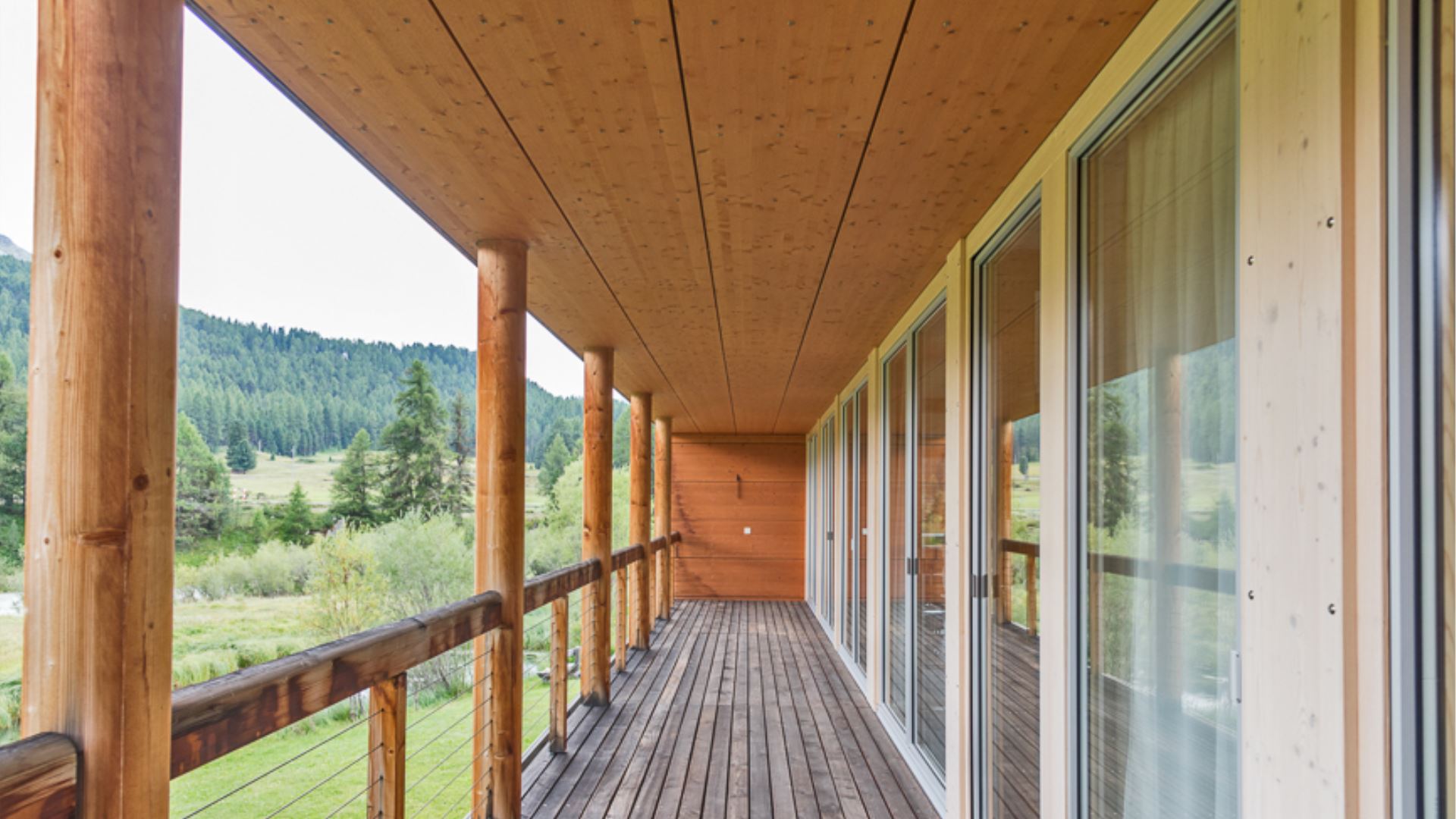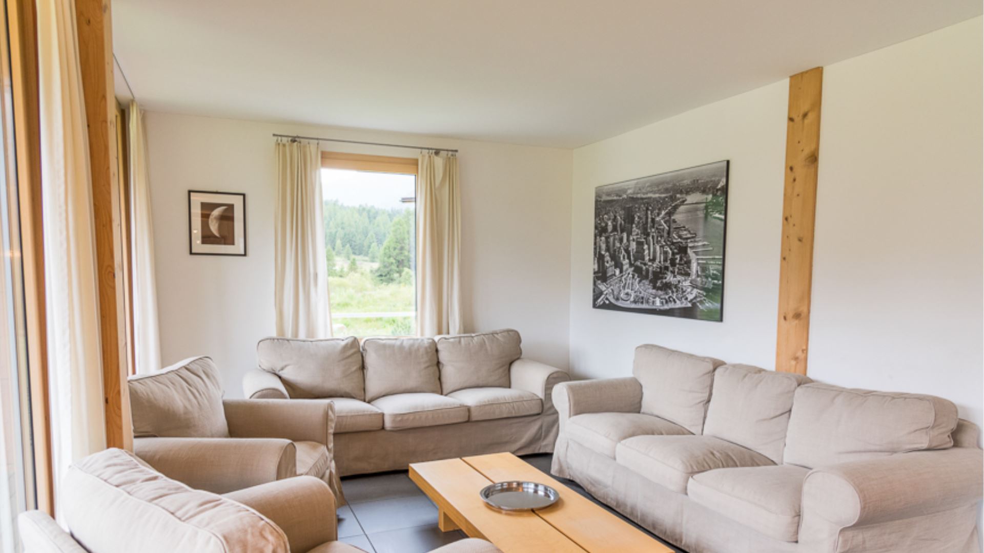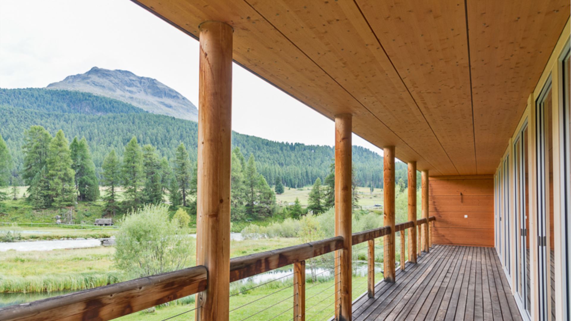 Das Wohnzimmer mit offener Küche schafft eine besonders einladende Atmosphäre. Die Terrasse, die sich entlang des Wohnzimmers und des Fernsehzimmers erstreckt, bietet einen unvergleichlichen Blick auf die Berge des schönen Engadins.