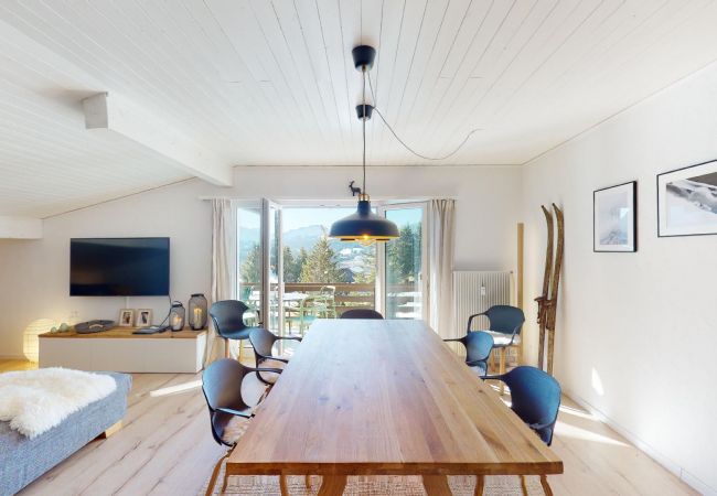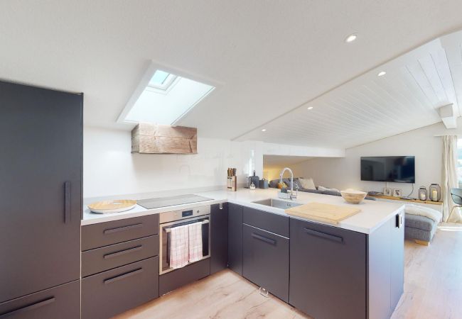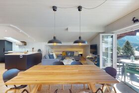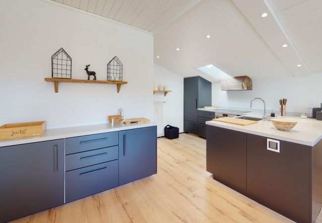 Das lichtdurchflutete Wohnzimmer ist geschmackvoll eingerichtet, und die moderne, sehr gut ausgestattete Küche verfügt über einen Geschirrspüler, Backofen, eine Kaffeemaschine sowie ein Raclette- und Fondue-Set.