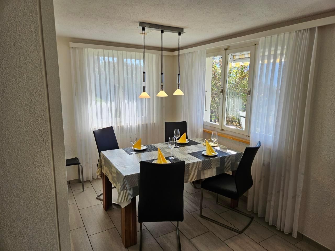 Im Außenbereich lädt der große Garten zum Verweilen und Genießen ein. Hier finden Sie einen großen Esstisch, bequeme Liegestühle und eine Feuerstelle zum Grillen – perfekt, um den Tag in geselliger Runde ausklingen zu lassen. Die Aussicht vom Garten aus bietet ein spektakuläres Panorama, das die Schönheit der Schweizer Alpen in voller Pracht einfängt.
