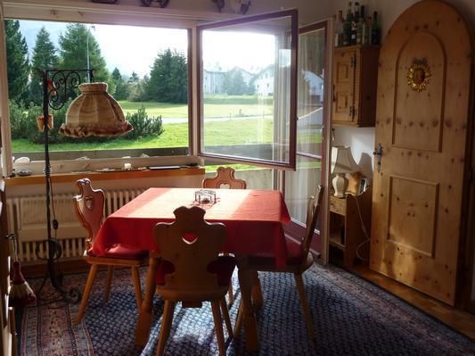 Allegria Schöne 4-Zimmerwohnung (ca.97 m2) im erhöhten Erdgeschoss mit Arvenholz-Möblierung & Parkett. Wohnzimmer zur Südseite mit 3 Balkonen, integrierte Küche mit Spülmaschine. 2 Doppel-Schlafräume mit Blick Richtung St.Moritz; Zusatzbett in einem der Wohnzimmer. Kinderbett mit Bettwäsche vorhanden. Bad/Toilette & Dusche/Toilette. TV,Radio, CD- u. DVD-Player. Garage, Ski-& Waschraum; Spielwiese zur Allgemeinbenützung. Direkter Zugang zu Wanderwegen u. Langlauf-Loipen. Nahe der Luftseilbahn Furtschellas & des Silvaplana-Sees. Kurze Wege zu Supermarkt, Bushaltestelle, Dorfzentrum und Silser-See.