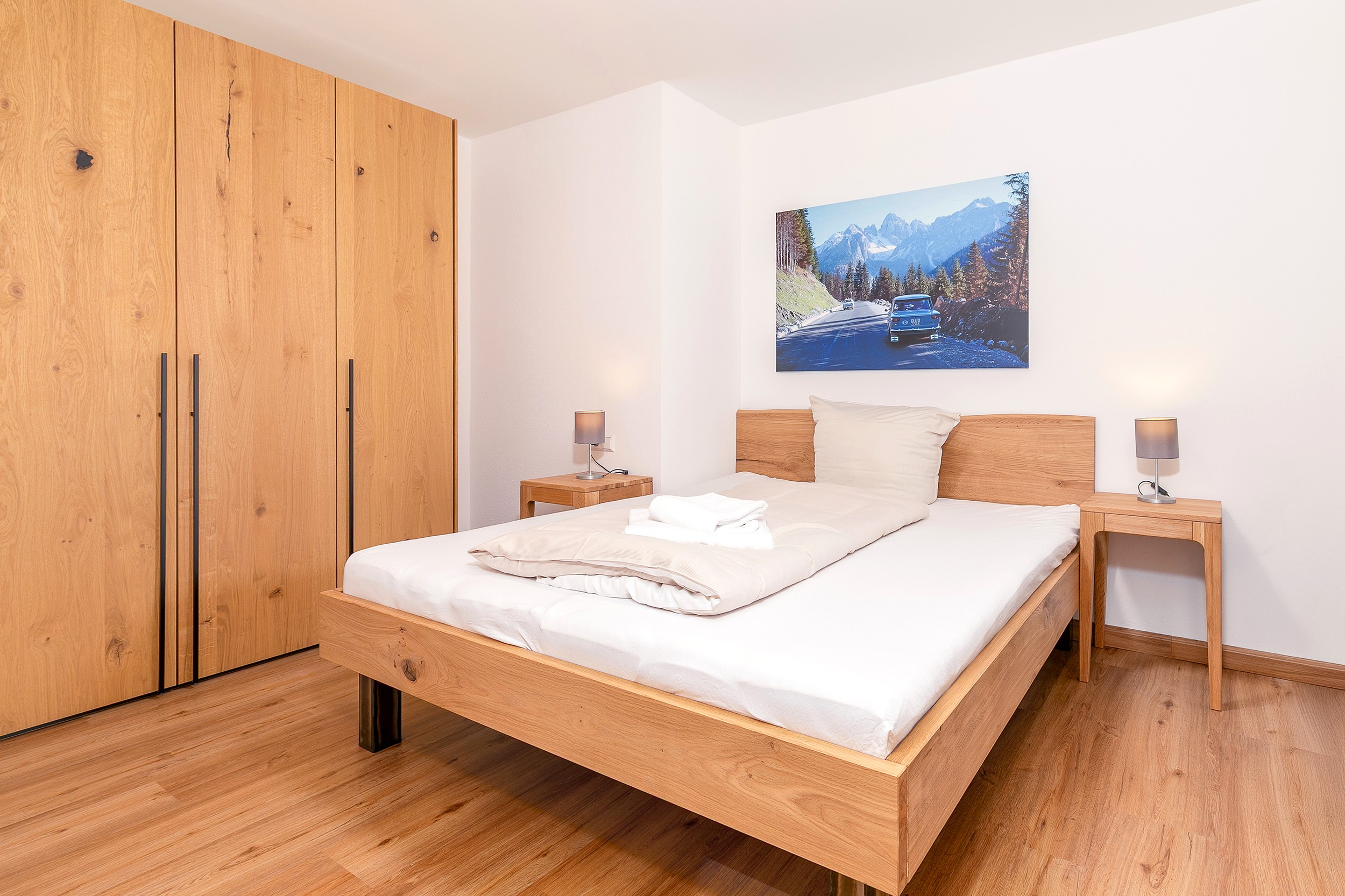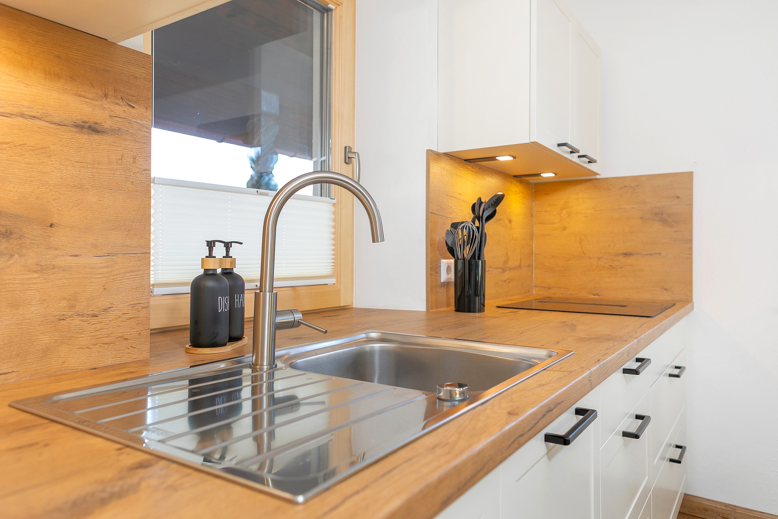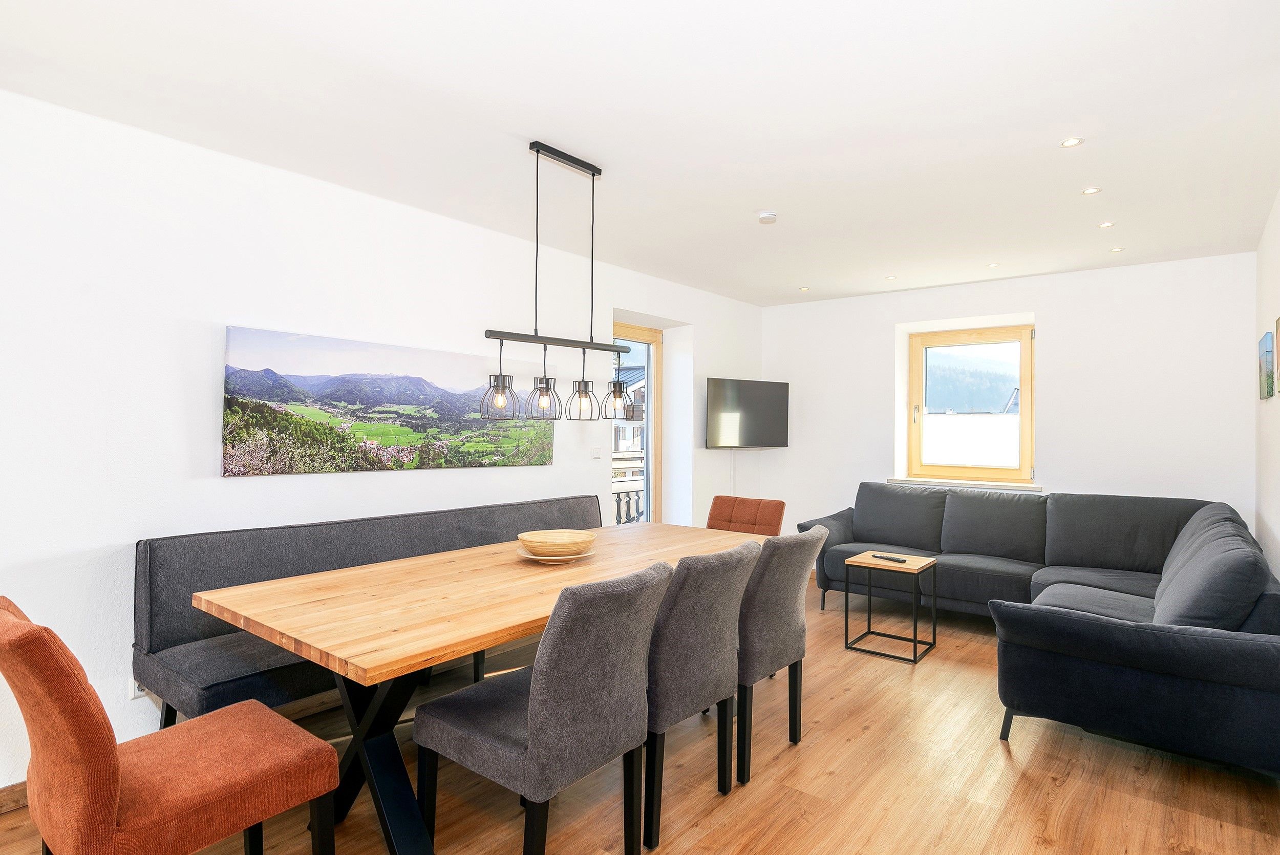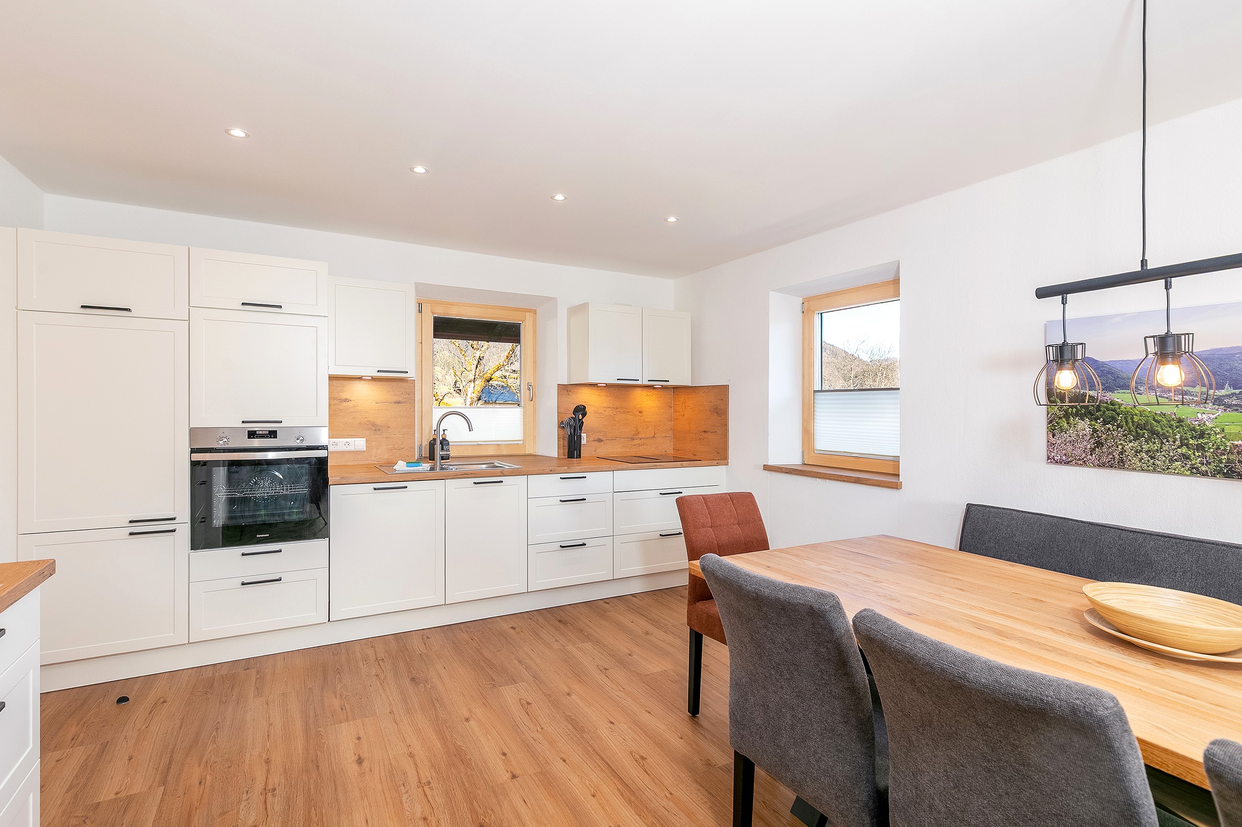 Die Küche ist ein wahres Highlight – voll ausgestattet mit hochwertigen Geräten, darunter ein Induktionsherd und ein Waschtrockner. Durch die vielen Fenster in der Wohnung strömt das natürliche Licht, was eine besonders einladende und warme Atmosphäre schafft. WLAN und ein Smart-TV sorgen für zusätzlichen Komfort, während Sie sich nach einem aktiven Tag in den Bergen entspannen können. Für Ihre Fahrräder oder Skier gibt es praktische Abstellmöglichkeiten.
