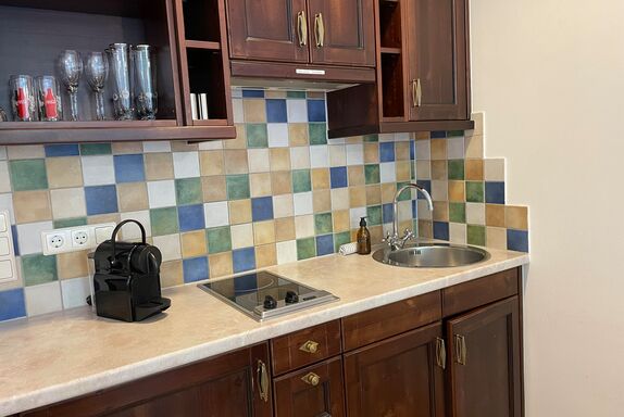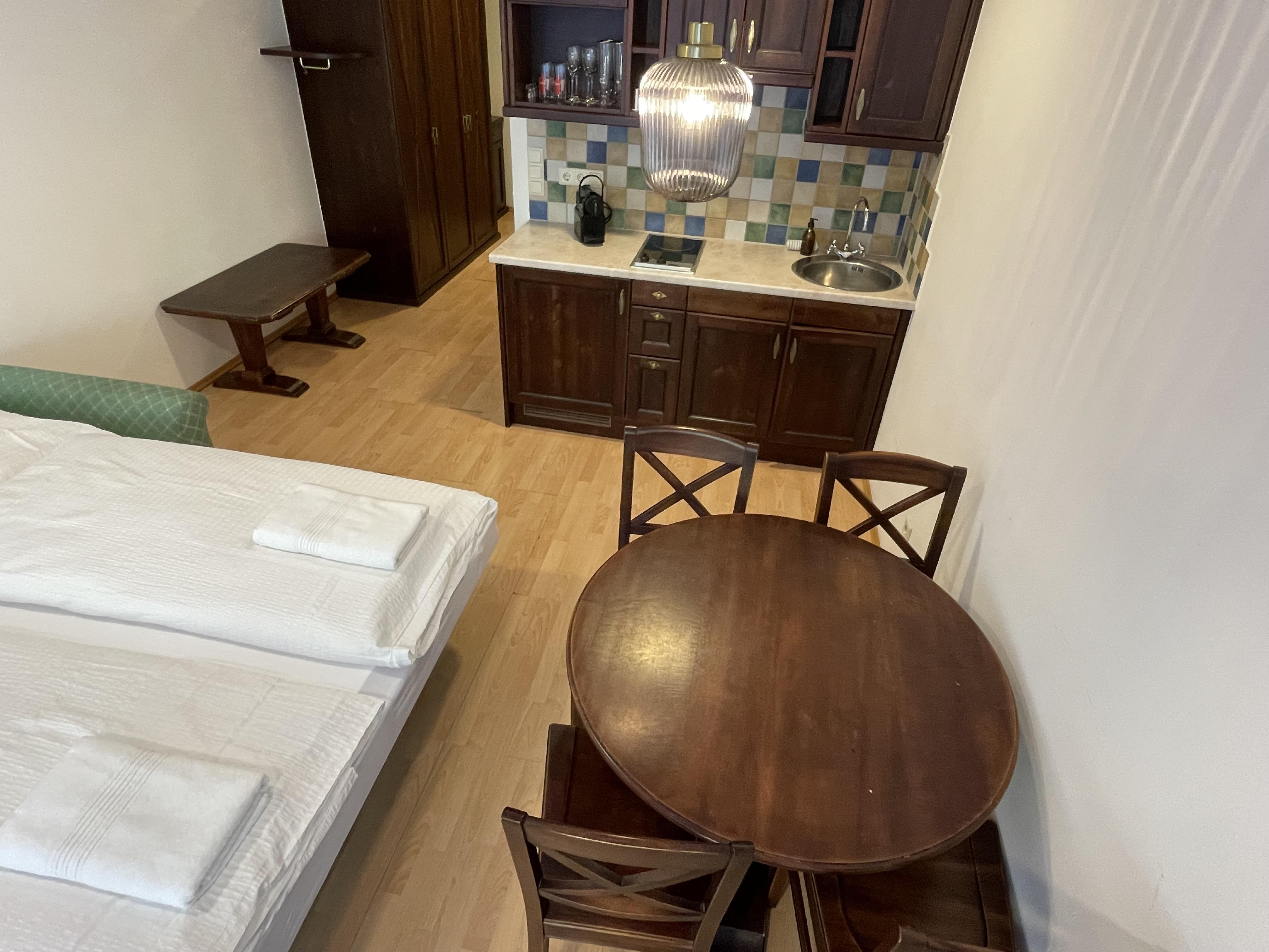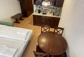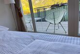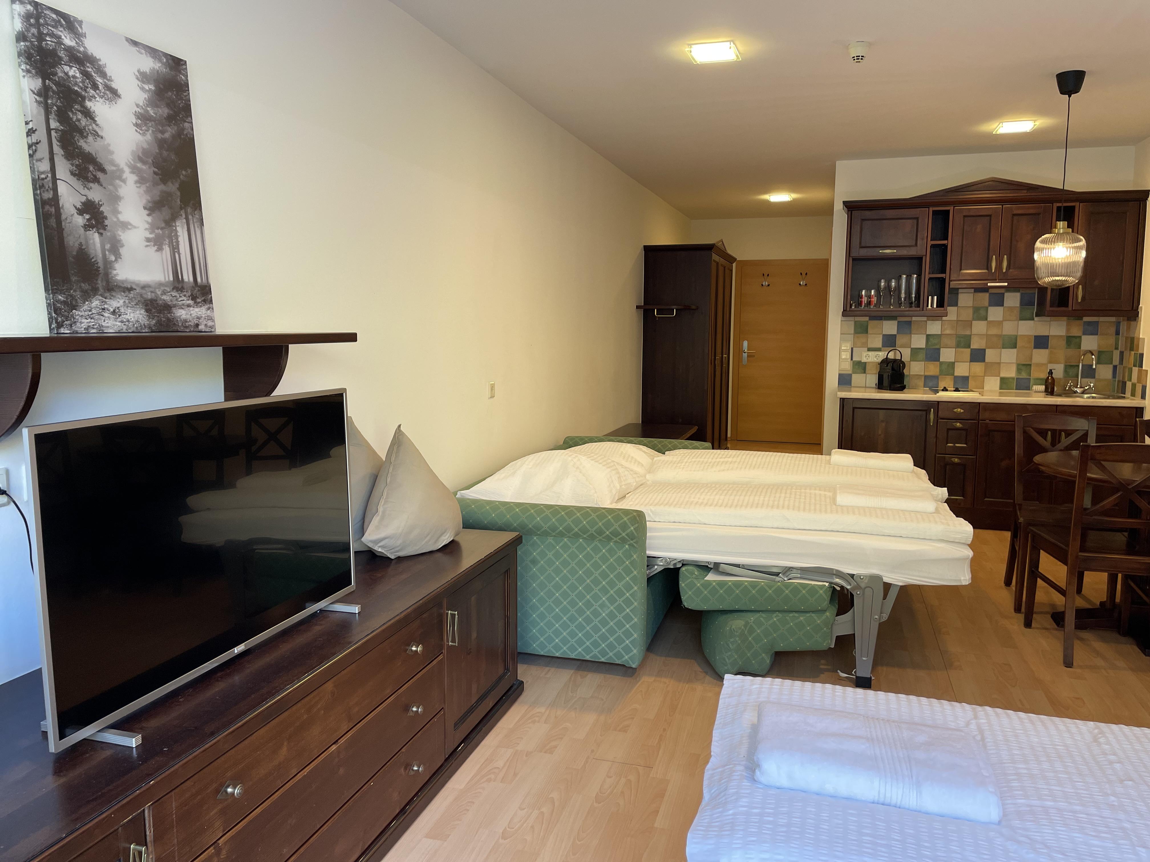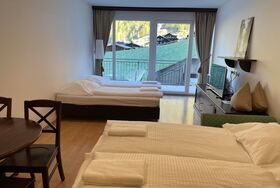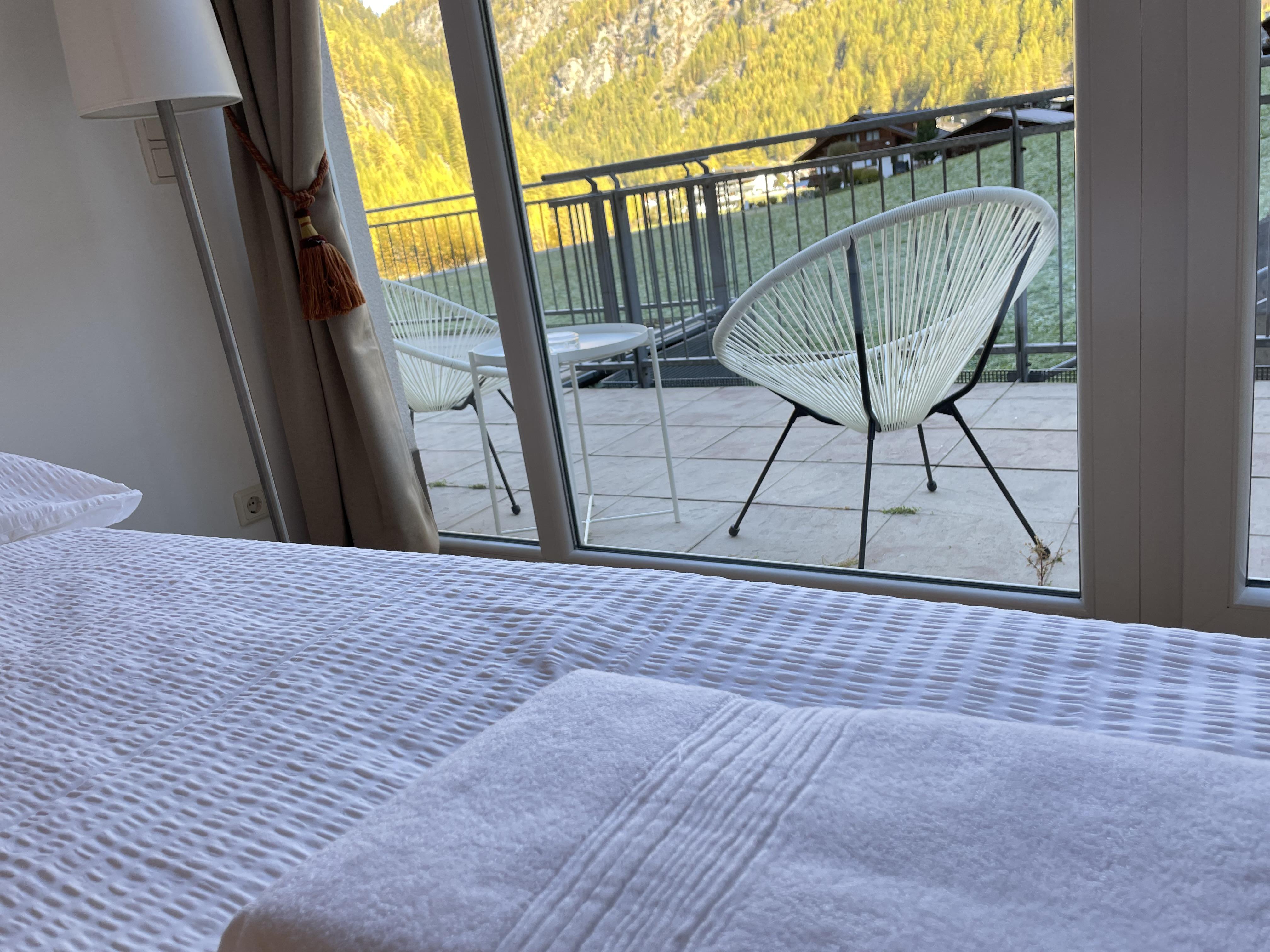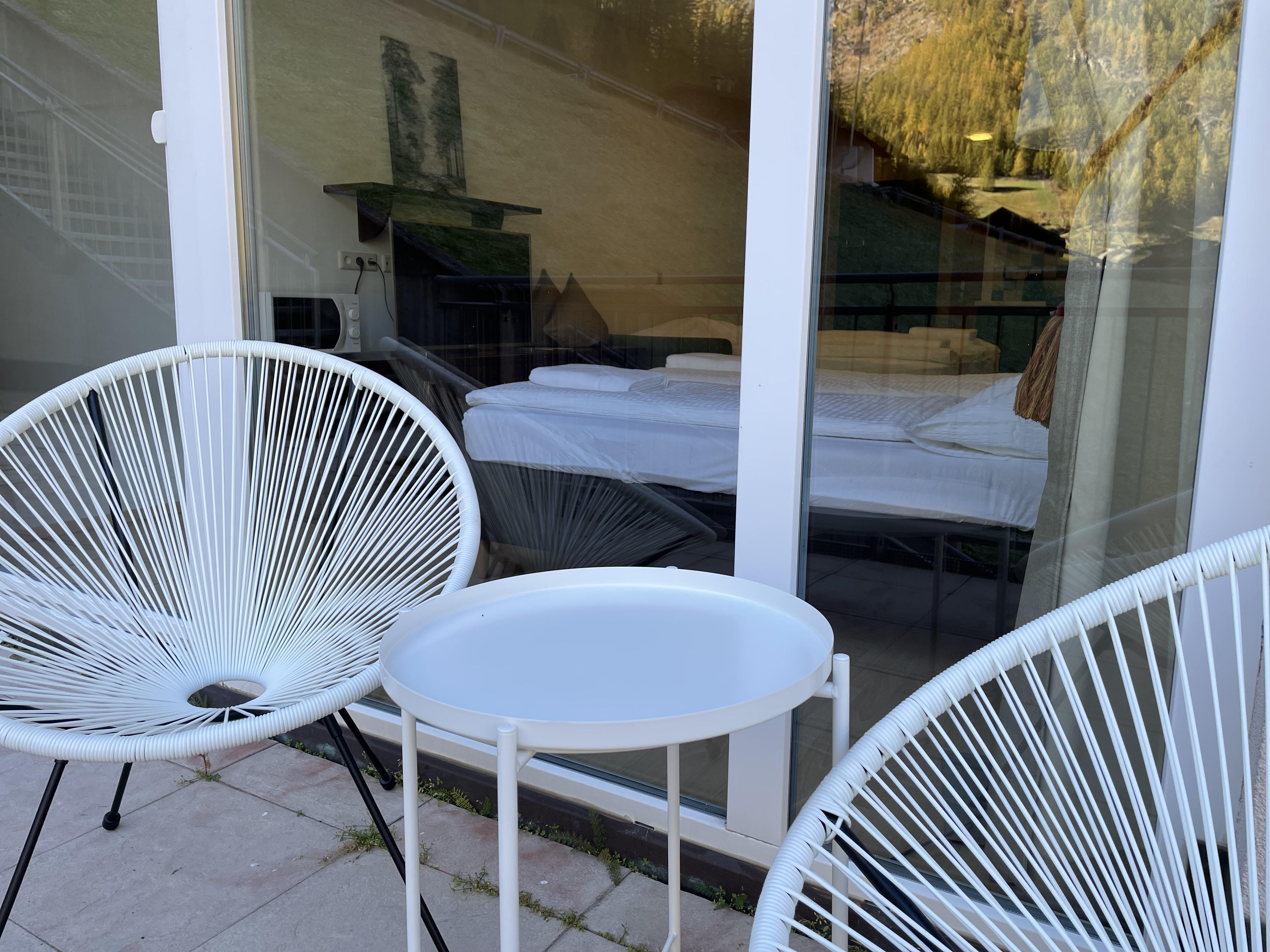 Das Studio (ZW 5) mit ca. 38 m² besteht aus einem Doppelbett, einer vollausgestatteten Wohnküche (2 Platten Elektroherd, Wasserkocher, Kühlschrank, Nespresso Kaffeemaschine, uvm.) mit einem Schlafsofa für zwei Personen, 1 Badezimmer mit Dusche und WC. Das einzigartige Bergpanorama kann auf der möblierten Terrasse genossen werden.
