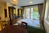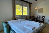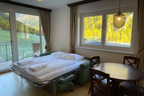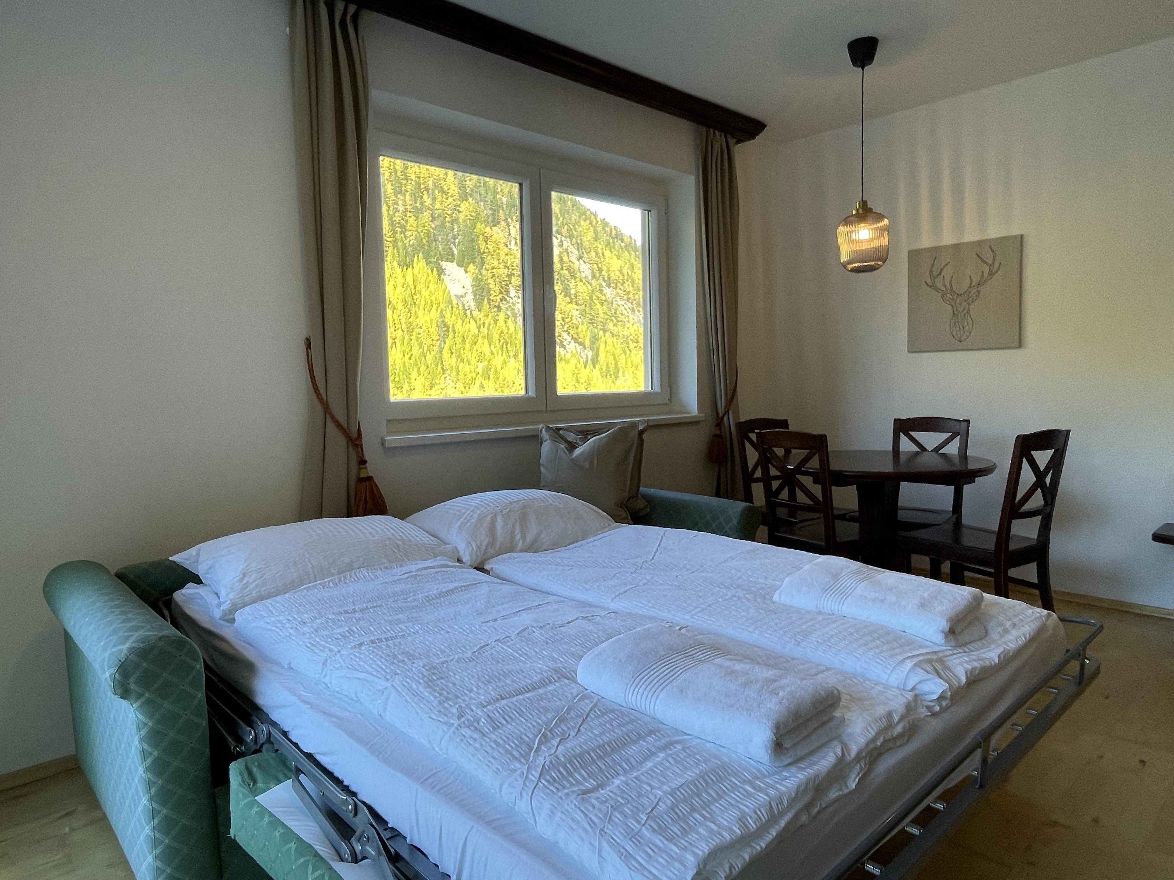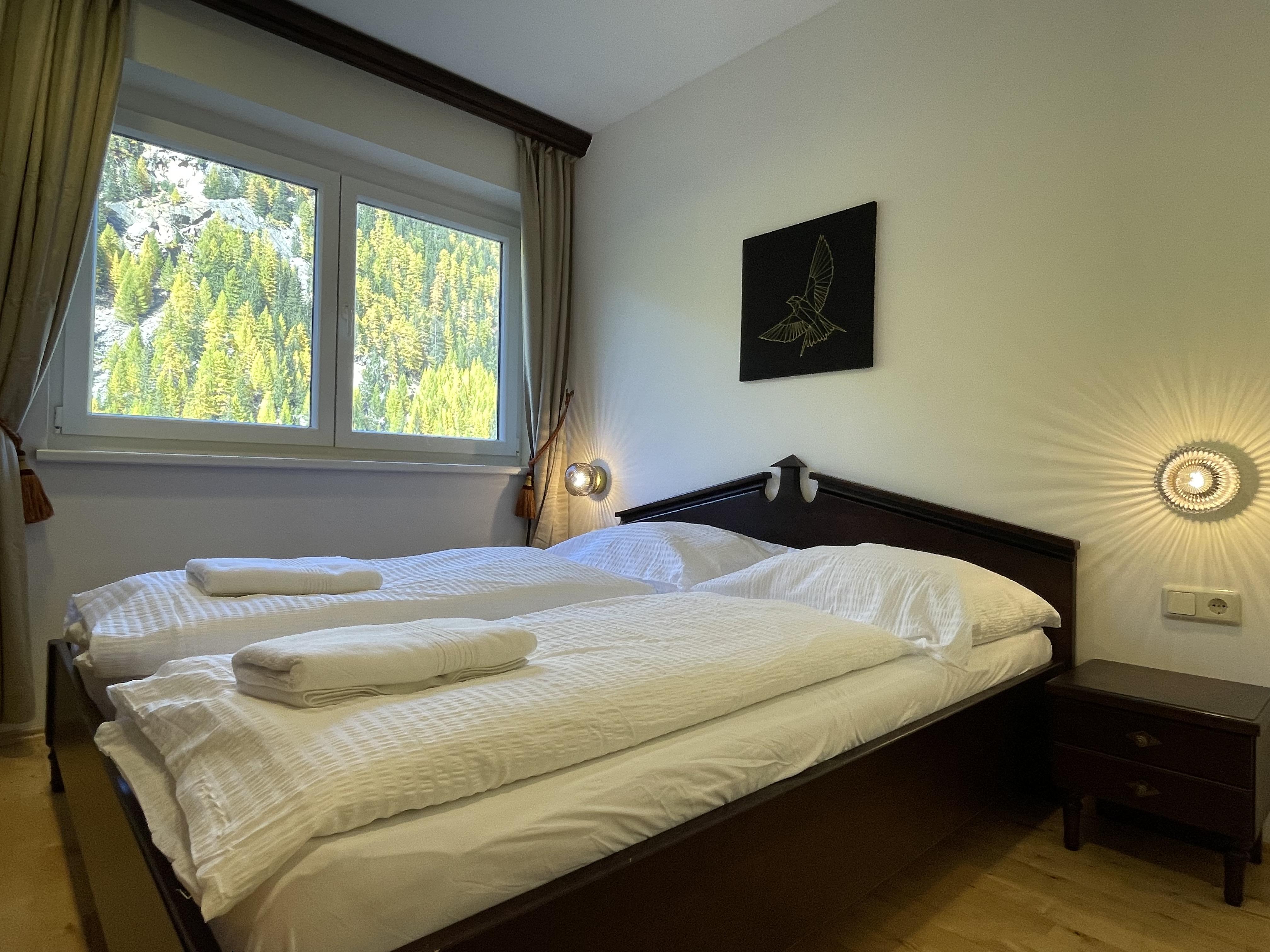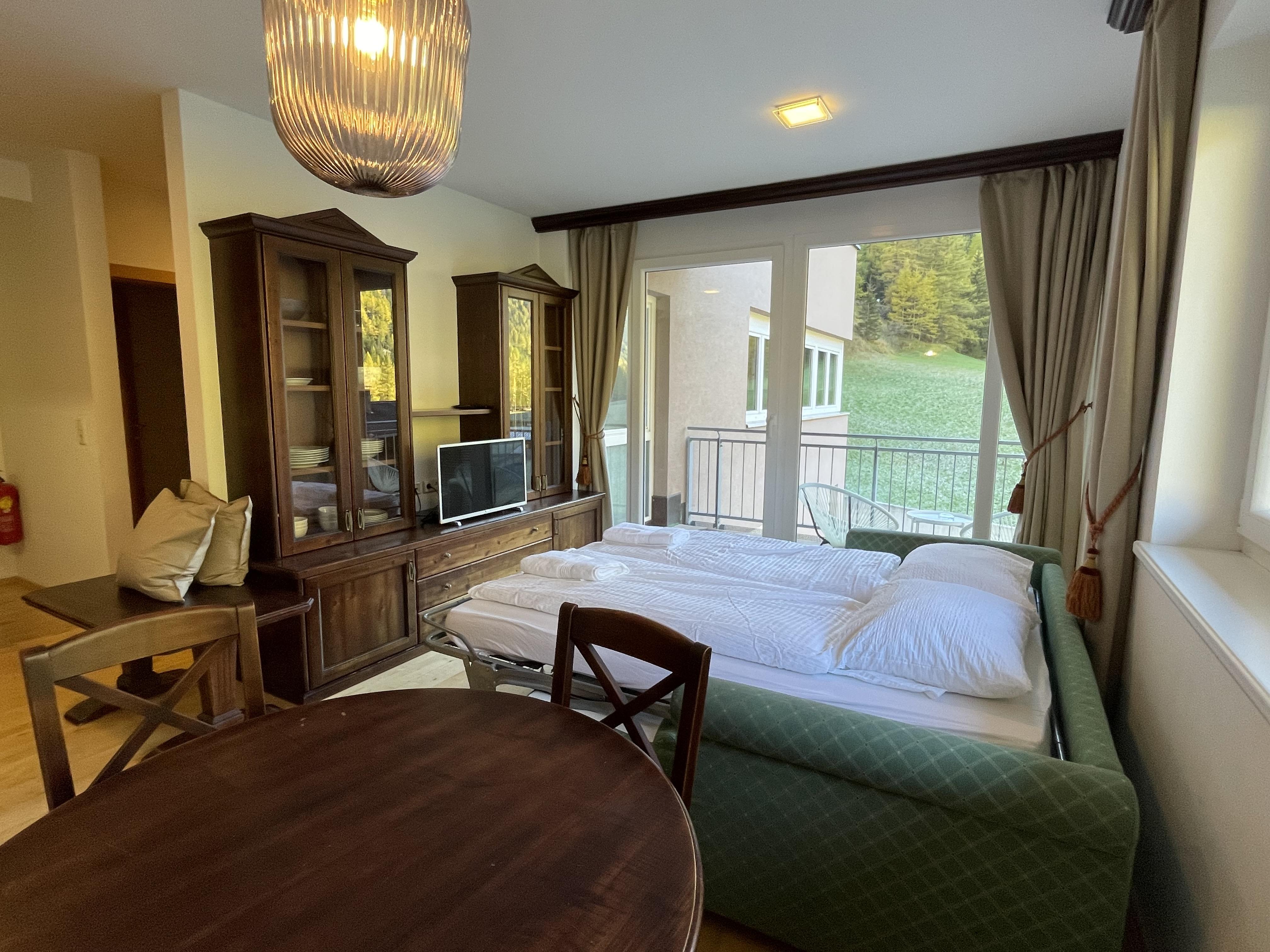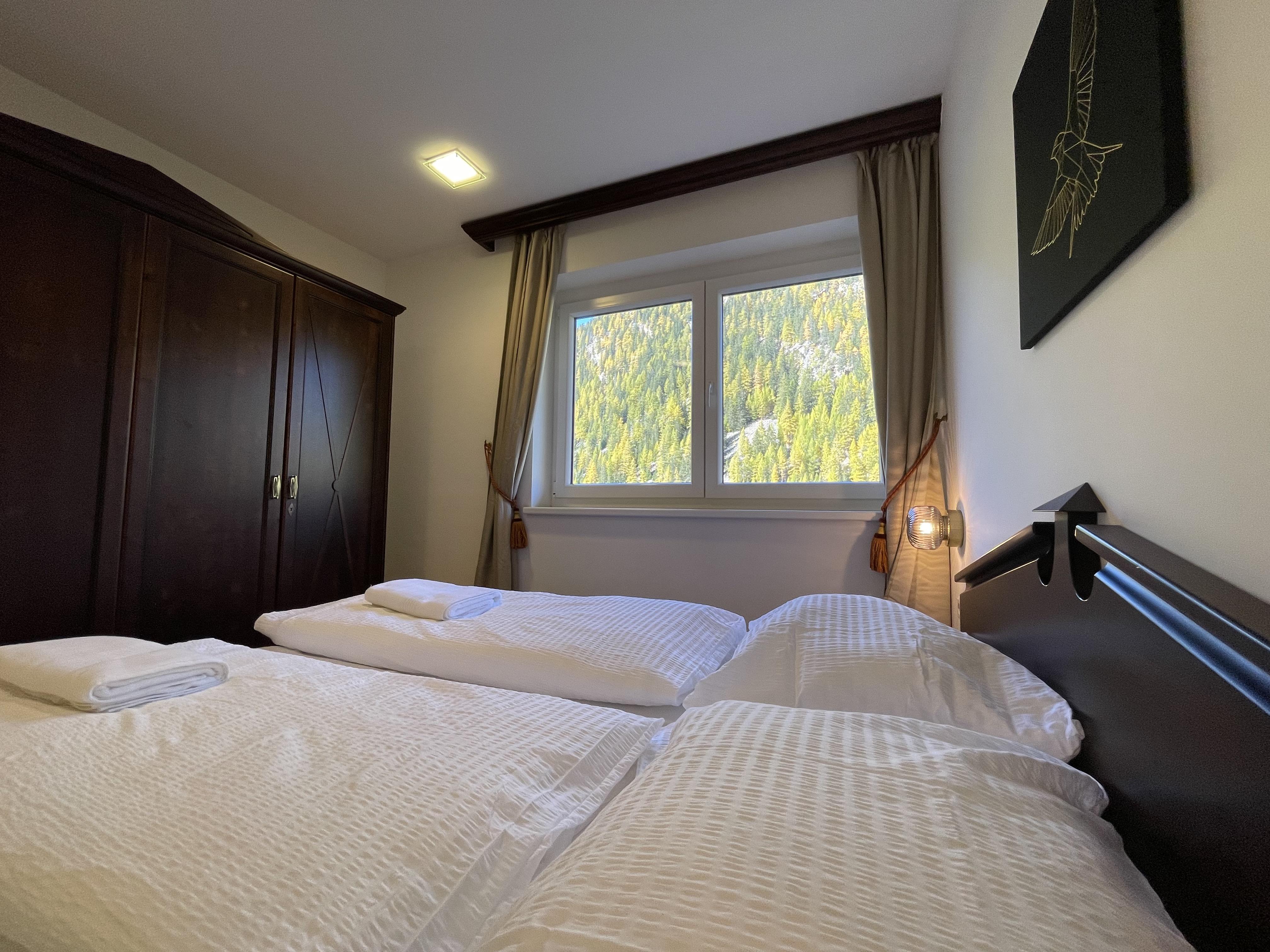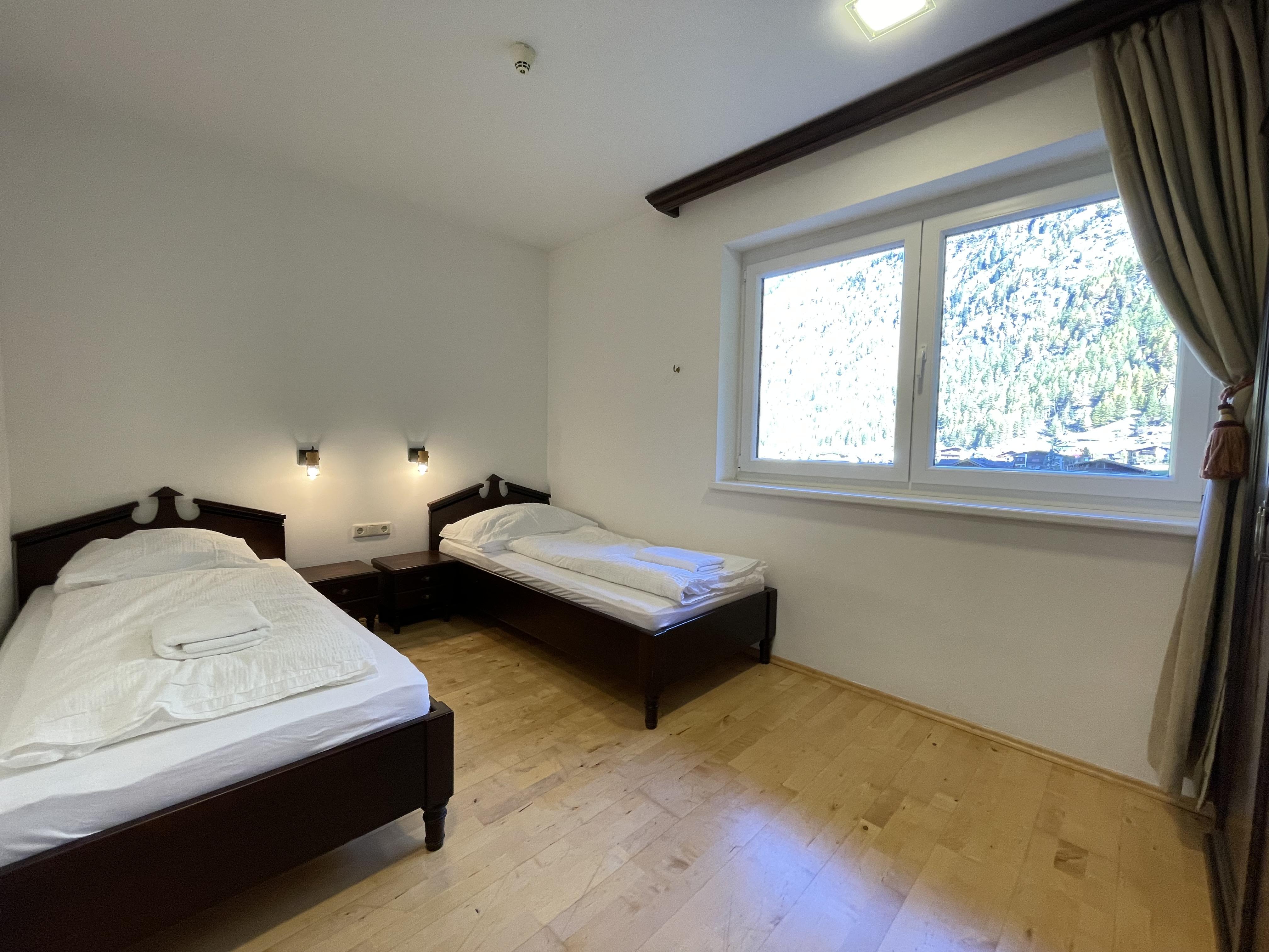 Das Superior Apartment (ZW11) mit ca. 53 m². Es umfasst ein Doppelzimmer, ein Zweibettzimmer, eine voll ausgestattete Wohnküche (2-Platten-Elektroherd, Wasserkocher, Kühlschrank, Geschirrspüler, Nespresso-Kaffeemaschine uvm.) mit einem Schlafsofa für zwei Personen sowie zwei Badezimmer (Dusche bzw. Badewanne) und ein separates WC. Das einzigartige Bergpanorama kann auf dem möblierten Balkon genossen werden.