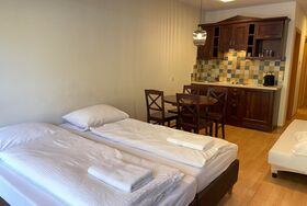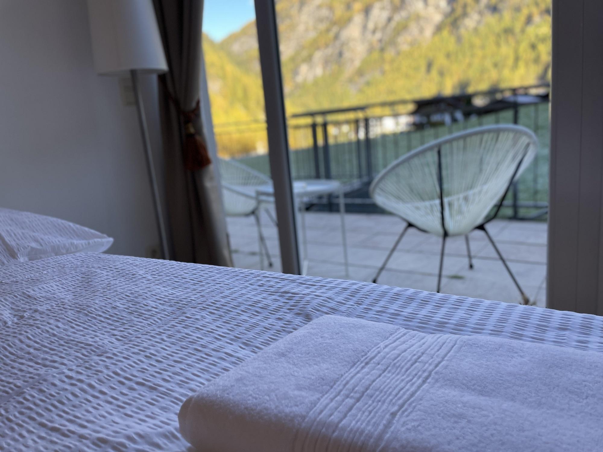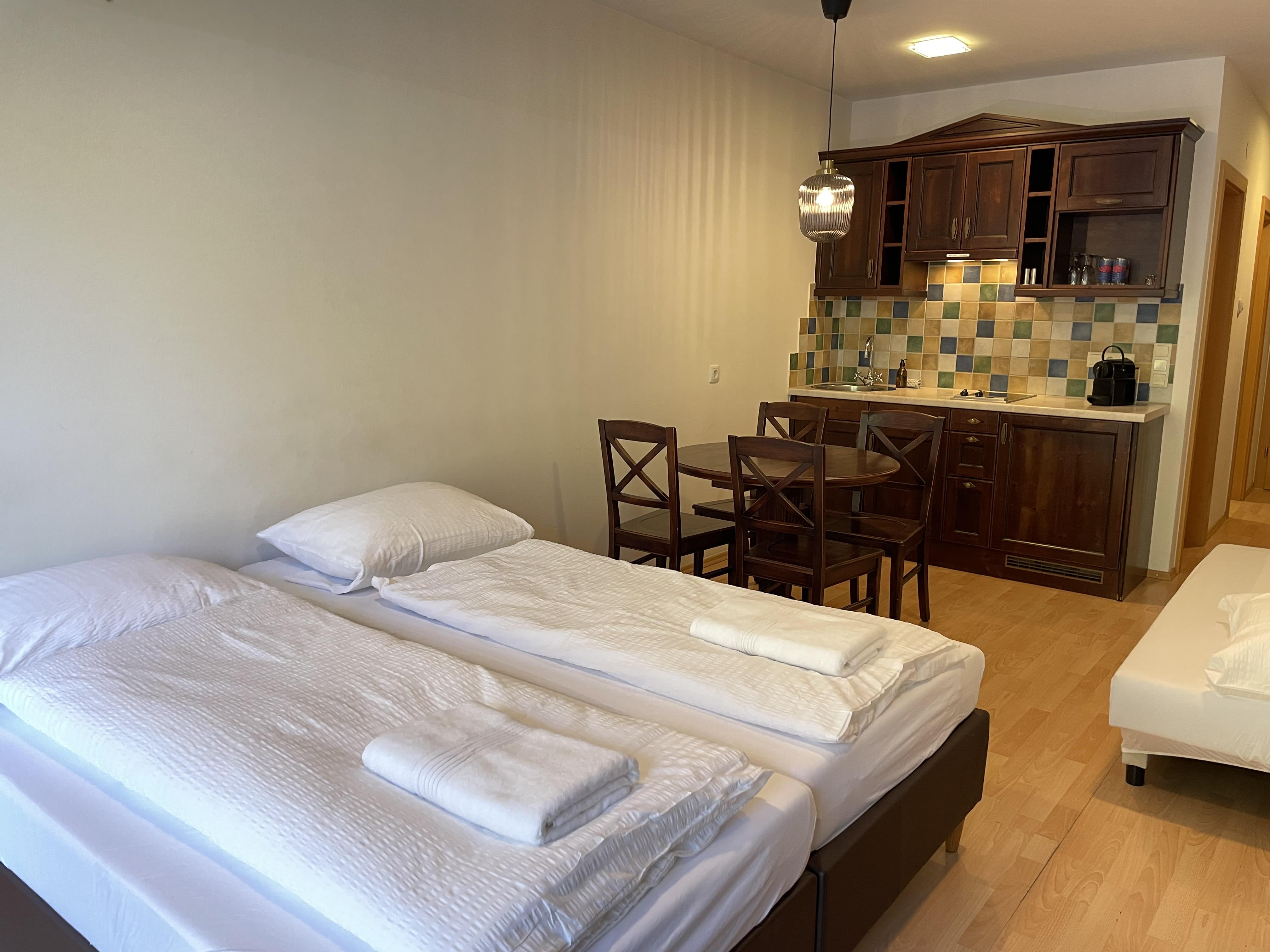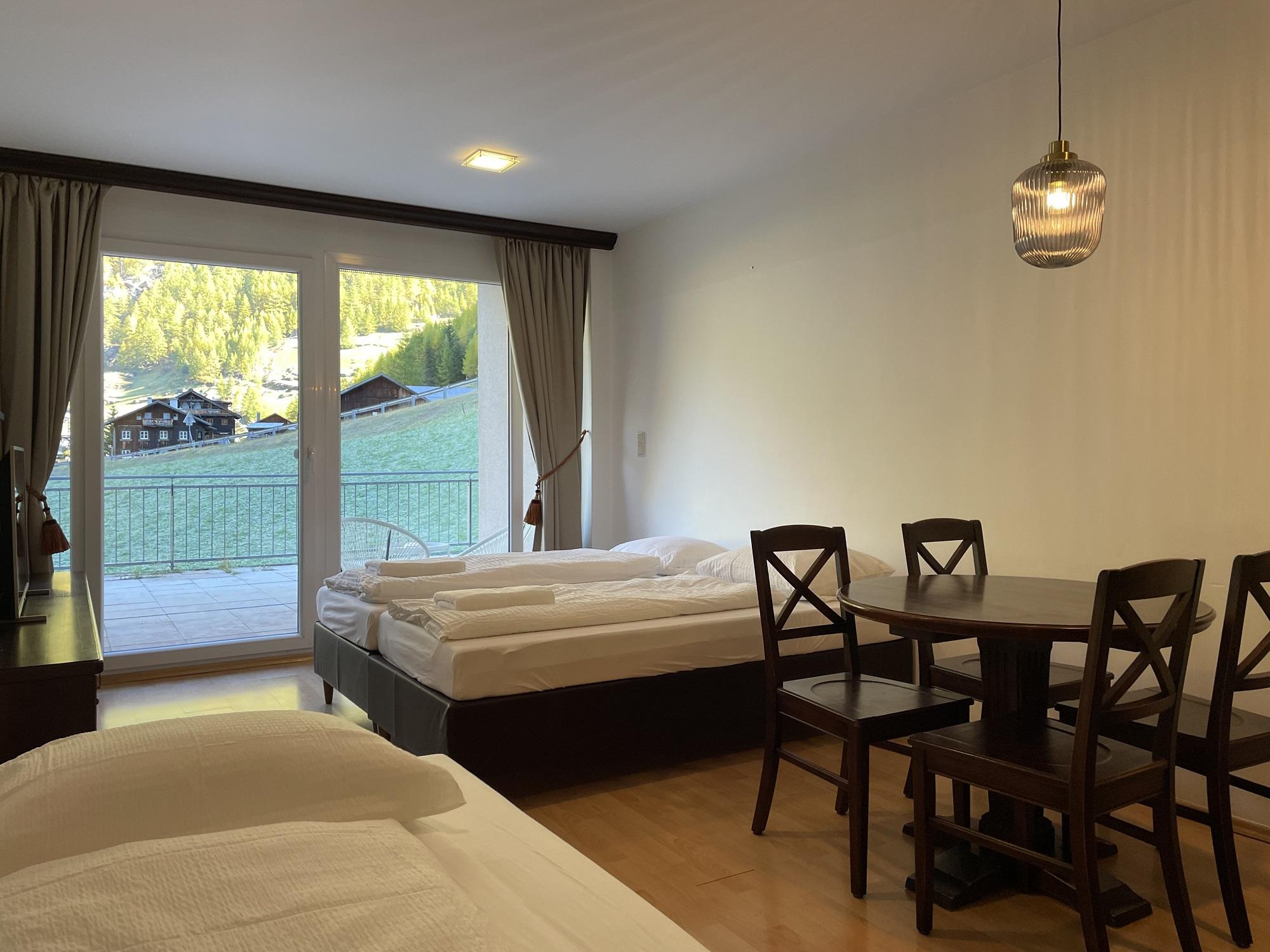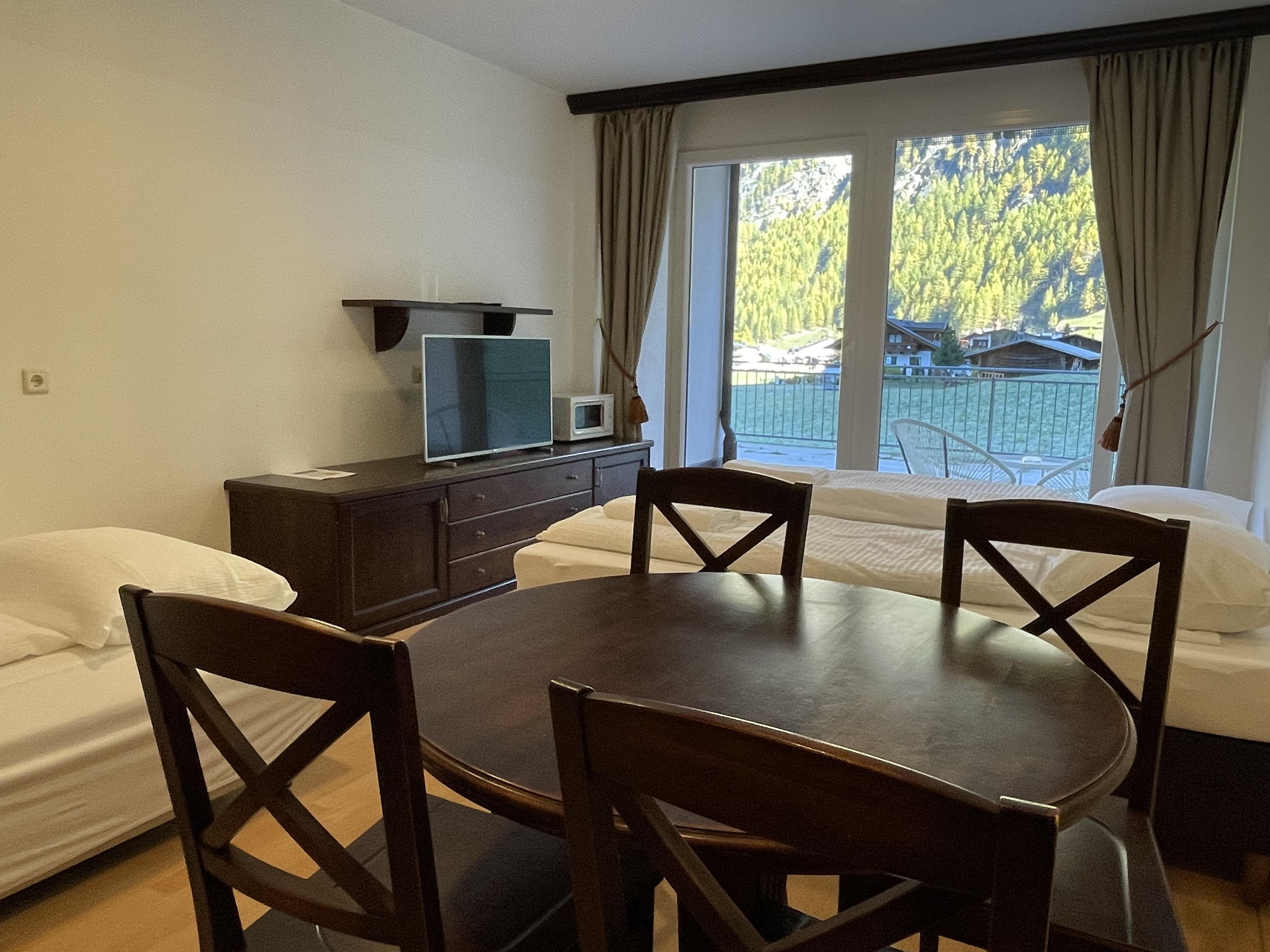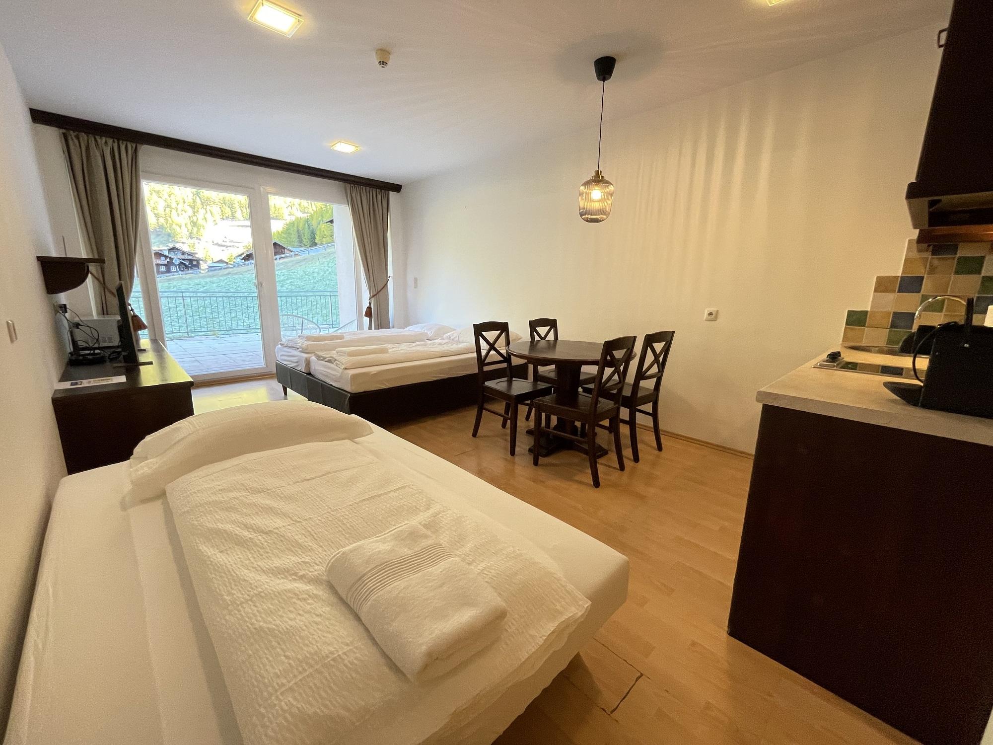 Das Studio (ZW 3) mit ca. 32 m² besteht aus einem Doppelbett, einer vollausgestatteten Wohnküche (2 Platten Elektroherd, Wasserkocher, Kühlschrank, Nespresso Kaffeemaschine, uvm.) mit einem Schlafsofa für eine Person, 1 Badezimmer mit Dusche und WC. Das einzigartige Bergpanorama kann auf der möblierten Terrasse genossen werden.