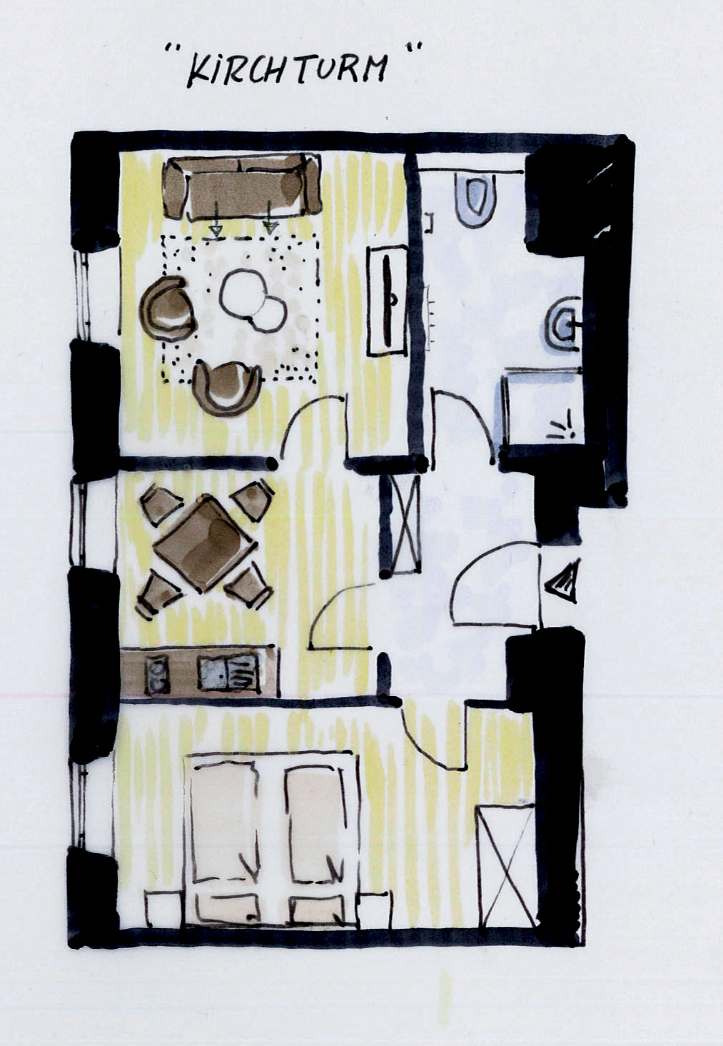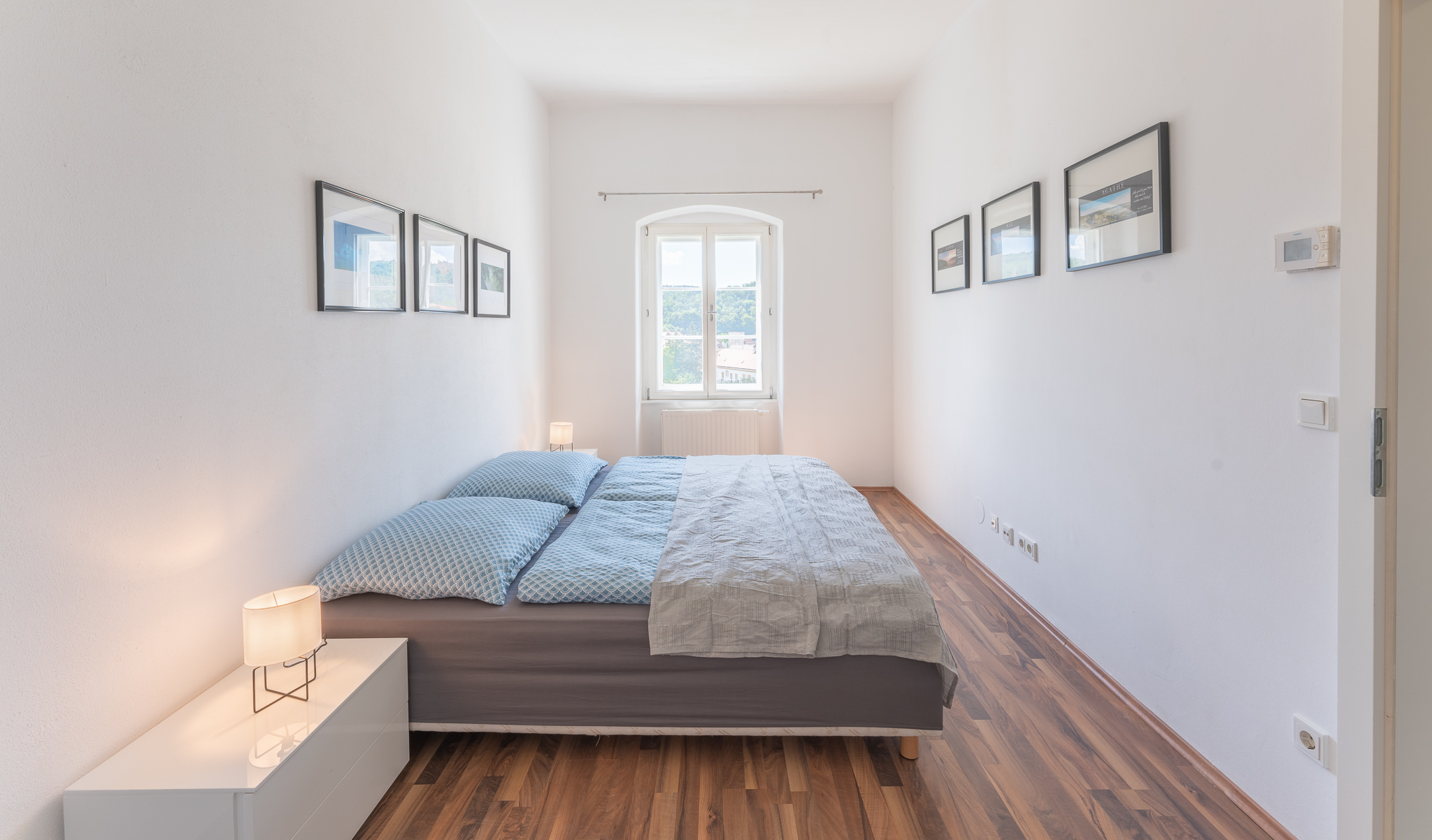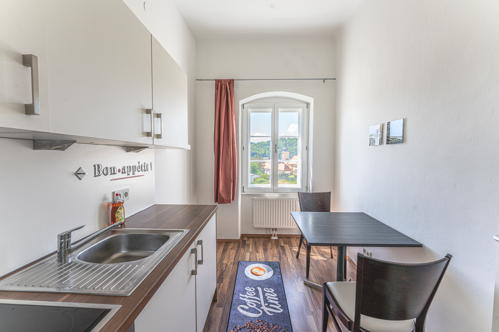 Unsere großzügigen Apartments in Einzel- und Doppelbelegung vermitteln das gewisse Extra, wie in diesem Apartment ein extra schöner Ausblick auf unserem Kirchturm, sowie unseren Hauptplatz. Auf rund 47 m² befindet sich ein eigener Wohnbereich mit ausziehbarem Schlafsofa und ein separates Schlafzimmer mit modernem Doppelbett. Die Küche ist mit einer Küchenzeile und einem Essbereich ausgestattet und auch im Vorraum und im Bad mit Dusche und WC ist großzügig Platz vorhanden. Großzügigkeit ist das Zauberwort, welches einen unbekannten Ort zum Schlafen und zu einem wohltuenden Urlaubszuhause macht. Fühlen Sie sich wohl bei uns.