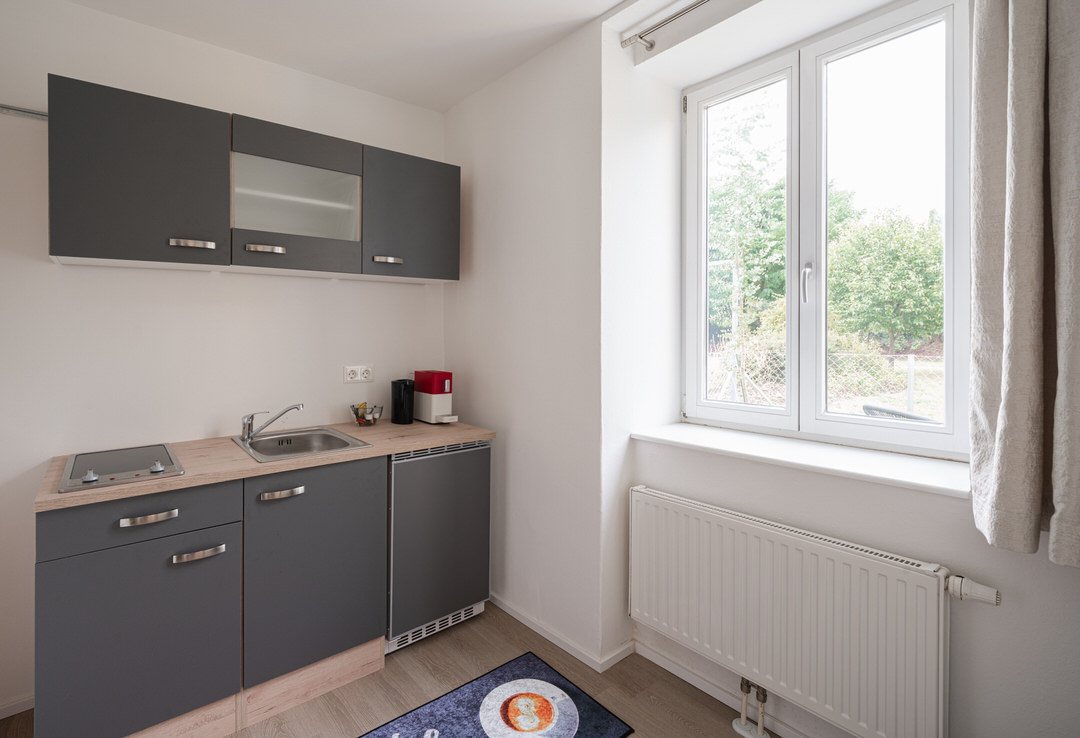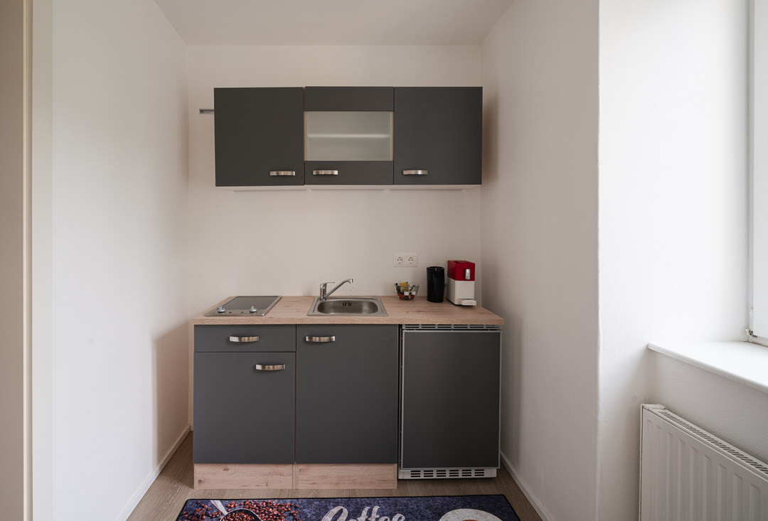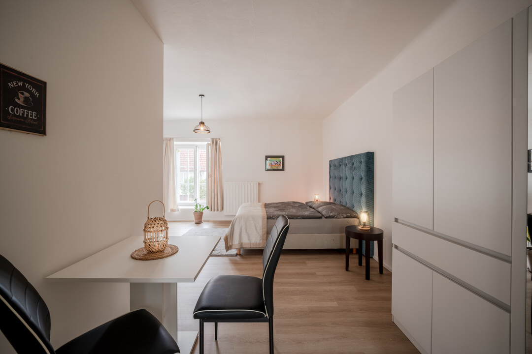 Das Wohn- Schlafzimmer mit modernem Polsterbett und gemütlicher Wohnsitzlounge bietet Ihnen ein angenehmes Urlaubsgefühl. Die Küchenzeile beinhaltet eine Grundausstattung an allen Annehmlichkeiten und auch das Badezimmer mit Dusche und WC großzügig Platz.