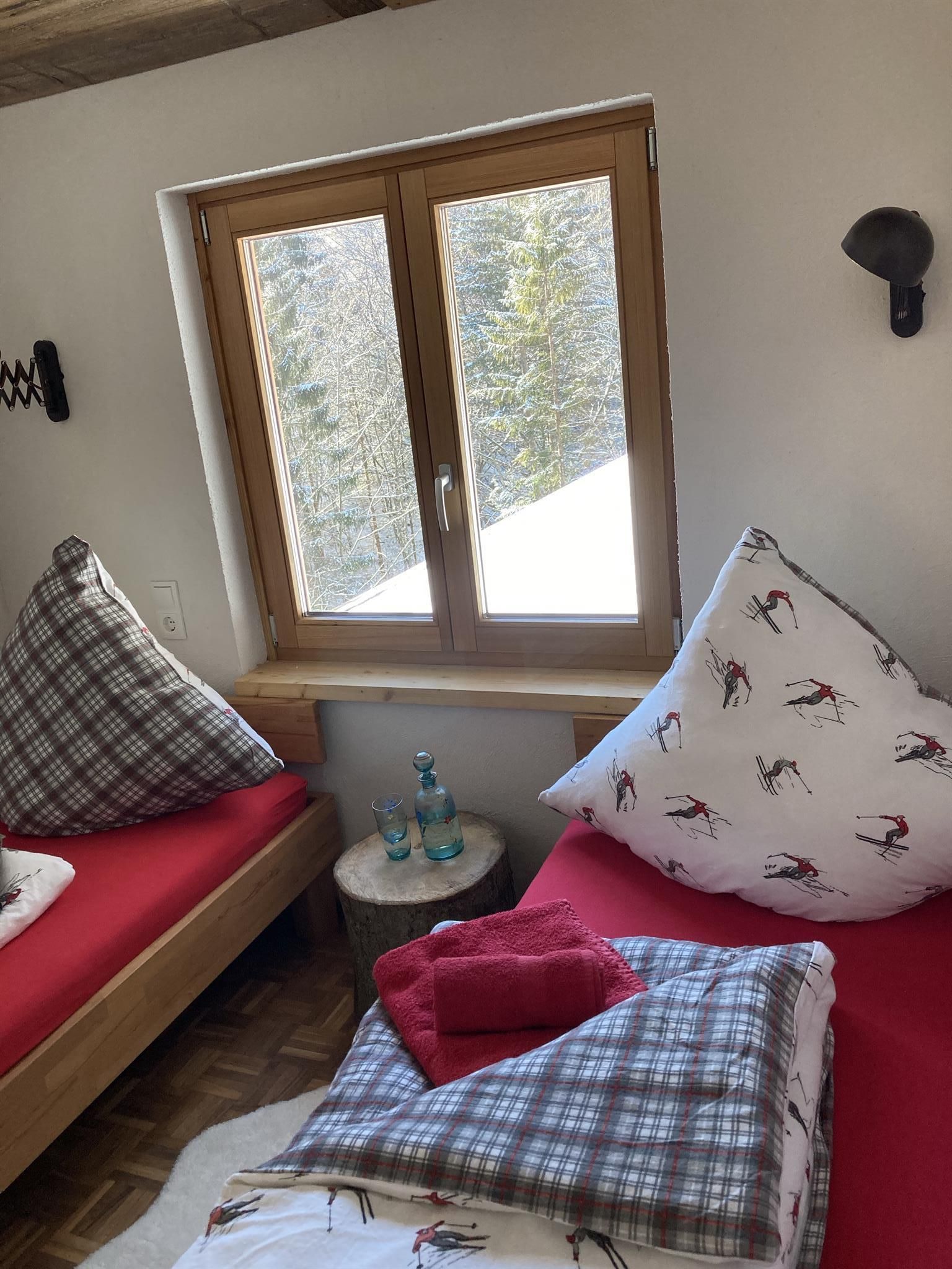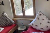 Das große Sitzfenster mit fantastischem Blick in die Bergwelt, lädt zum Verweilen ein. Der Schwedenofen im Wohnraum, trägt zu einem klassischen Hüttenurlaub in den Bergen bei.