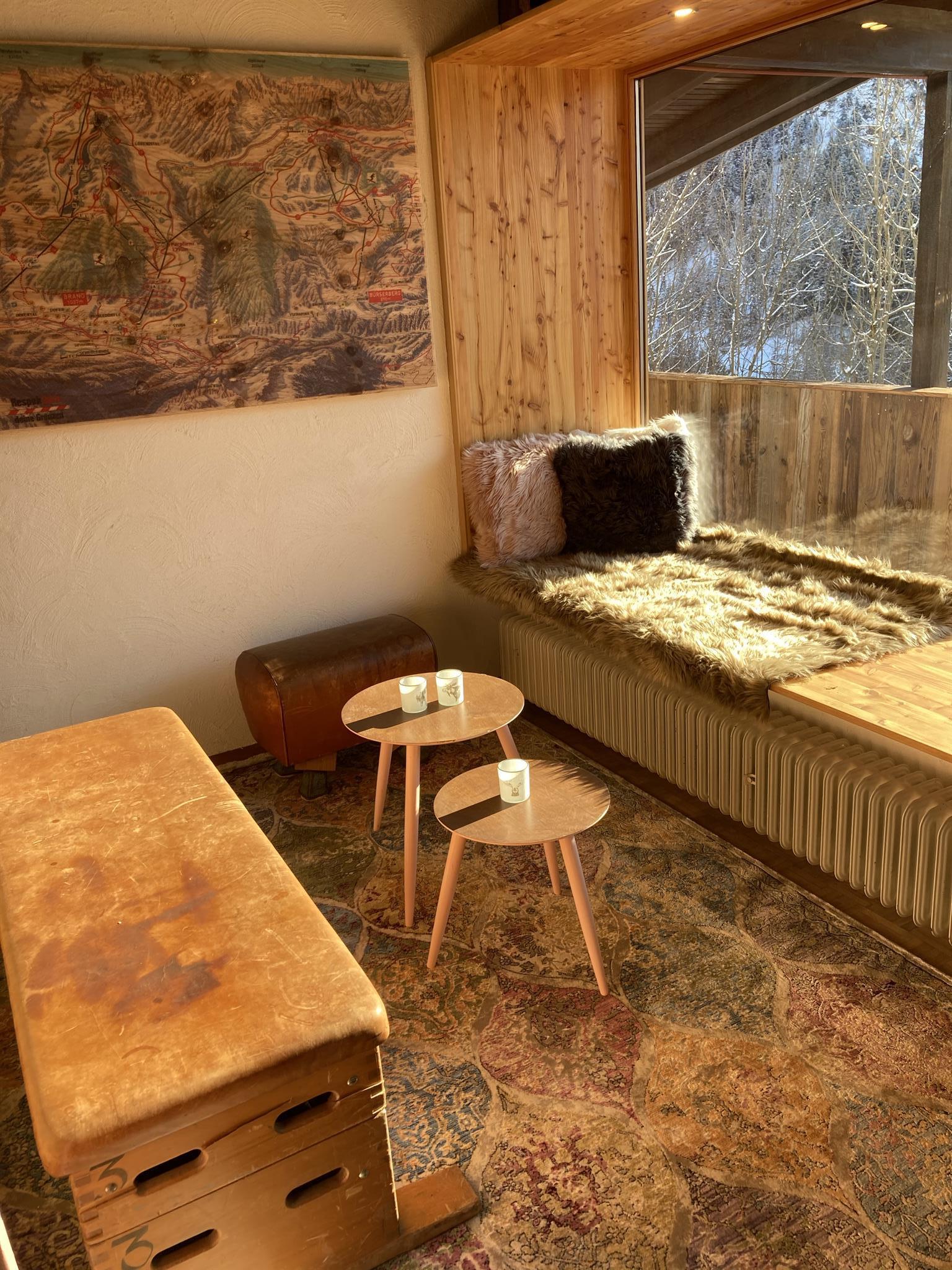Das große Sitzfenster mit fantastischem Blick in die Bergwelt lädt zum Verweilen ein. Der Schwedenofen in der Wohnung trägt zu einem klassischen Hüttenurlaub in den Bergen bei.
